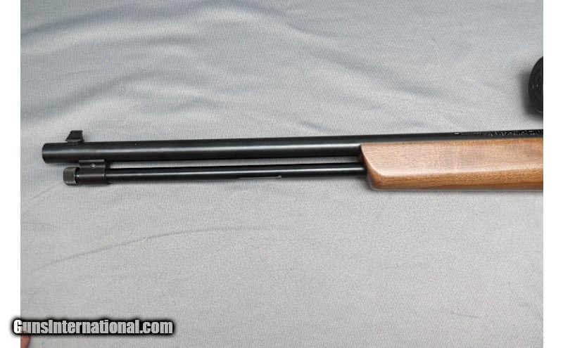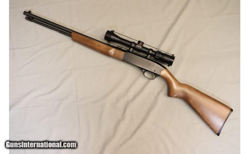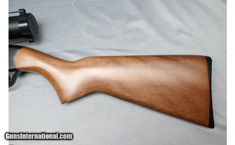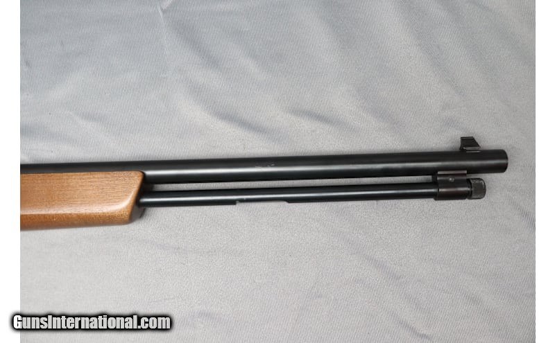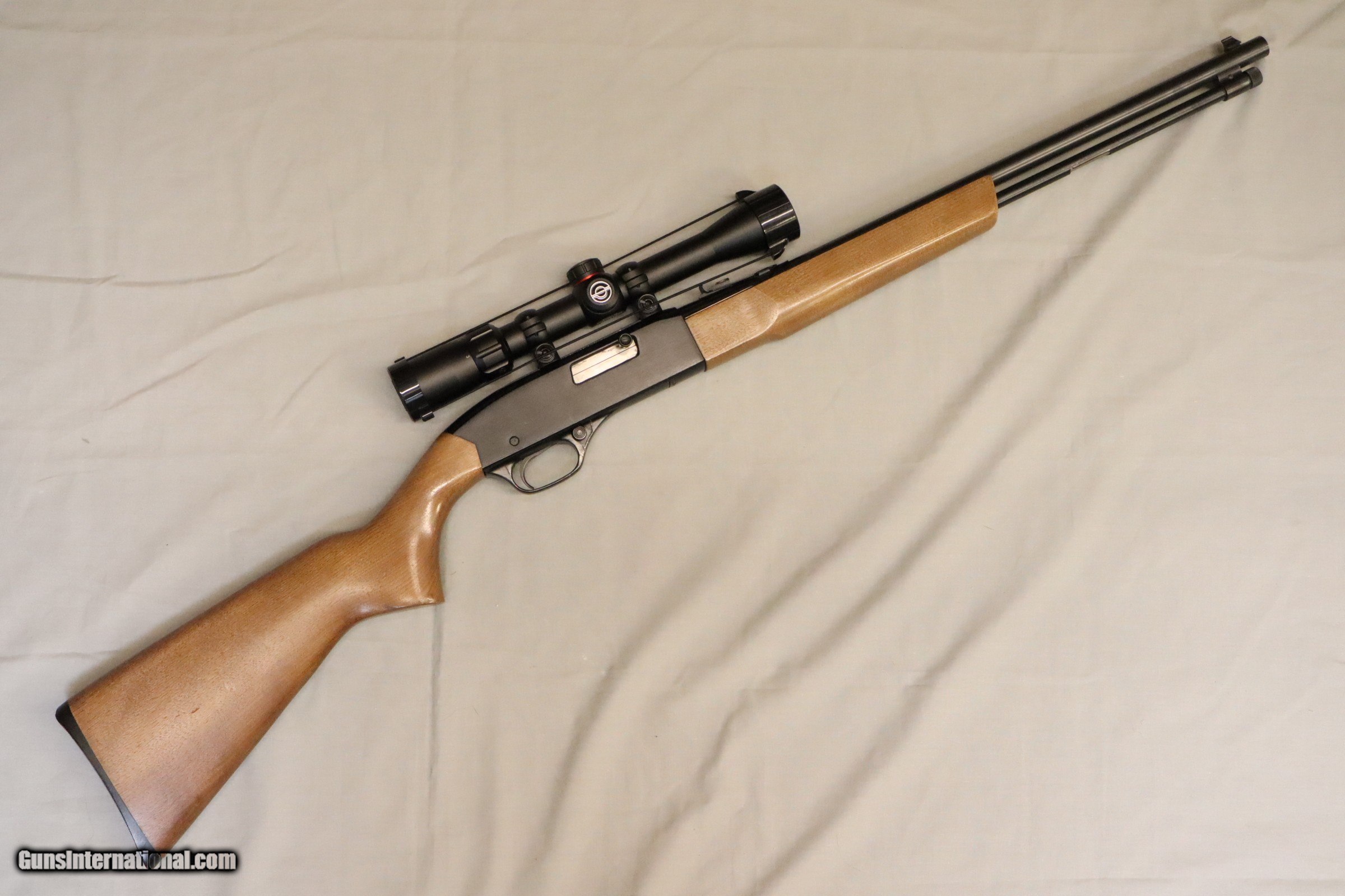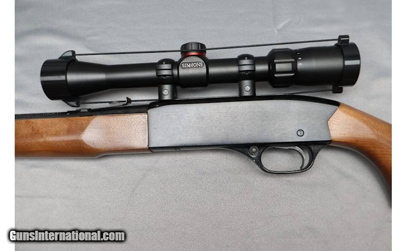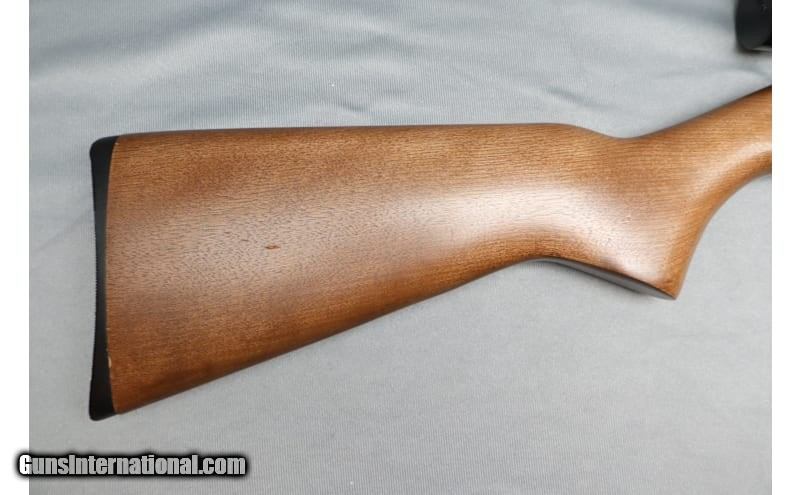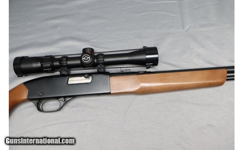 This Winchester 190 is a right handed, semiautomatic rifle chambered in .22 Long Rifle. It has dents and scratches on its stock. .22 Long Rifle