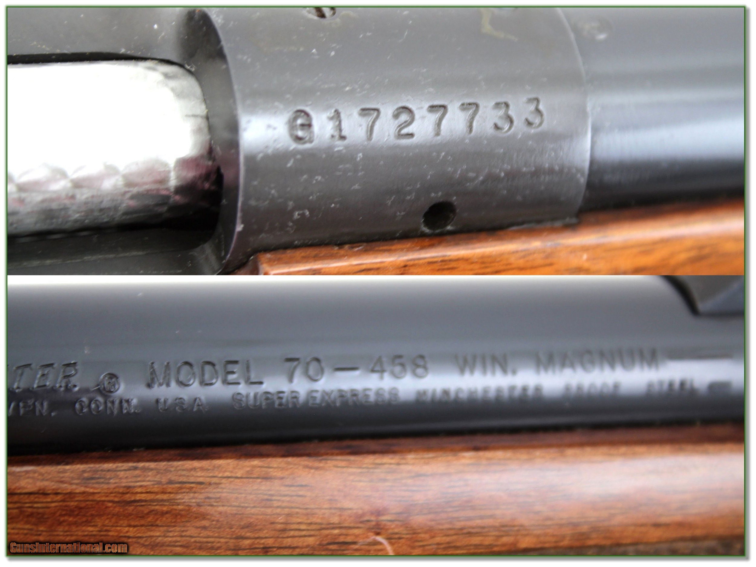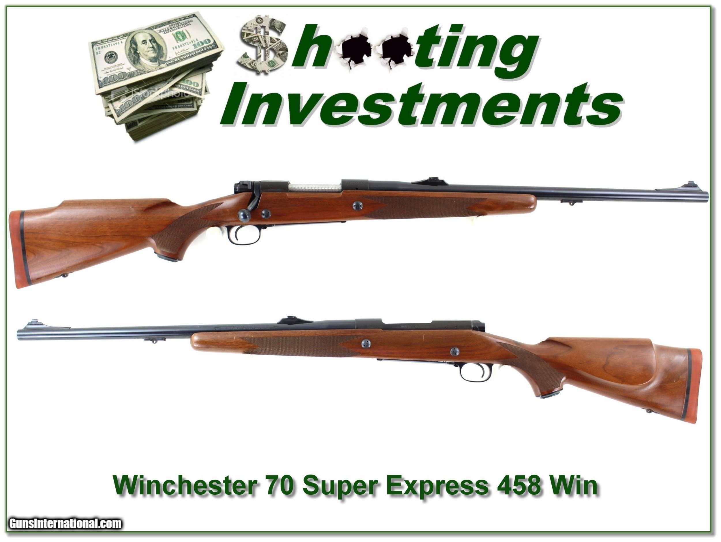 Description: This in a beautiful Winchester 70 Super Express in the hard-hitting 458 Winchester Magnum. These were called Super Express and are like a Super Grade! This one has a 22in heavy barrel with barrel mount sling attachment. The LOP over factor pad is 13.5in. The blue is excellent with no marks. And I only find a few minor marks on the wood. From the bolt and follower jeweling I’m sure only a few rounds fired. This will make a classic Dangerous Game hunting gun and they just don’t make them like they use too! Shipping and insurance is $39. Please email me with any questions or larger pictures. (Consign your quality firearms with Shooting Investments for only 12%! Let me know if you have any you would like to sell!) 20-0922 Payment: Payment is by Money Order, Cashiers Check or Personal Check. I can now also accept Credit Cards (MasterCard, Visa, Discover & American Express) with a 3% convenience fee. Shipping: The shipping charge will be listed in each description. It is $39 for most firearms. Some heavy guns or those insured for over $2000 will be higher. Shipments to Alaska and Hawaii are higher because air shipment is required. Most firearms are shipped on Tuesday and Thursday and usually in 5 days of receipt of payment. We package all shipments carefully and insure them. Optics are shipped Priority Mail and most other non-firearm shipments are shipped First Class. Returns: Our return policy is simple. If for any reason you are not pleased with your purchase, you may return your item for a full refund of purchase price. Ammunition cannot be returned. It is important to us that you are happy. Guns cannot be fired or dissembled before returning them and they must be returned in the same condition as received. Notification of a return must occur with-in 3 days of receipt at your dealer. Shipping, convenience and dealer fees are not refundable and are the responsibility of the buyer. Lay-a-way: If needed, we offer a 60 day lay-a-way option on most firearms. It is 1/3 now, 1/3 in 30 days and 1/3 in 60 days. Lay-a-way firearm sales are final and if not completed the first payment cannot be returned. Consigning your firearms with Shooting Investments: We will help you get top dollar for your firearms. While most local guns shops charge 20% or more, our fee is only 12% with a minimum of $75. At your local gun shop it might take months to sell. Selling on-line provides instant access to thousands of interested buyers. You won’t find any other on-line dealer willing to sell your firearms for only 12% or listing every gun on 3 separate s. Selling through an House typically costs the seller 15% and the buyer an addition 15% (so 30%) and you have to wait several months to sell and longer to receive funds. If properly priced, we will sell your firearms in a few weeks. Send us an email or give us a call and we’ll explain how easy it is for you to get top dollar. Trading: Trading for use is really just buying your gun to re-sell. If you have a gun you want to trade, please email a picture and we will let you know what we can give or it. You will always get more if we sell it for you on consignment. Help for California Buyers: We are happy to ship to California. It is the buyer’s responsibility to make sure any item you buy is legal in your state. We are also happy to help with your purchase of a firearm from someone other than us. If you see a gun you would like to buy but the seller can’t or won’t ship to California they can ship to use and we’ll then ship it to your California dealer. The cost for this service is only $30 + shipping. Let us know if we can help! SOLD |