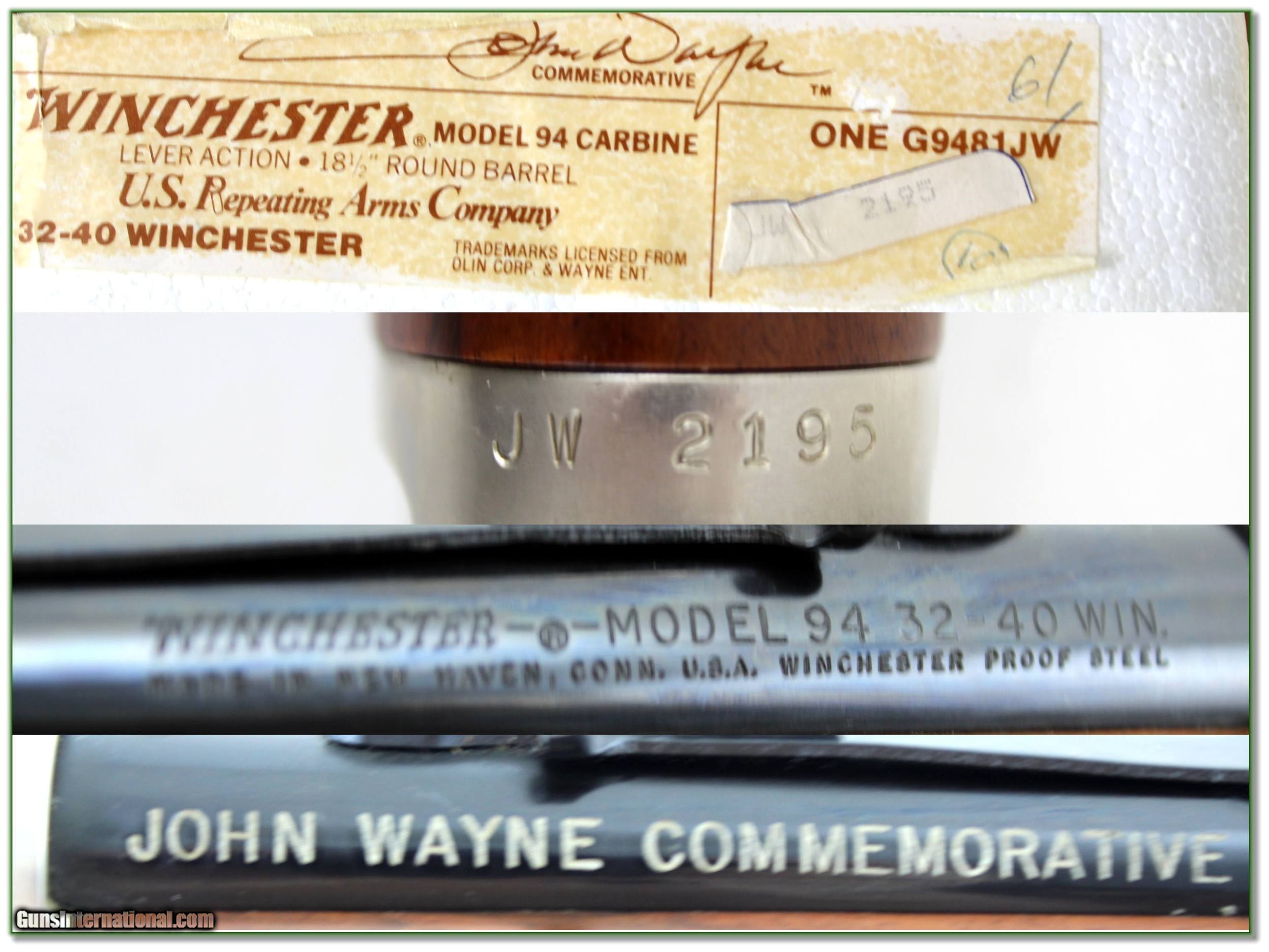 Description: This is a new unfired Winchester John Wayne commemorative 94 in 32-40 Win. It has beautiful wood (much nicer than most) and comes as seen in original box with papers. Shipping with insurance is $39. Please email me with any questions or larger pictures. (Consign your quality firearms with Shooting Investments for only 12%! Let me know if you have any you would like to sell!) 20-0056 Payment: Payment is by Money Order, Cashiers Check or Personal Check. I can now also accept Credit Cards (MasterCard, Visa, Discover & American Express) with a 3% convenience fee. Shipping: The shipping charge will be listed in each description. It is $39 for most firearms. Some heavy guns or those insured for over $2000 will be higher. Shipments to Alaska and Hawaii are higher because air shipment is required. Most firearms are shipped on Tuesday and Thursday and usually in 5 days of receipt of payment. We package all shipments carefully and insure them. Optics are shipped Priority Mail and most other non-firearm shipments are shipped First Class. Returns: Our return policy is simple. If for any reason you are not pleased with your purchase, you may return your item for a full refund of purchase price. Ammunition cannot be returned. It is important to us that you are happy. Guns cannot be fired or dissembled before returning them and they must be returned in the same condition as received. Notification of a return must occur with-in 3 days of receipt at your dealer. Shipping, convenience and dealer fees are not refundable and are the responsibility of the buyer. Lay-a-way: If needed, we offer a 60 day lay-a-way option on most firearms. It is 1/3 now, 1/3 in 30 days and 1/3 in 60 days. Lay-a-way firearm sales are final and if not completed the first payment cannot be returned. Consigning your firearms with Shooting Investments: We will help you get top dollar for your firearms. While most local guns shops charge 20% or more, our fee is only 12% with a minimum of $75. At your local gun shop it might take months to sell. Selling on-line provides instant access to thousands of interested buyers. You won’t find any other on-line dealer willing to sell your firearms for only 12% or listing every gun on 3 separate s. Selling through an House typically costs the seller 15% and the buyer an addition 15% (so 30%) and you have to wait several months to sell and longer to receive funds. If properly priced, we will sell your firearms in a few weeks. Send us an email or give us a call and we’ll explain how easy it is for you to get top dollar. Trading: Trading for use is really just buying your gun to re-sell. If you have a gun you want to trade, please email a picture and we will let you know what we can give or it. You will always get more if we sell it for you on consignment. Help for California Buyers: We are happy to ship to California. It is the buyer’s responsibility to make sure any item you buy is legal in your state. We are also happy to help with your purchase of a firearm from someone other than us. If you see a gun you would like to buy but the seller can’t or won’t ship to California they can ship to use and we’ll then ship it to your California dealer. The cost for this service is only $30 + shipping. Let us know if we can help! SOLD |