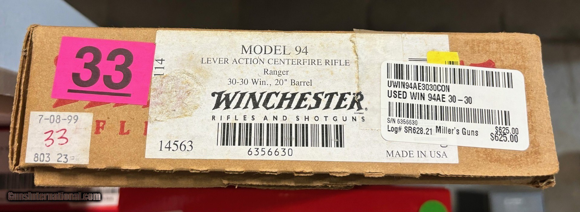 Description: USED Winchester 94 Ranger Lever action .30-30 Winchester Cross bolt safety 6 round capacity SOLD Rifle Caliber: .30-30 Winchester Manufacturer: Winchester Model: 94 Serial Number: 6356630 Condition: Very Good |