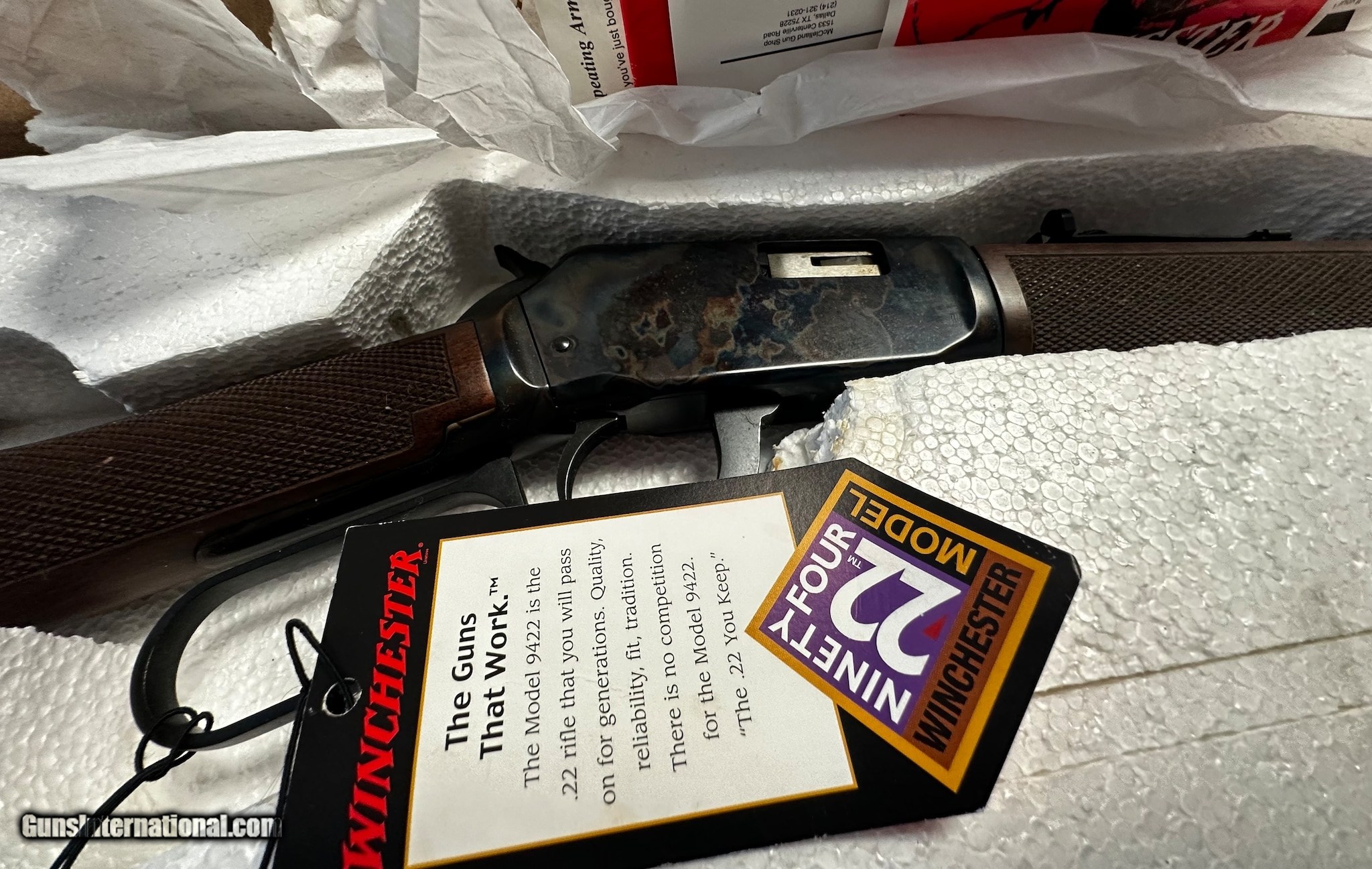 Description: Guns Listing ID: 1069966 Factory box, Case hardened, factory tags still attached. Limited edition only 501 made of these. Made for CDNN sports from Abilene, TX. SOLD Manufacturer: WINCHESTER Model: 9422M Caliber Info: .22 WMR Condition: Used - Non-Certified Barrels: 16 BARREL Finish: BLUED |