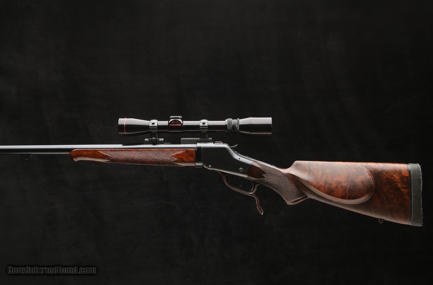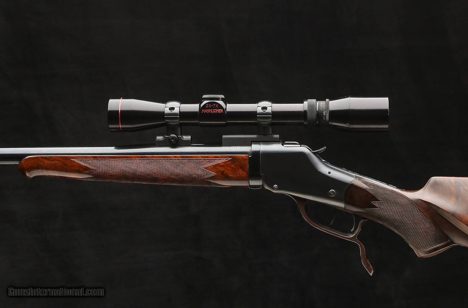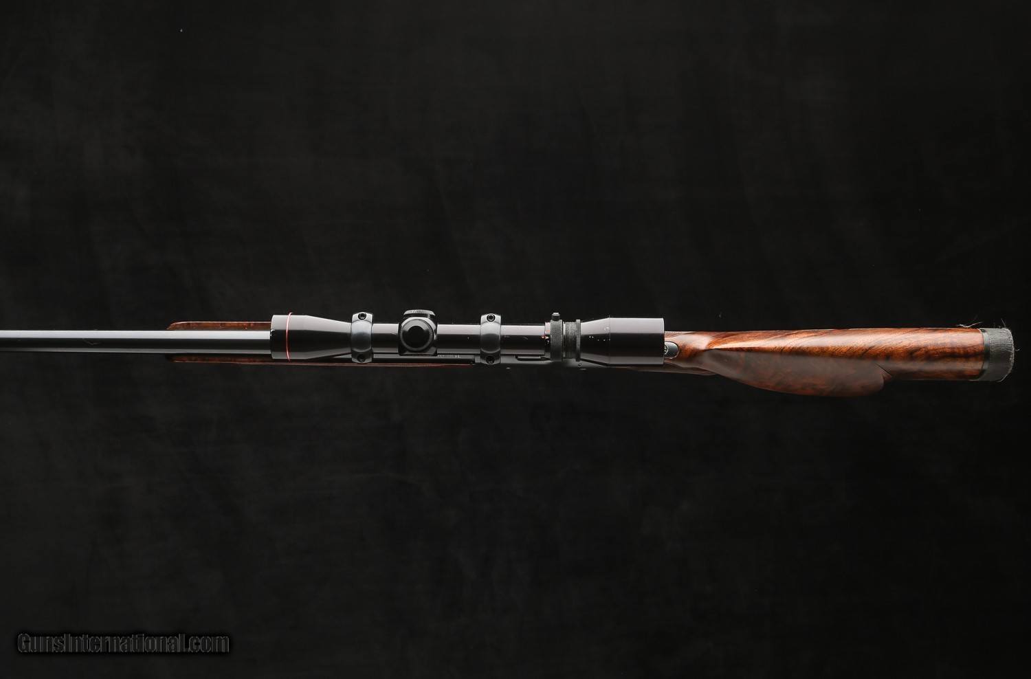 Description: Winchester High Wall takedown rifle chambered in .300 H&H Flanged. The rifle features a custom stock crafted from a fancy piece of Claro walnut, fitted with a shadow-line cheekpiece. It is equipped with a one-inch black recoil pad, which shows some deterioration. This takedown model exhibits a handsome checkering pattern with a schunched fore-end, along with an inletted rear sling swivel and an integral (sweated-on) barrel swivel. Optics consist of a Manlicher 2–7x scope, mounted on custom bases with Leupold one-inch rings. Price: $2,995.00 Contact Seller |
