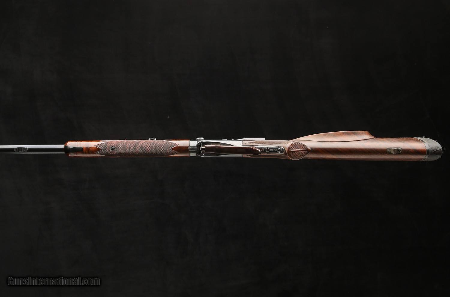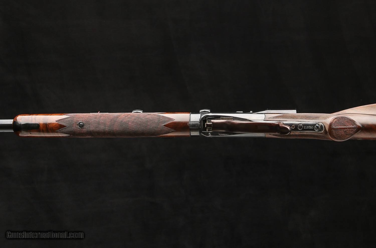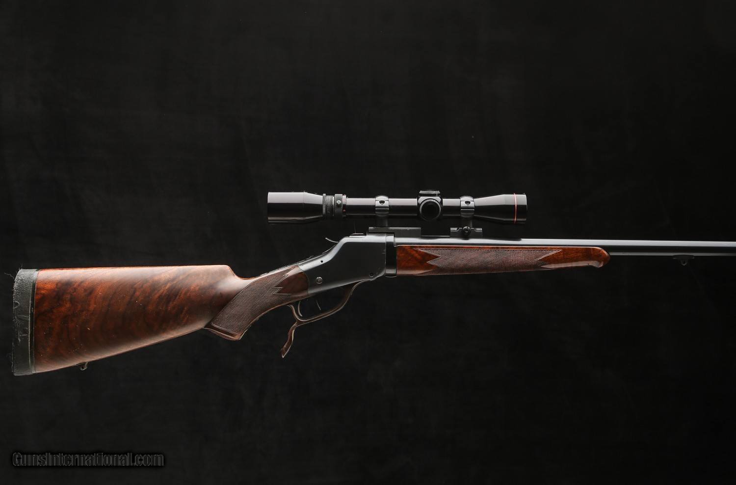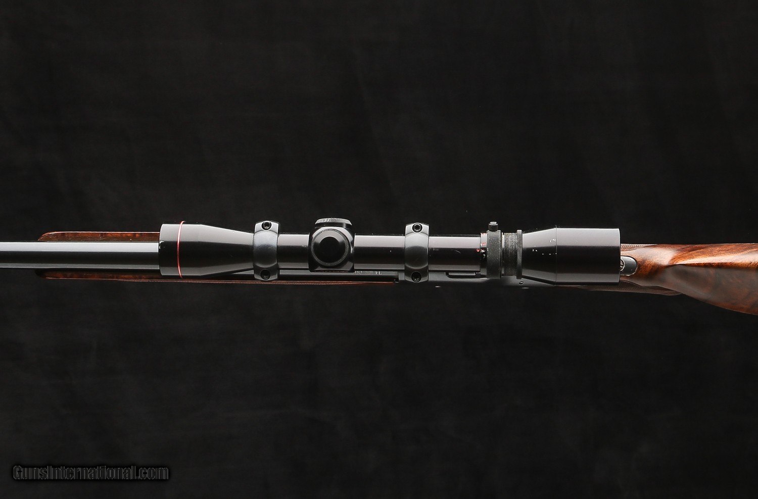 Description: Winchester High Wall takedown rifle chambered in .300 H&H Flanged. The rifle features a custom stock crafted from a fancy piece of Claro walnut, fitted with a shadow-line cheekpiece. It is equipped with a one-inch black recoil pad, which shows some deterioration. This takedown model exhibits a handsome checkering pattern with a schunched fore-end, along with an inletted rear sling swivel and an integral (sweated-on) barrel swivel. Optics consist of a Manlicher 2–7x scope, mounted on custom bases with Leupold one-inch rings. Price: $2,995.00 Contact Seller |