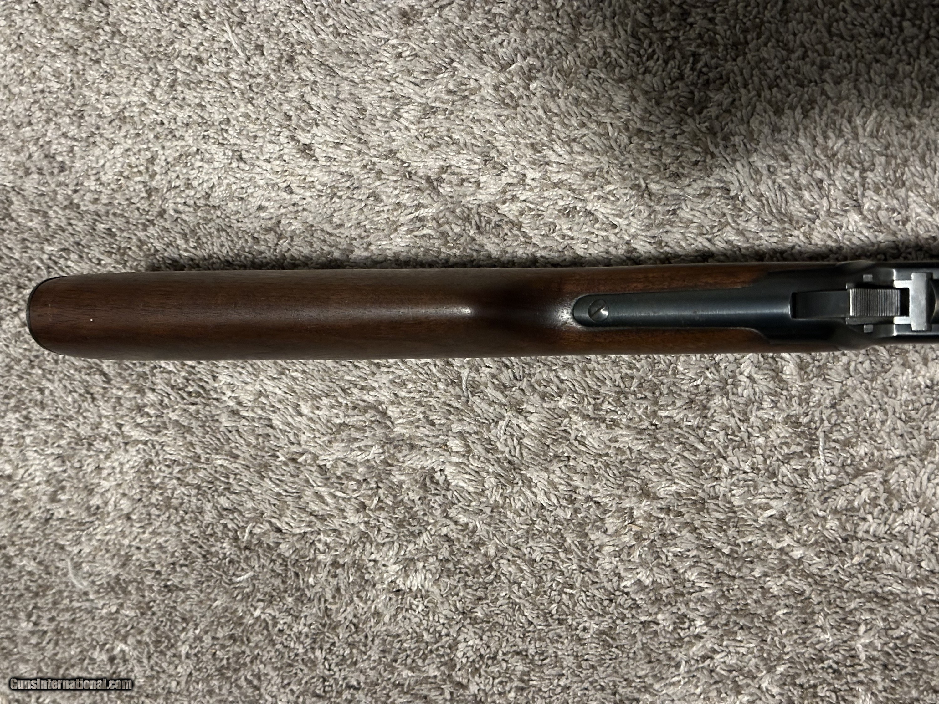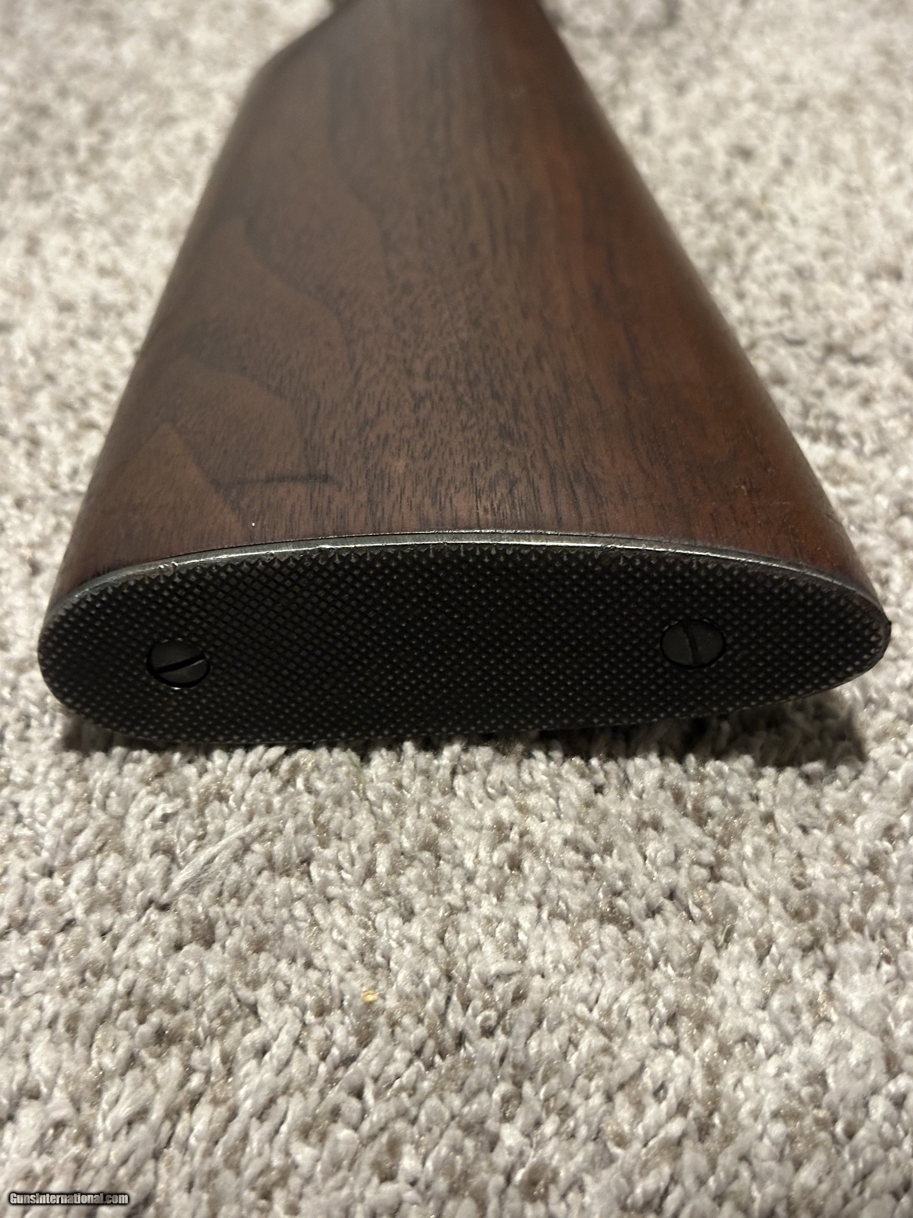 Description: VERY FINE WINCHESTER MODEL ‘94 CARBINE, #1846XXX, MADE 1952. Retains about all the blue on the barrel and magazine with even the barrel bands showing excellent blue. The receiver also shows bright blue with only minor edge/handling wear with about all the blue on the upper tang, bolt, loading gate etc. Fine blue on the lever. Generally excellent stock and forearm with correct checkered steel shotgun butt plate and tight wood to metal fit. Tight action, strong safety half-cock, bright excellent bore. Original buckhorn rear sight with elevator bar intact and front sight retains the original hood (these often missing). A really nice example that has been used very lightly and well taken care of. A nearly 74 year old solid walnut and blued steel '94 from the Harry Truman days. Rifle Caliber: .30-30 Winchester Manufacturer: Winchester Model: 1894 Serial Number: 1846315 Price: $1,295.00 Pay with