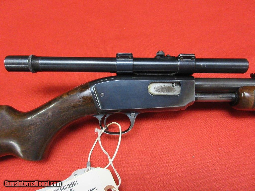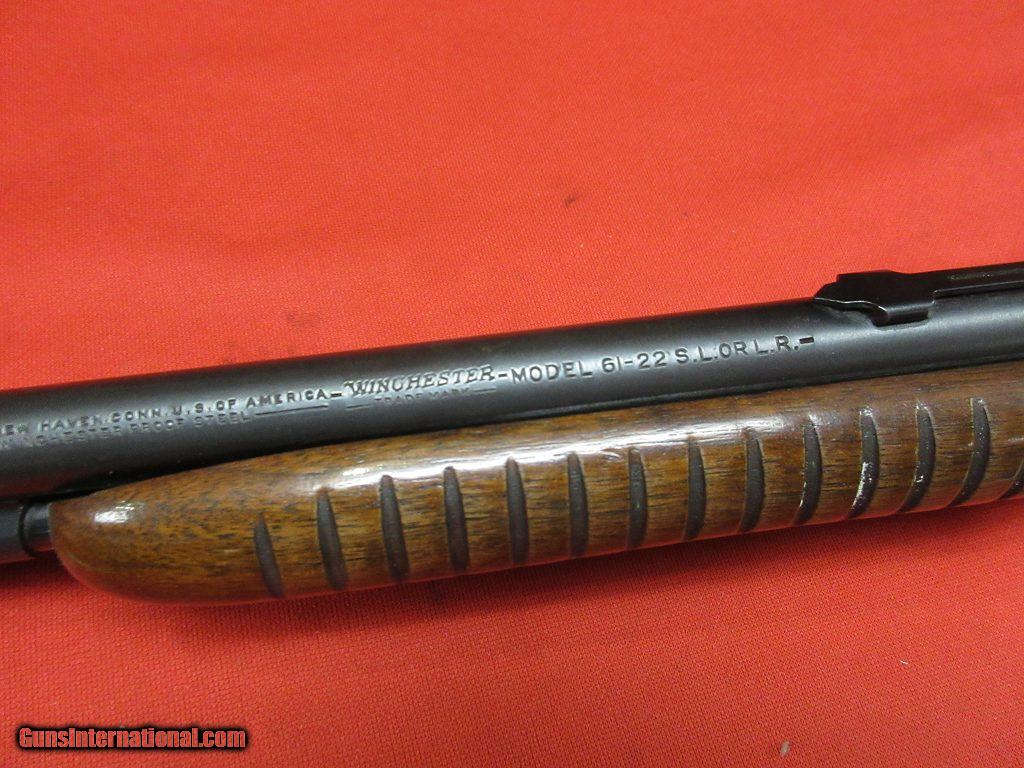 Description: Winchester Model 61 22LR 24" -- 0VERALL BLUE 80% WITH SIDE MOUNTED WEAVER SCOPE OF THE SAME VINTAGE AS THE RIFLE, WOOD IS SOLID AND BORE IS VERY GOOD SOLD |