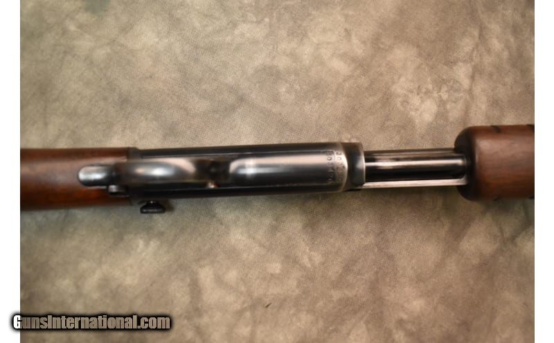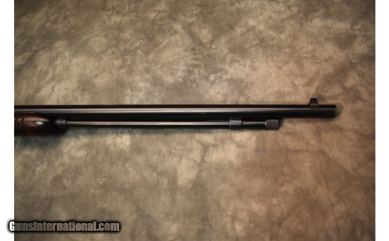 Description: The bluing on the barrel is worn on the top of the barrel and on the muzzle along with some wear and scratches on the top of the receiver. The magazine tube also has some of the bluing worn off due to use, but shows little to no signs of pitting. The front sight post has a silver bead to help you get a positive sight picture, but the rear notch is missing the elevator. Manufactured in 1938 .22 WMR SOLD Chambers: .22WMR Metal Condition: Fair Wood Condition: Fair Bore Condition: Bright Barrels: 24 inch Triggers: 3lb single stage Stock Dimensions: 13 1/2 LOP Fore End: Wood Butt Pad: plastic Weight: 6 lb 2oz Sights: Iron sights Item Location: Springfield, MO |