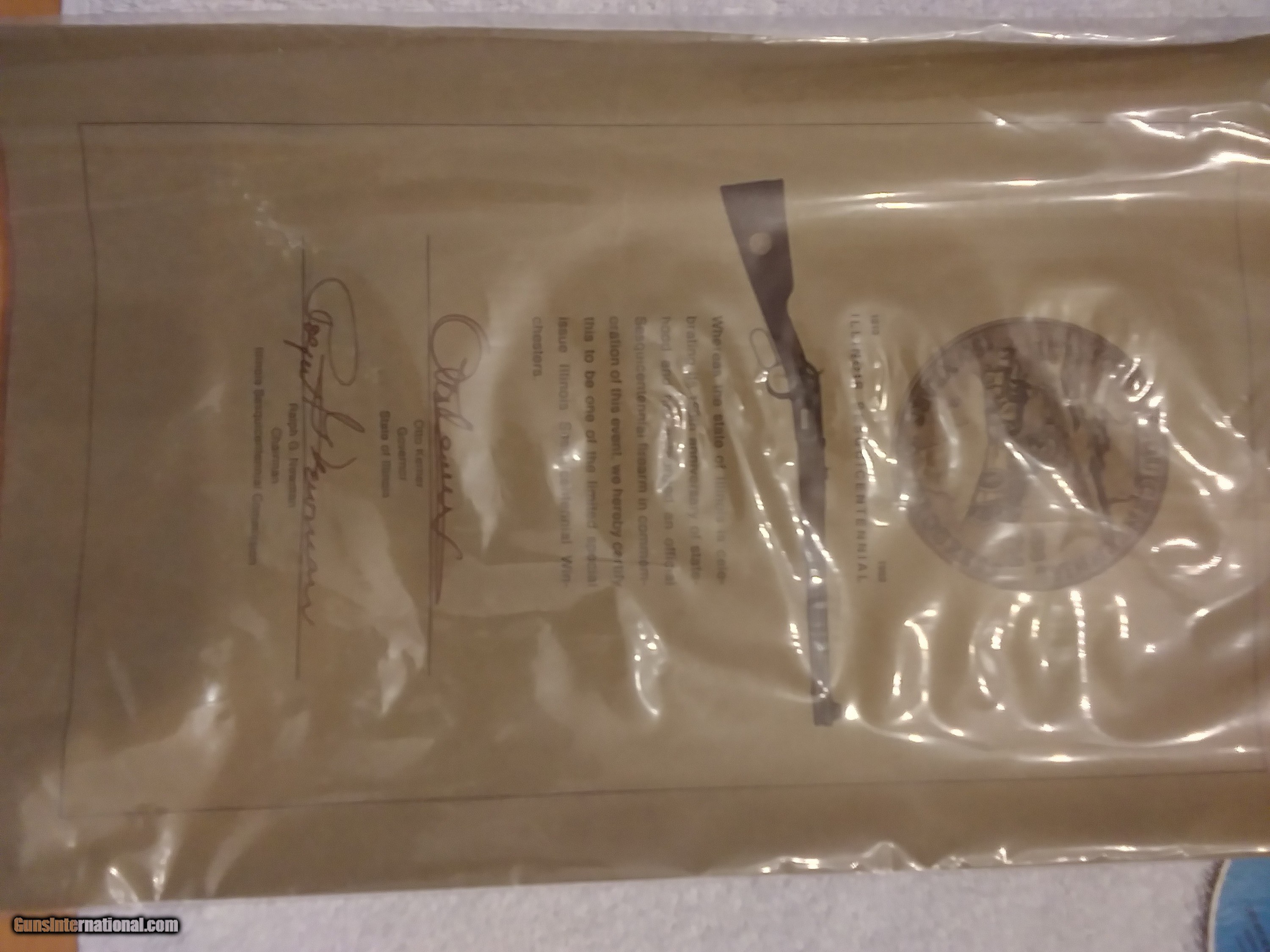 Description: Winchester model 94 Illinois Sesquicentennial 30-30 Carbine, 20 inch barrel. s/n IS882 New condition, never fired, original owner, original box and literature. No handling marks, or defects. Includes certificate of issue signed by Illinois governor 1968. Price includes shipping, have GunTab account. SOLD |