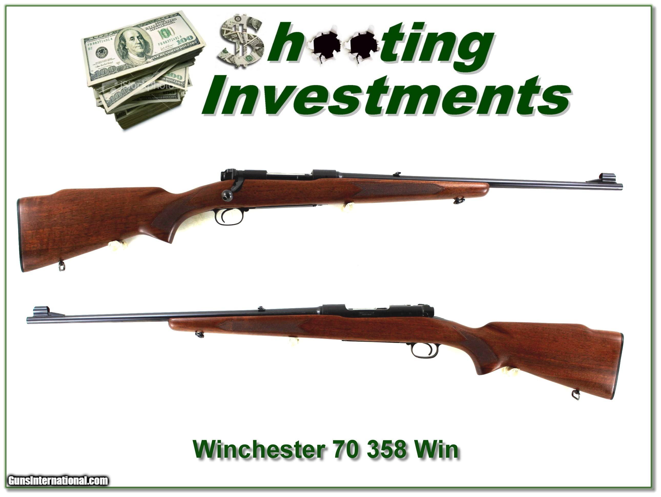 Description: Collectors, this is a RARE chance to own an all-original and near new condition 1953 made Winchester 70 Featherweight in the RARE 358 Winchester. The original blue on this one is about new. It has a 22in barrel and no scope ever mounted. From the bolt and face if fired, not more than a few rounds. The original wood has no marks I see. I’m not sure how you can find a nicer one! I am selling this one on consignment and as such lay-a-way can’t be used. It does of course have the standard 3-day inspection. Shipping and insurance is $99. Please email me with any questions or larger pictures. (Consign your quality firearms with Shooting Investments for only 12%! Let me know if you have any you would like to sell!) 24-0262 Payment: Payment is by Money Order, Cashier’s Check or Personal Check. I can now also accept Credit Cards (MasterCard, Visa, Discover & American Express) with a 3% convenience fee. Shipping: The shipping charge will be listed in each description. It is $49 for most firearms. Some heavy guns or those insured for over $2000 will be higher. Shipments to Alaska and Hawaii are higher because air shipment is required. Most firearms are shipped on Tuesday and Thursday and usually in 5 days of receipt of payment. We package all shipments carefully and insure them. Optics are shipped Priority Mail and most other non-firearm shipments are shipped First Class. Returns: Our return policy is simple. If for any reason you are not pleased with your purchase, you may return your item for a full refund of purchase price. Ammunition cannot be returned. It is important to us that you are happy. Guns cannot be fired or dissembled before returning them and they must be returned in the same condition as received. Notification of a return must occur within 3 days of receipt at your dealer. Shipping, convenience and dealer fees are not refundable and are the responsibility of the buyer. Lay-a-way: If needed, we offer a 60 day lay-a-way option on most firearms. It is 1/3 now, 1/3 in 30 days and 1/3 in 60 days. Lay-a-way firearm sales are final and cannot be returned. If a lay-a-way is not completed the first payment cannot be refunded. Consigning your firearms with Shooting Investments: We will help you get top dollar for your firearms. While most local guns shops charge 20% or more, our fee is only 12% with a minimum of $75. At your local gun shop it might take months to sell. Selling on-line provides instant access to thousands of interested buyers. You won’t find any other on-line dealer willing to sell your firearms for only 12% or listing every gun on 3 separate s. Selling through an House typically costs the seller 15% and the buyer an addition 15% (so 30%) and you have to wait several months to sell and longer to receive funds. If properly priced, we will sell your firearms within a few weeks. Send us an email or give us a call and we’ll explain how easy it is for you to get top dollar. Trading: Trading for us is really just buying your gun to re-sell. If you have a gun you want to trade, please email a picture and we will let you know what we can give for it. You will always get more if we sell it for you on consignment. SOLD |