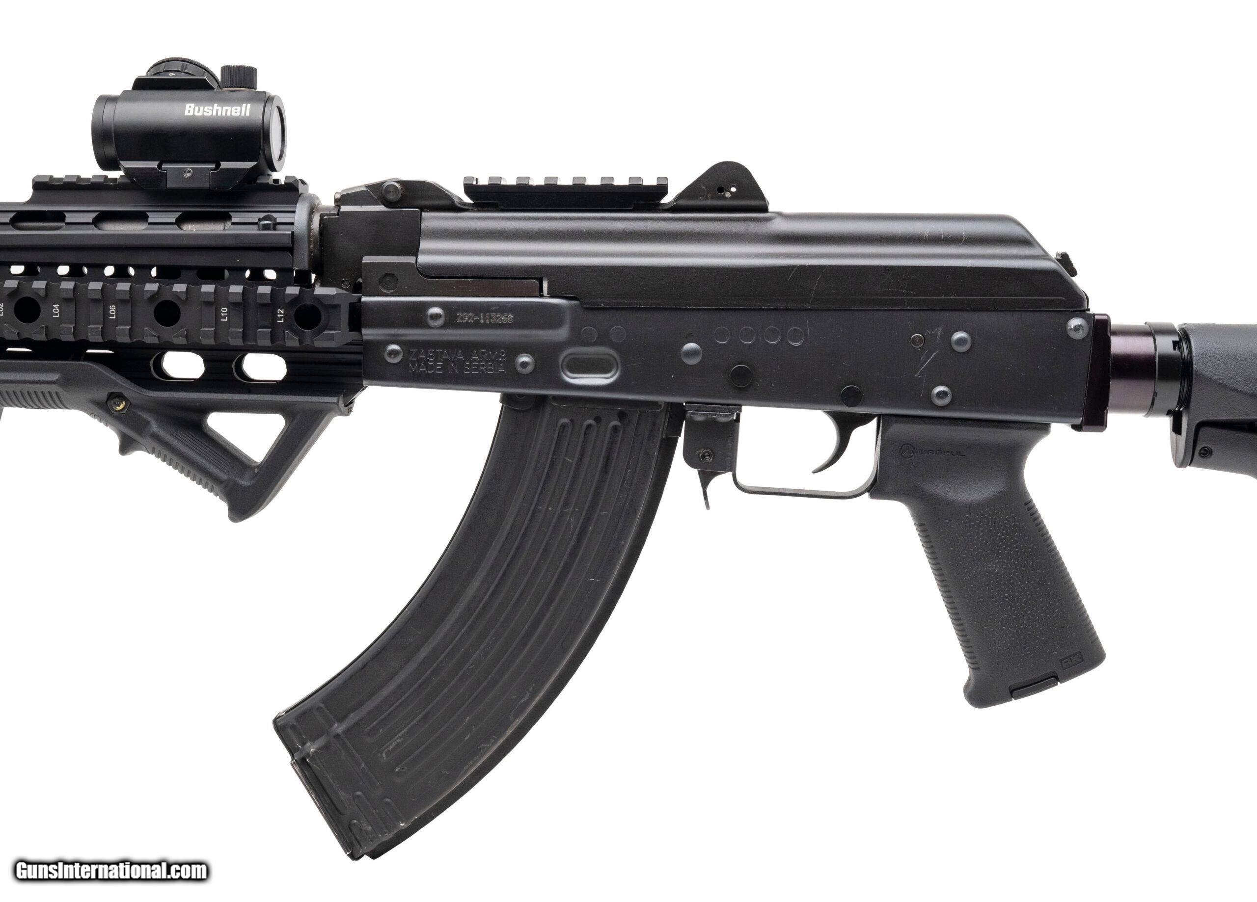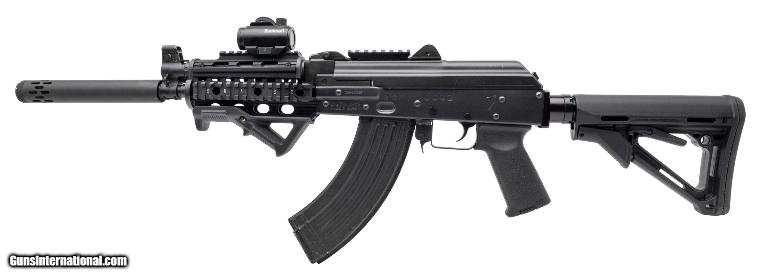 Description: "SN: Z92-113260. Modern production, 7.62x39mm with an 16"" barrel w/pinned faux suppressor. Bore is bright with strong rifling. Serbian made Yugo pattern AK rifle with a picatinny handguard, Bushnell red dot optic, angled grip, and a 6-postiton collapsible stock. Overall condition is very good. Price: $1,250.00 Contact Seller |