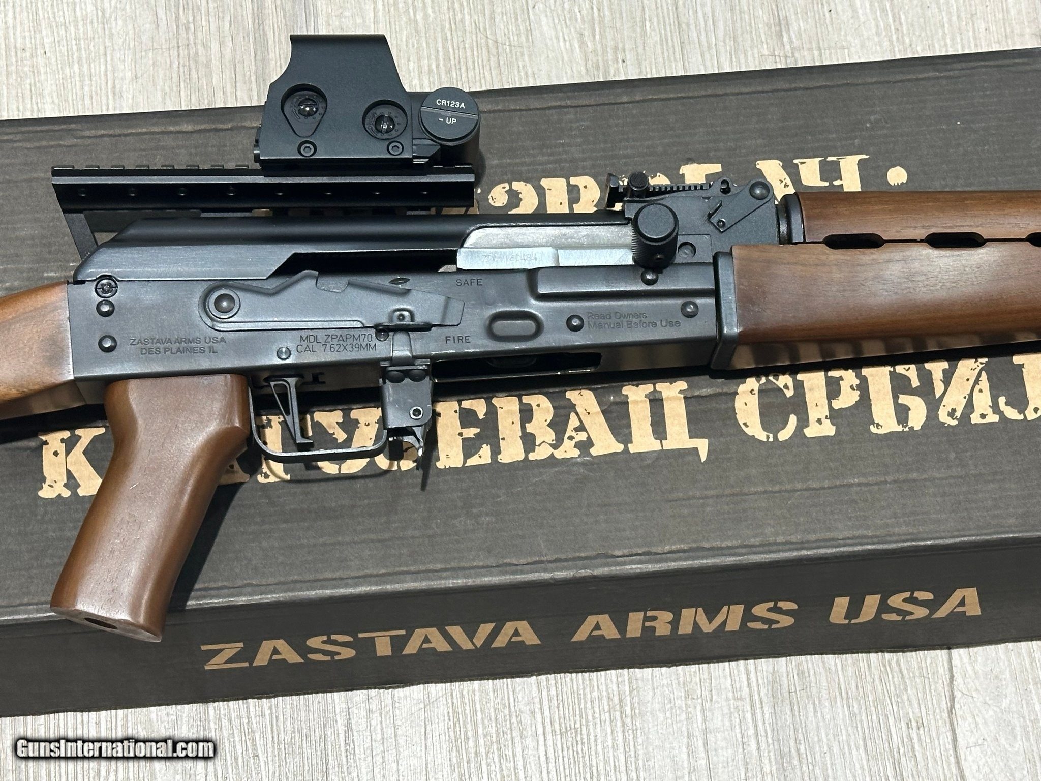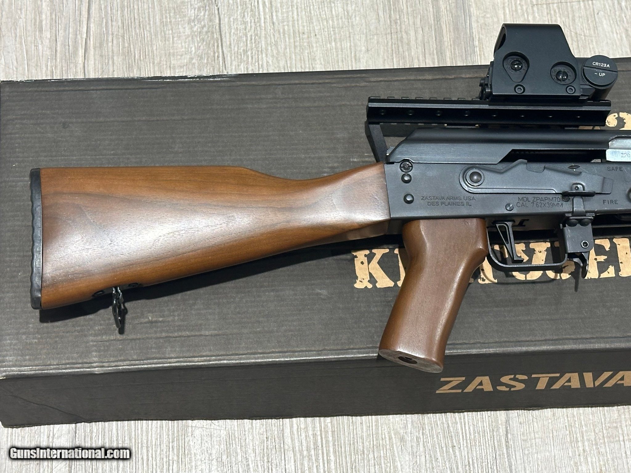 Description: Guns Listing ID: 608777 You are looking at a pre owned but gently used Zastava ZPAPM70 chambered in 7.62x39. This rifle has a 16" barrel and comes with a Chinese made red dot optic mounted on an aftermarket scope mount. The trigger is upgraded to a PSA single stage performance trigger with flat face trigger shoe. An aftermarket screw on bolt handle extension has also been installed. Comes with the original box. Manufacturer: ZASTAVA ARMS Model: M70 Caliber Info: 7.62X39MM Condition: Used - Non-Certified Barrels: 16.5" BARREL Action: SEMI AUTOMATIC Finish: WALNUT, BLUED Weight: 7.9 LBS. Price: $1,350.99 Contact Seller |