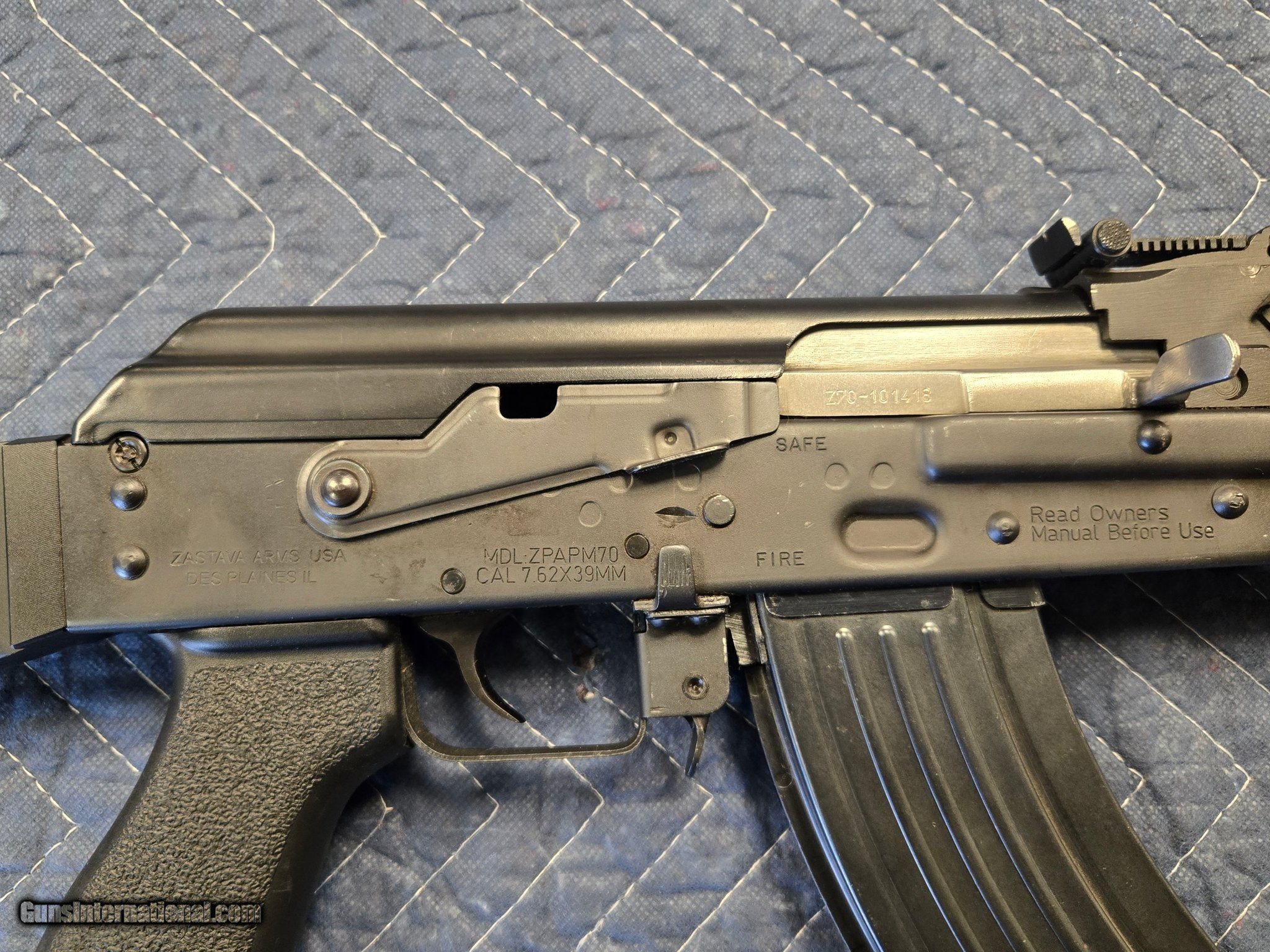 Description: Guns Listing ID: 582183 JUST RIFLE AND ONE 30 ROUND MAGAZINE. This is a Zastava ZPAP M70, a semi-automatic AK-pattern rifle chambered in 7.62x39mm, made in Serbia and imported by Zastava Arms USA (based in Des Plaines, Illinois). ?? Key Identifiers: Markings: “ZASTAVA ARMS USA / DES PLAINES IL" and “ZPAPM70 CAL 7.62X39MM" are clearly visible on the receiver. Stock: Fixed Serbian-style skeleton stock made of polymer — a feature of the ZPAP M70 “Lightweight" or “Modern" configuration. Furniture: Traditional Serbian red-stained wooden handguard set — not laminate, but solid wood. Receiver: Heavy 1.5mm stamped receiver with bulged trunnion, typical of the M70 line. Magazine: Standard steel 30-round 7.62x39mm magazine. ?? Configuration Details: Muzzle device: Classic AKM-style slant brake. Sights: Standard AK adjustable rear sight with hooded front post. Finish: Black phosphate or nitride, typical of Zastava’s current production rifles. Furniture wear: The wood has a few visible finish chips and dents ?? Notes on Quality: Zastava rifles are known for their: Exceptional build quality (forged trunnions and barrels) Smooth, reliable action and trigger Excellent accuracy for an AK platform Manufacturer: ZASTAVA ARMS Model: ZPAP Caliber Info: 7.62X39MM Condition: Used - Non-Certified Barrels: 16" BARREL Action: SEMI AUTOMATIC Price: $1,050.99 Contact Seller |