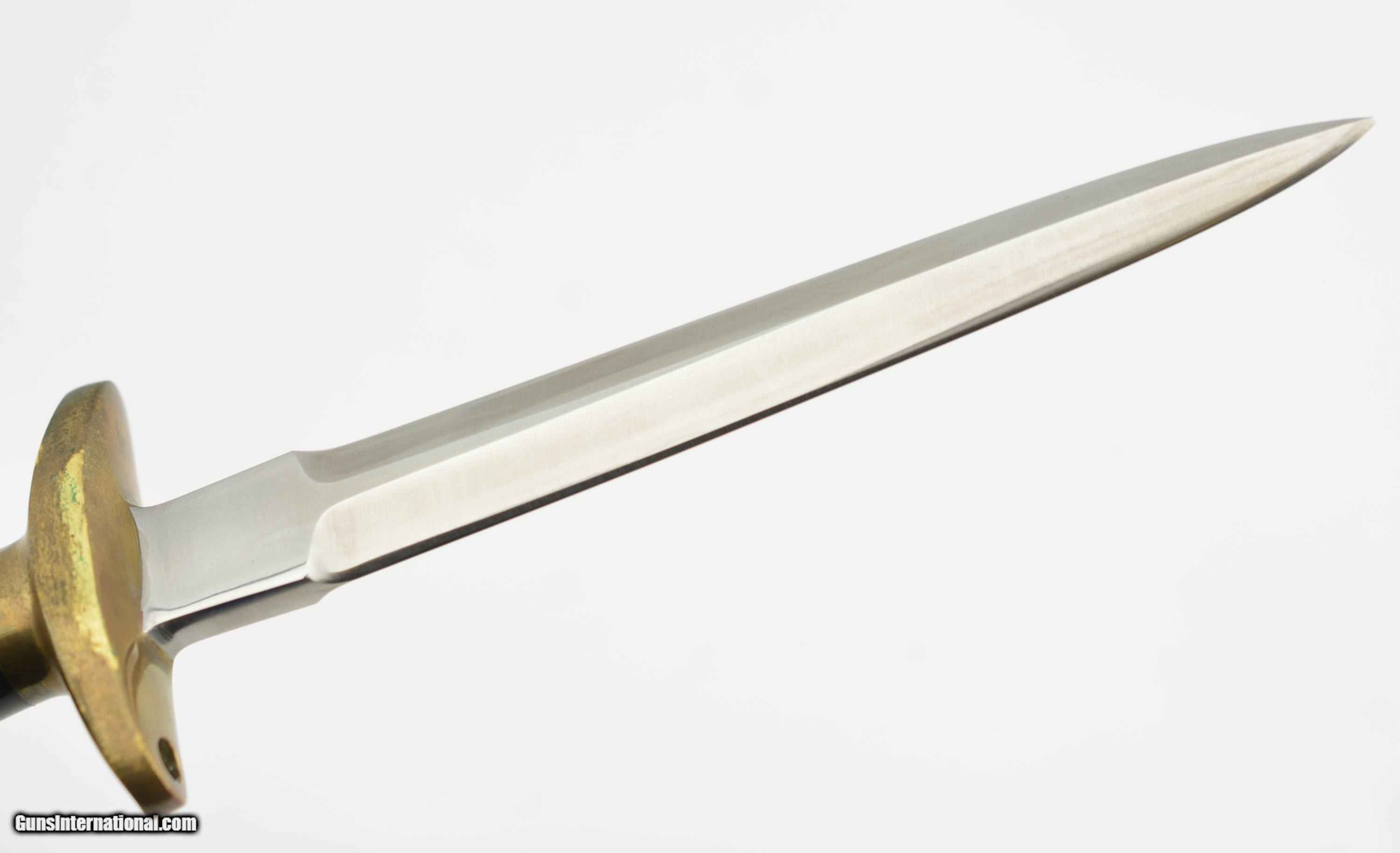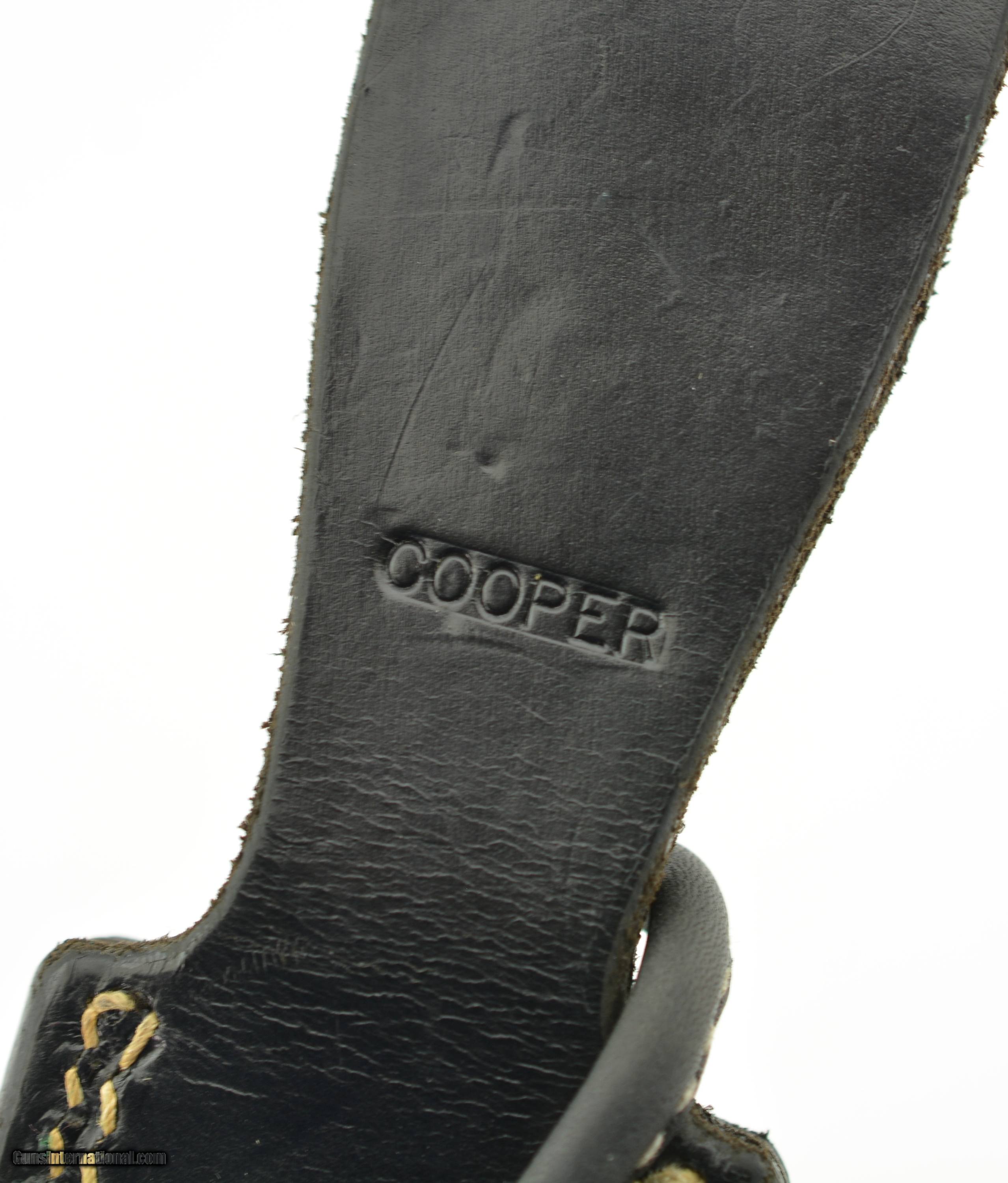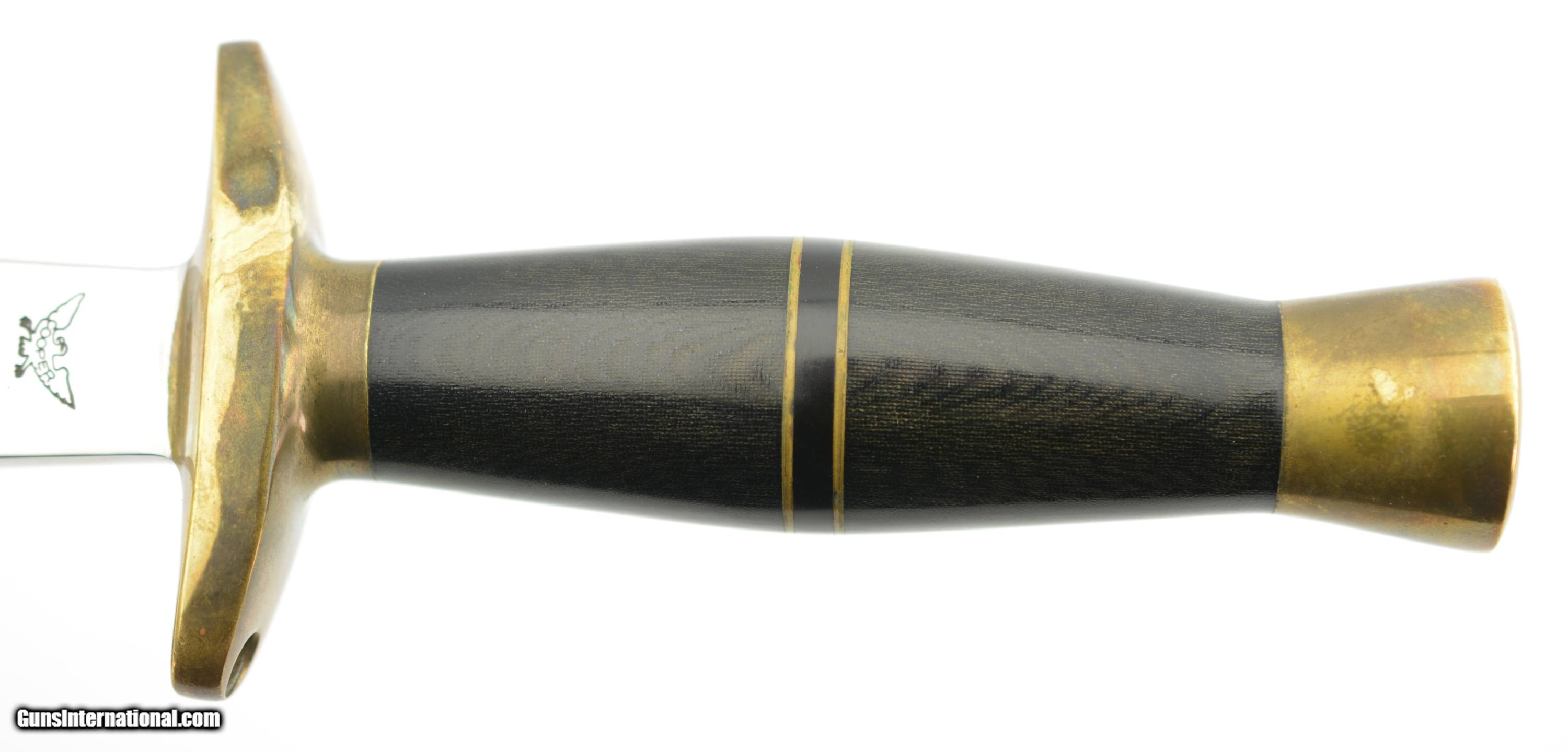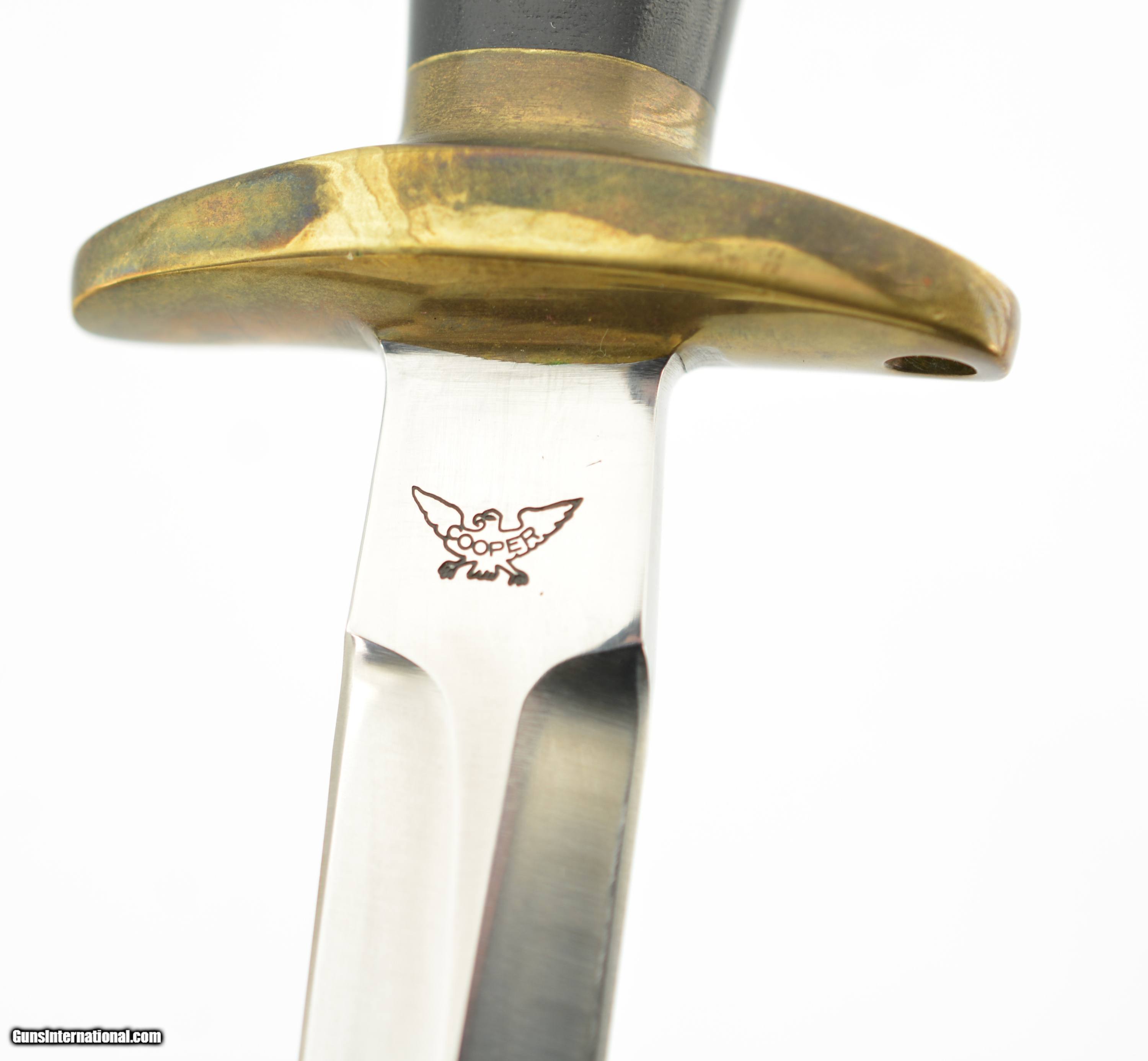 Description: This is a custom toothpick style Boot Knife or Dagger made by John Nelson Cooper of Tremont PA. Famous for his patented bonded hilt Cooper Knives have developed a loyal following since 1924 when he began making them for towns people of Tremont, PA. The knife measures 9 3/4" overall with a 5 1/2" double edge carbon steel blade. The blade remains unsharpened and bright with Cooper eagle maker mark on the obverse ricasso. The double guard and pommel have a tarnished brass patina and commando shaped black micarta handle with gold and black spacer center remains in excellent condition. Included is a black leather sheath with double snap handle strap marked “COOPER" on the back belt loop showing a few light handling marks. A very collectible and sought after knife. SOLD Manufacturer: John Nelson Cooper |