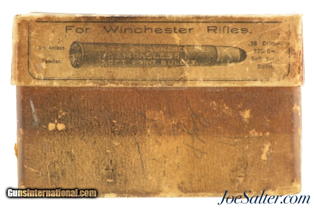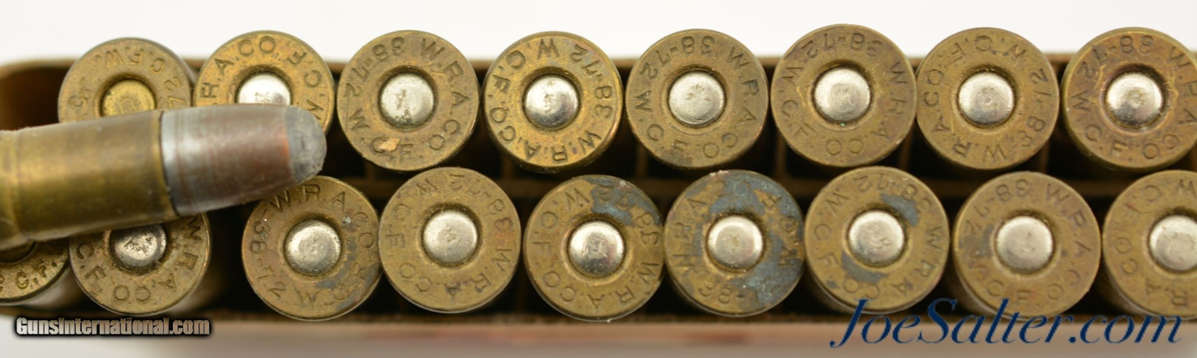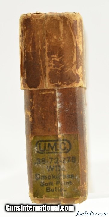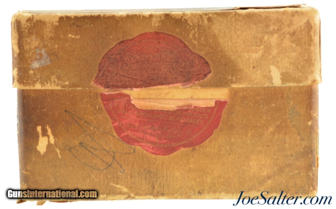 Description: This is a full and mixed box of .38-72 ammunition manufactured by UMC and Winchester. The two piece UMC box is solid with rub wear and soiling. Included are 3 correct, original rounds with 275 grain soft point bullets with the balance of 17 rounds of Winchester with "W.R.A. Co" head stamps and similar soft point bullets. The cartridges are in near excellent condition with some age darkening. SOLD |