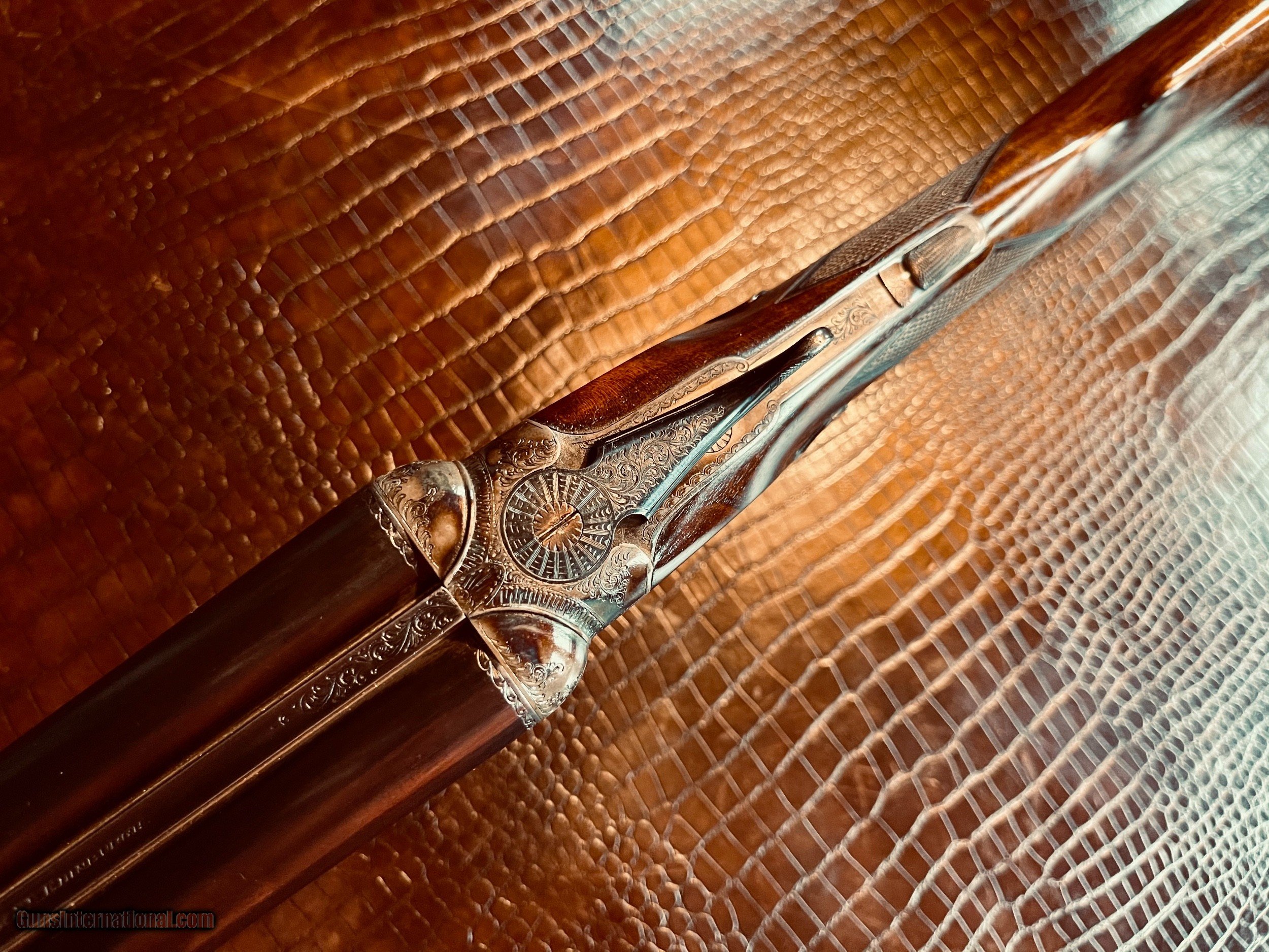 Description: Alex Henry & Co - 28ga - Boxlock Ejector - 2 1/2” Shells 5/8 oz load - 26” - SK/IMK - Double Triggers - Untouched - Unaltered - ca. Pre-War - Tiny Frame - 4.13 lbs - 14 5/8 x 1 1/2 x 2 - SN: 22066 - this little shotgun has seen very few days in the field - there is no evidence of alteration or abuse - there is minute evidence of field use - all screws are in place - most of the color case remains as seen in the photos - oil finish still remains - bluing has held its integrity as a good Scottish gun should - Silver Oval with "SJK" - Ejectors are crisp and timed - triggers are crisp - tolerances are tight - on face - a wonderful Scottish piece for the field designed to be carried all day with one hand - please note the tiny frame in comparison to the quarter placed on it for contrast - amazing engineering and craftsmanship! Visit RST shells for the finest 2 1/2" ammo for this shotgun. The Quillen-Worfe Private Gun Collection - Guns International page – please read prior to making a purchase: