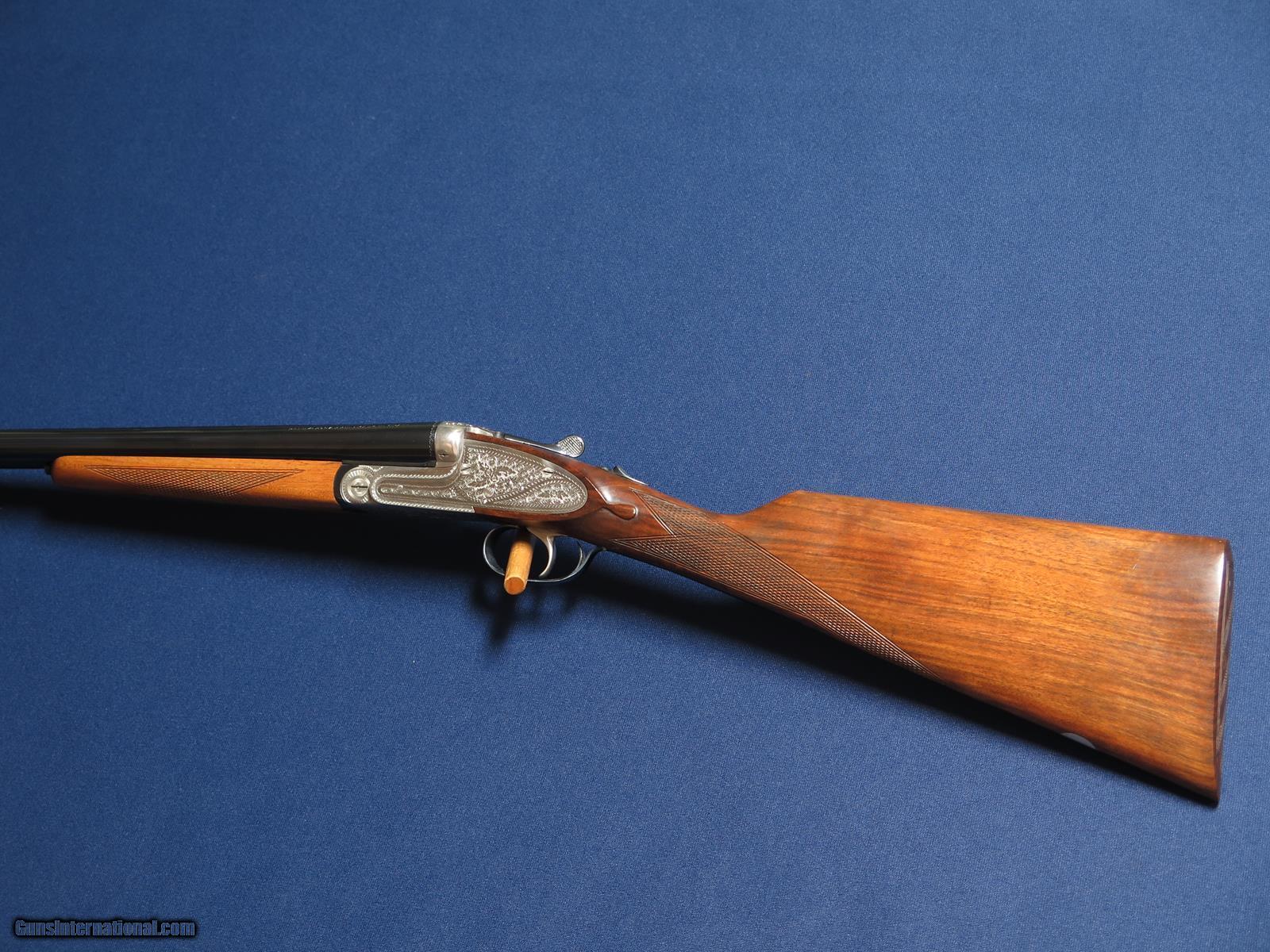 Description: American Arms Company Derby-E Sidelock 20ga. Made by F. Sarriugarte. 25 in barrels. IC and Mod chokes. 3 in chambers. Single triggers. Automatic ejectors. 14 3/8 LOP checkered butt. Straight grip. 98-99% in box. Excellent bores. SOLD |