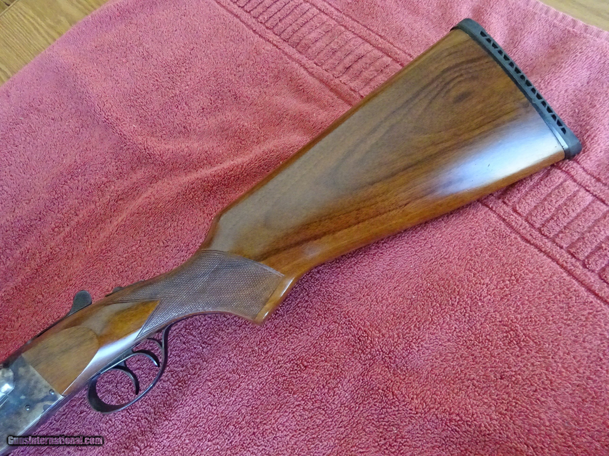 Description: AMERICAN ARMS CO., SPAIN, GENTRY MODEL SIDE BY SIDE, 28 GAUGE. 26" BARRELS, MODIFIED AND FULL, 2 3/4" CHAMBERS, RAISED MATTED RIB, 99% BRIGHT BLUE, MIRROR PERFECT BORES, SINGLE BEAD SIGHT. BARRELS RING LIKE A BELL. BOXLOCK, BOLD VIVID CASE COLOR, FINE SCROLL ENGRAVING COVERS MOST OF THE FRAME, ENGRAVED SCREWS. TRIGGERGUARD DEEP CUT SCROLL ENGRAVING, 100% BLUE. PISTOL GRIP STOCK, SPLINTER FOREARM, NEAR-PERFECT CHECKERING AND WOOD FINISH. ORIGINAL HALF-INCH RECOIL PAD, 1 1/4" X 2 1/2" X 14 1/2", JUST OVER 6 POUNDS. NEAR NEW CONDITION, TOP LEVER TO THE FAR RIGHT, STILL STIFF TO OPEN. PROBABLY MADE AND IMPORTED IN THE 1980s. $1175.00 + $50.00 Insured shipping to an FFL address. See all Pats gun listings on this site! We also have hundreds of pieces of ORIGINAL gun company advertising & memorabilia available for sale on our site SPORTINGCOLLECTIBLES. We have no reprints or reproductions. Email for more information. SOLD |