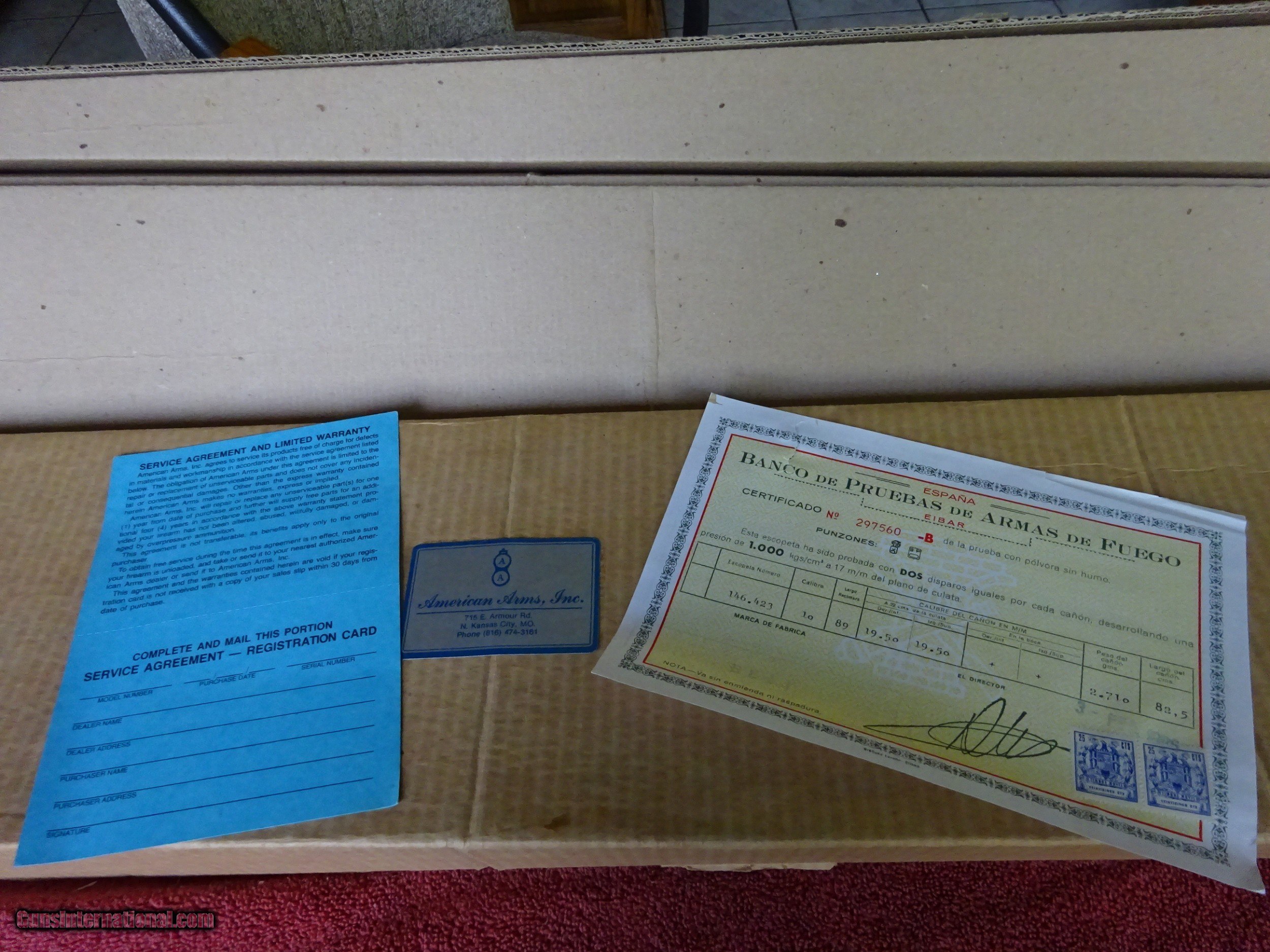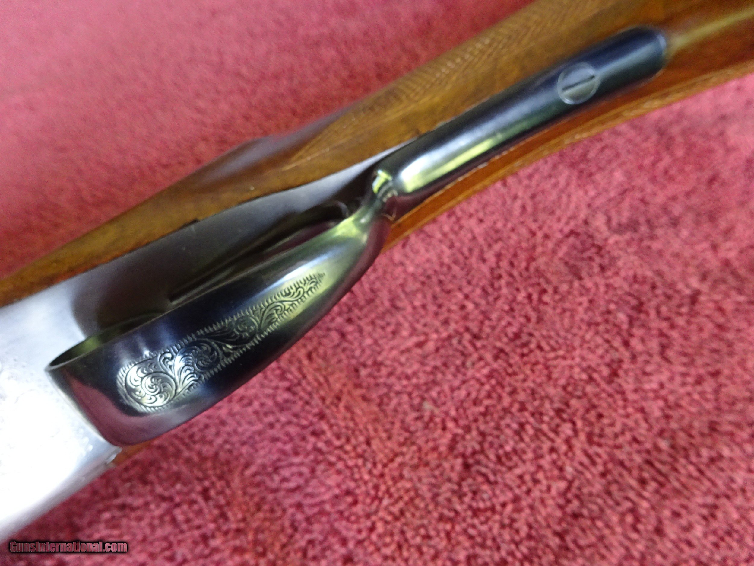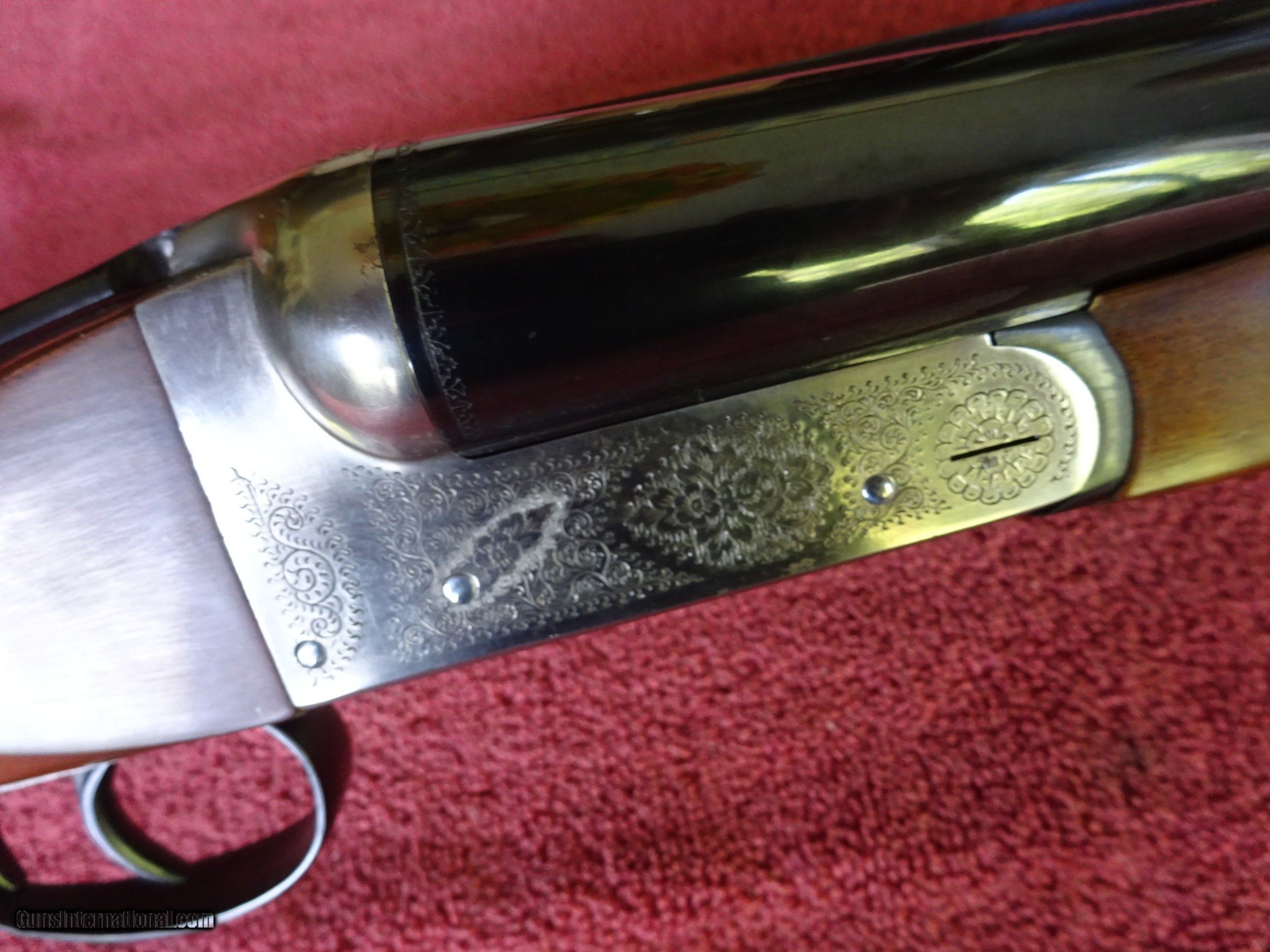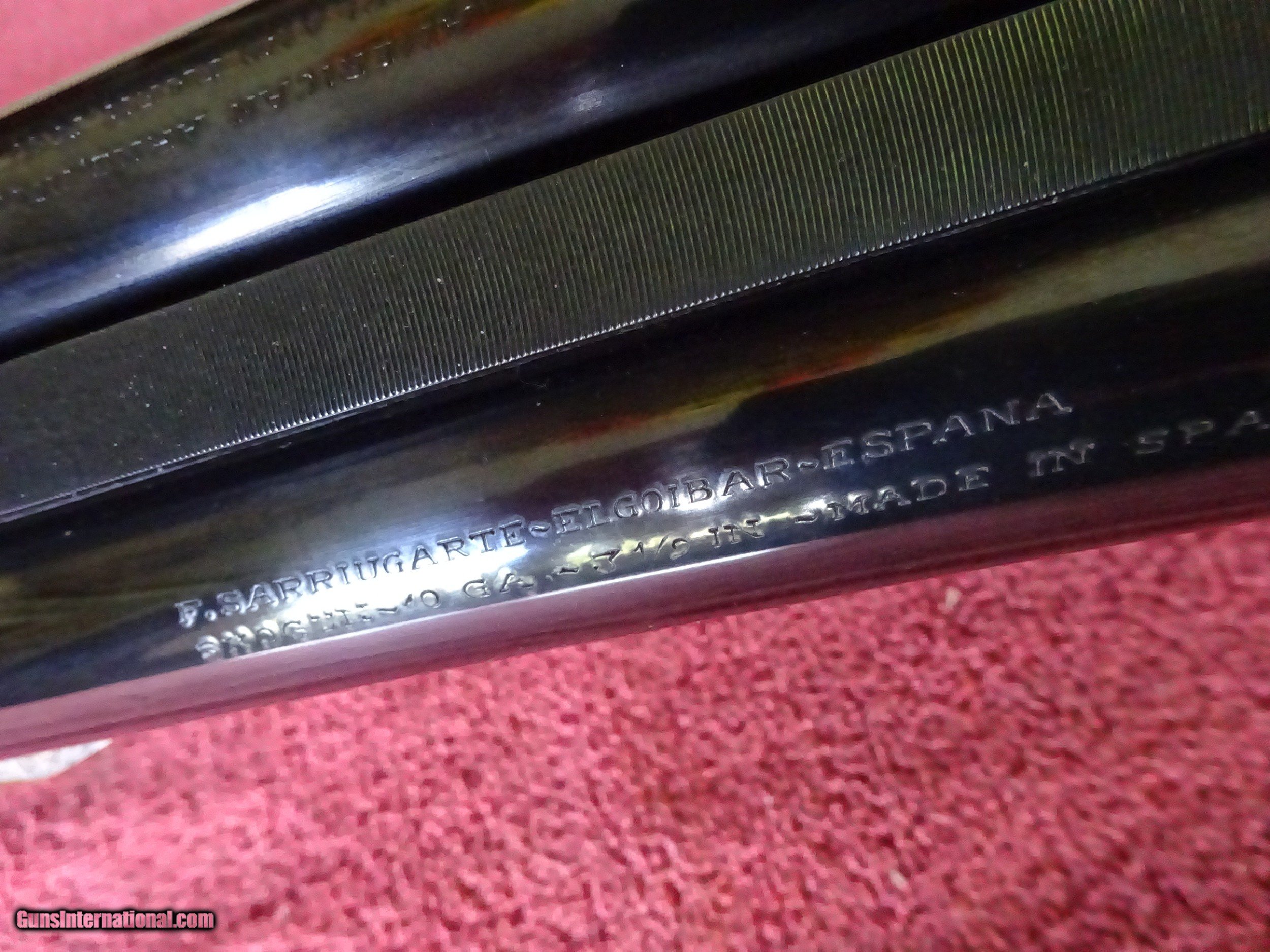 Description: SARRIUGARTE, AMERICAN ARMS, YORK MODEL 10 GAUGE 3 1/2" MAGNUM. 32" BARRELS, FULL AND FULL, COIN FINISH, BOXLOCK FRAME. BLUED TOP LEVER, SAFETY, TRIGGERGUARD AND FOREARM IRON. FULLY ENGRAVED WITH ACANTHUS SCROLL AND FOLIATE CLUSTERS, ENGRAVED SCREWS. PISTOL GRIP STOCK, BEAVERTAIL FOREARM, FINE CUT CHECKERING, BRASS OVAL STOCK INLAY, 1 1/4" X 2 1/4" X 14 1/2", 11 POUNDS EVEN. NEW UNFIRED IN THE ORIGINAL BOX WITH FACTORY CERTIFICATE AND WARRANTY. GREAT TURKEY OR GOOSE GUN. MADE IN THE 1980s IN SPAIN. THESE BIG 10 GAUGE GUNS RARELY COME UP FOR SALE. GREAT VALUE FOR THE MONEY. $1750.00 + $50.00 Insured shipping to an FFL address. See all Pats gun listings on this site! We also have hundreds of pieces of ORIGINAL gun company advertising & memorabilia available for sale on our site SPORTINGCOLLECTIBLES. We have no reprints or reproductions. Email for more information. SOLD |