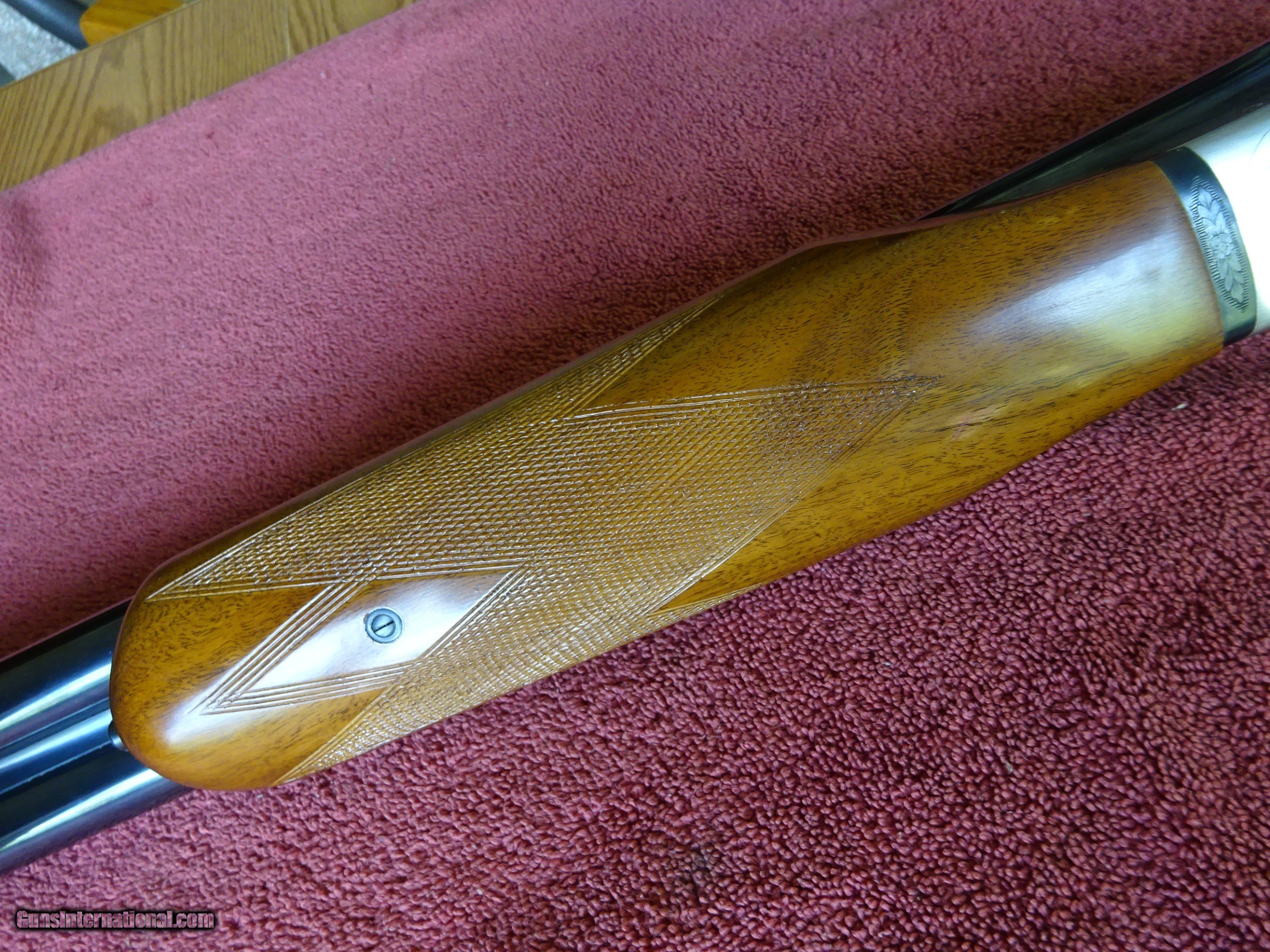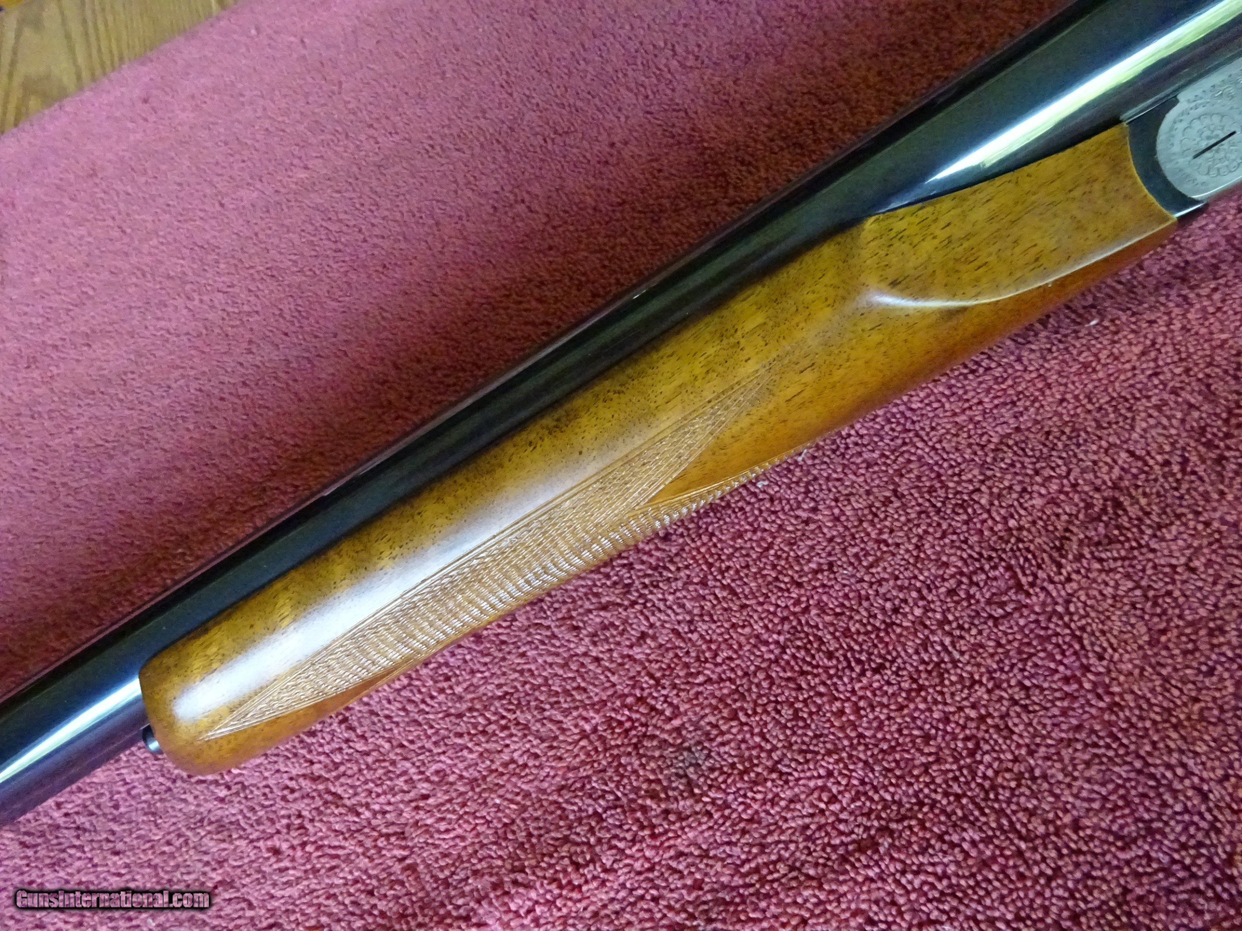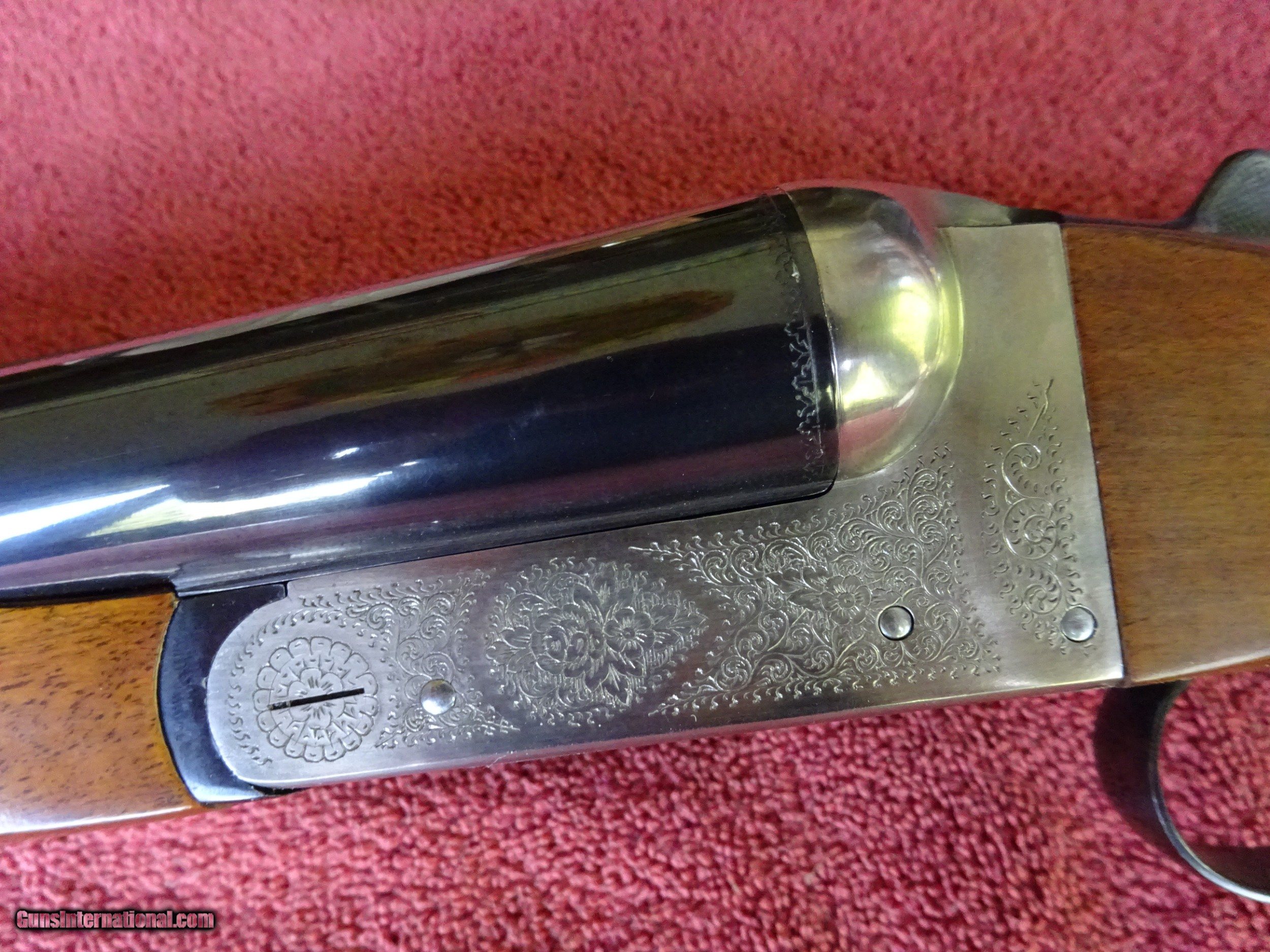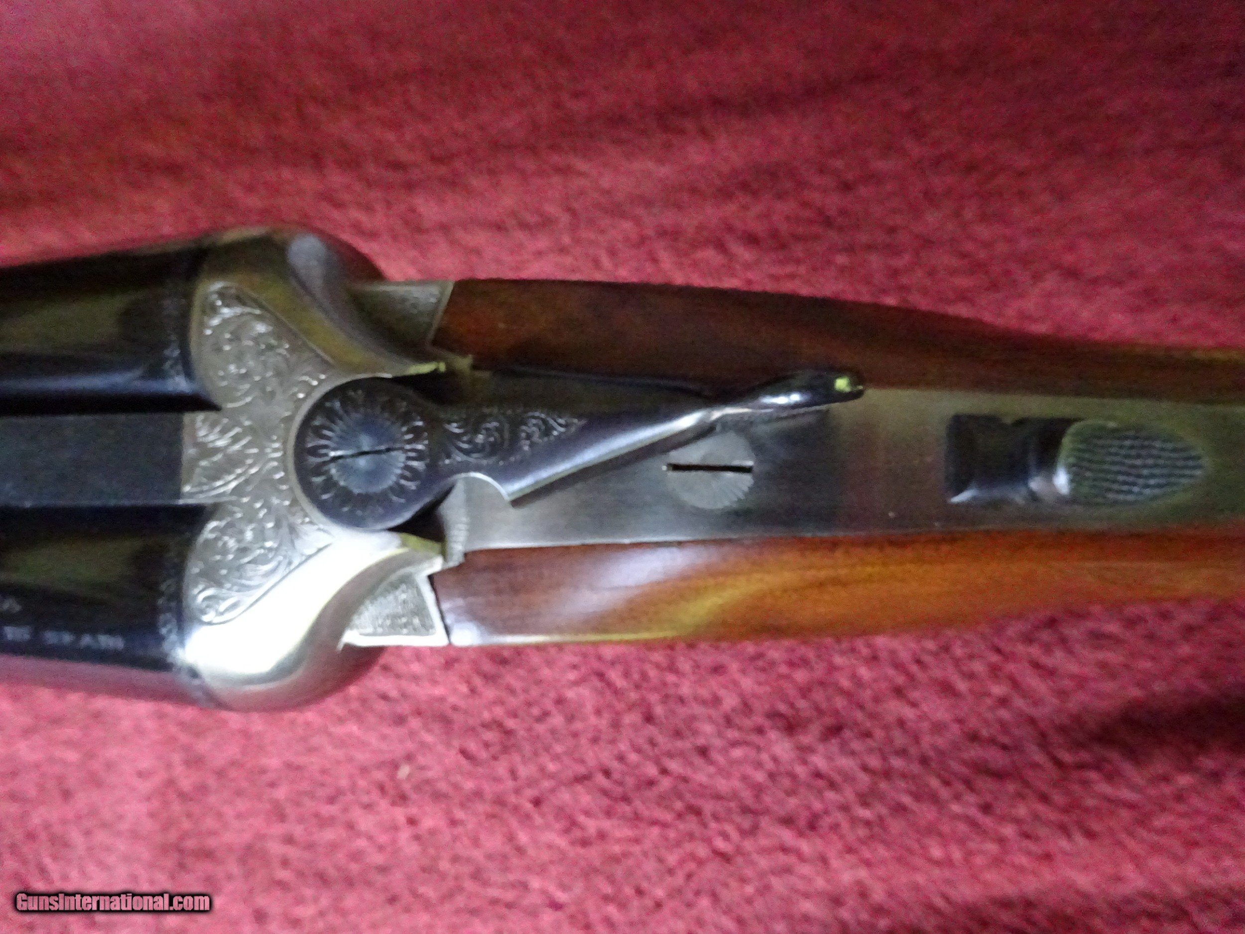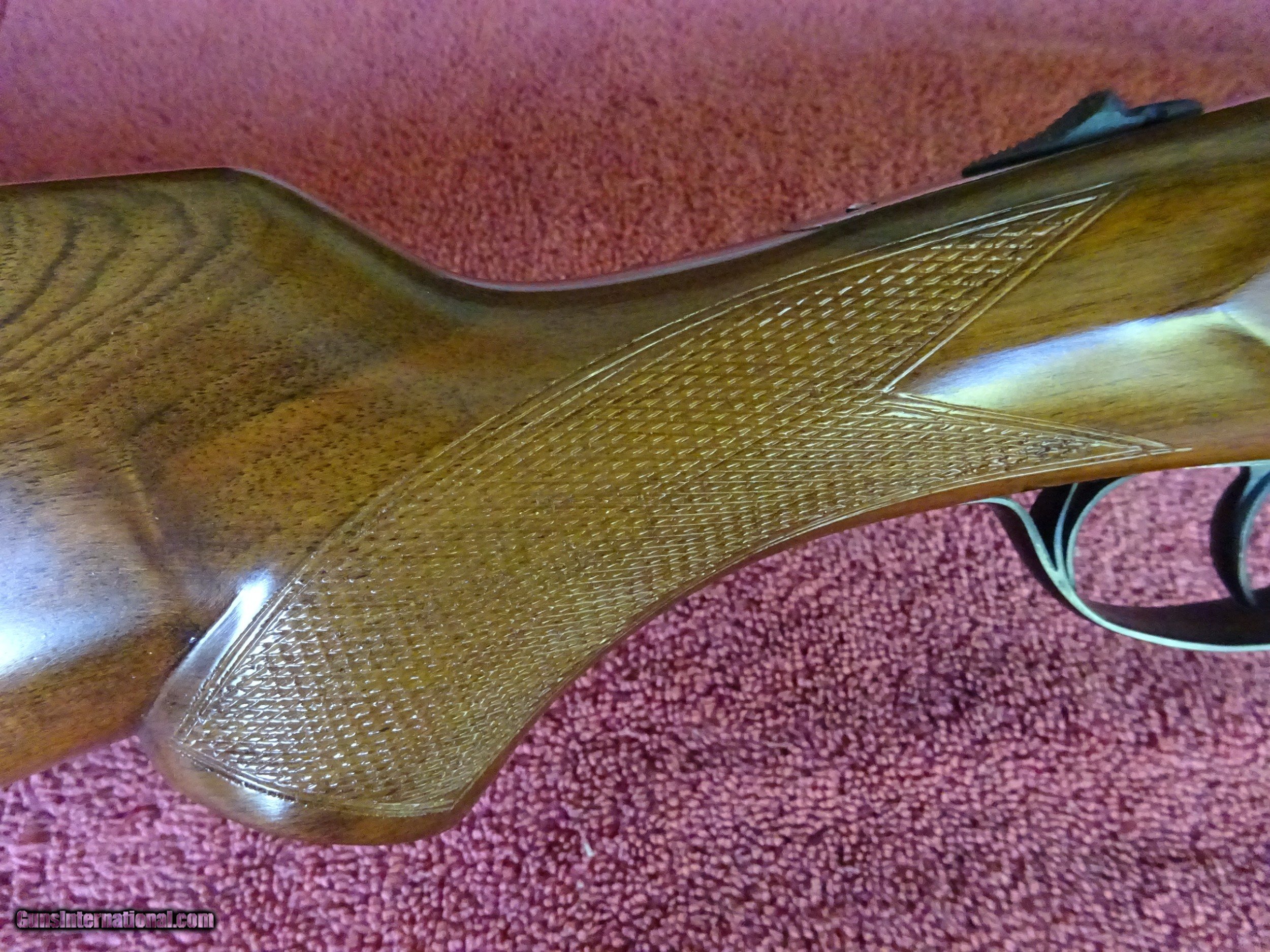 Description: SARRIUGARTE, AMERICAN ARMS, YORK MODEL 10 GAUGE 3 1/2" MAGNUM. 32" BARRELS, FULL AND FULL, COIN FINISH, BOXLOCK FRAME. BLUED TOP LEVER, SAFETY, TRIGGERGUARD AND FOREARM IRON. FULLY ENGRAVED WITH ACANTHUS SCROLL AND FOLIATE CLUSTERS, ENGRAVED SCREWS. PISTOL GRIP STOCK, BEAVERTAIL FOREARM, FINE CUT CHECKERING, BRASS OVAL STOCK INLAY, 1 1/4" X 2 1/4" X 14 1/2", 11 POUNDS EVEN. NEW UNFIRED IN THE ORIGINAL BOX WITH FACTORY CERTIFICATE AND WARRANTY. GREAT TURKEY OR GOOSE GUN. MADE IN THE 1980s IN SPAIN. THESE BIG 10 GAUGE GUNS RARELY COME UP FOR SALE. GREAT VALUE FOR THE MONEY. $1750.00 + $50.00 Insured shipping to an FFL address. See all Pats gun listings on this site! We also have hundreds of pieces of ORIGINAL gun company advertising & memorabilia available for sale on our site SPORTINGCOLLECTIBLES. We have no reprints or reproductions. Email for more information. SOLD |