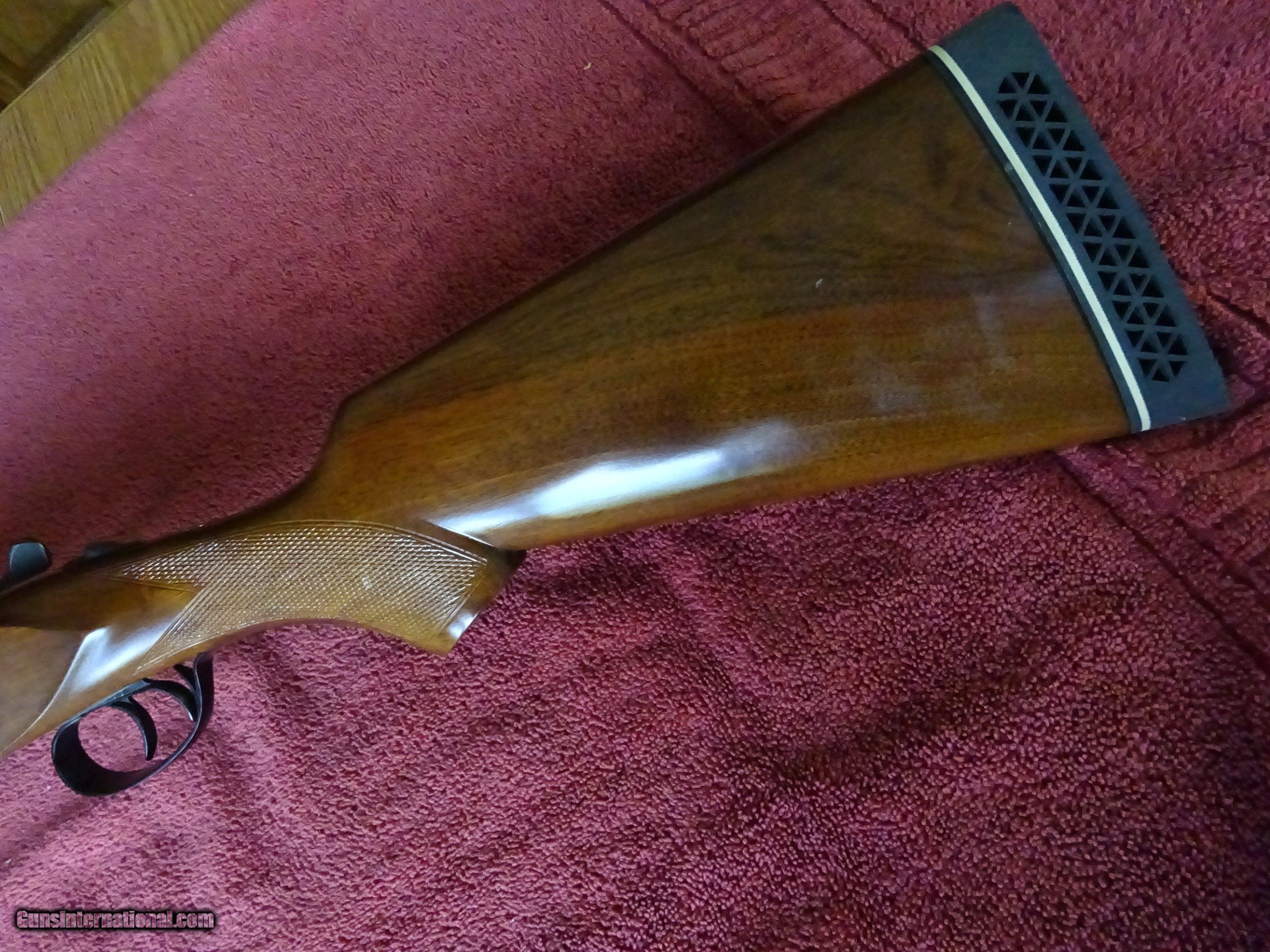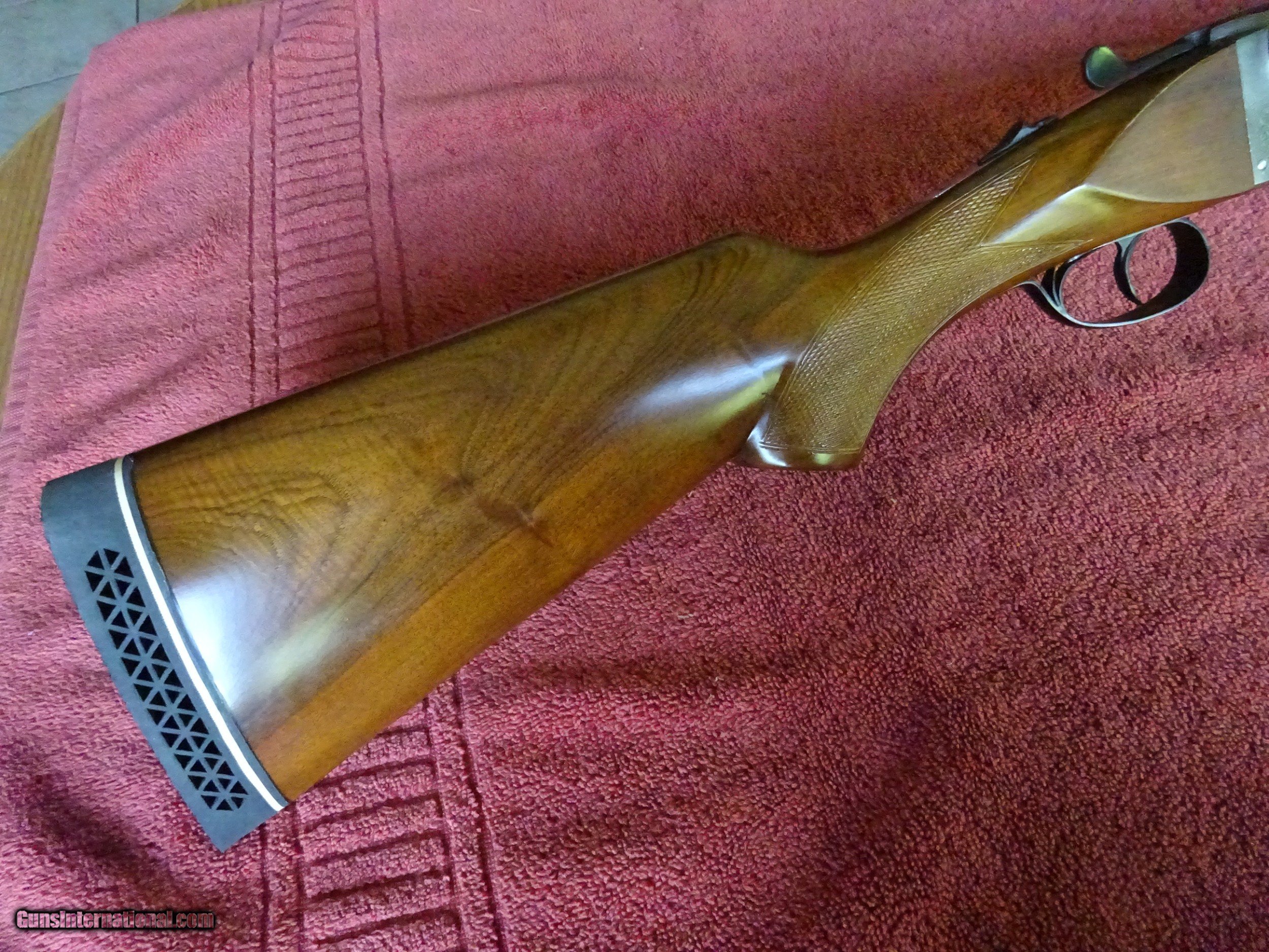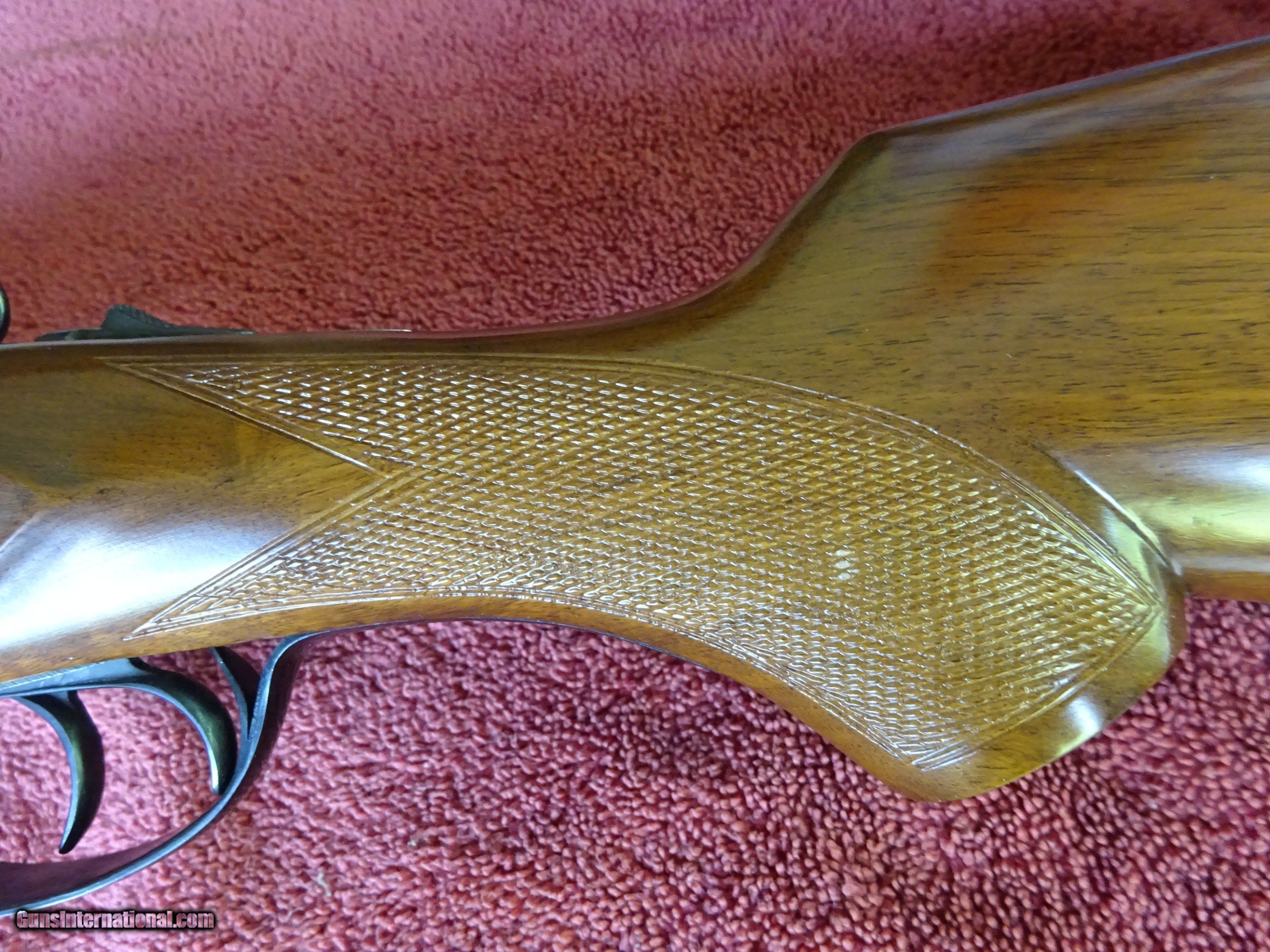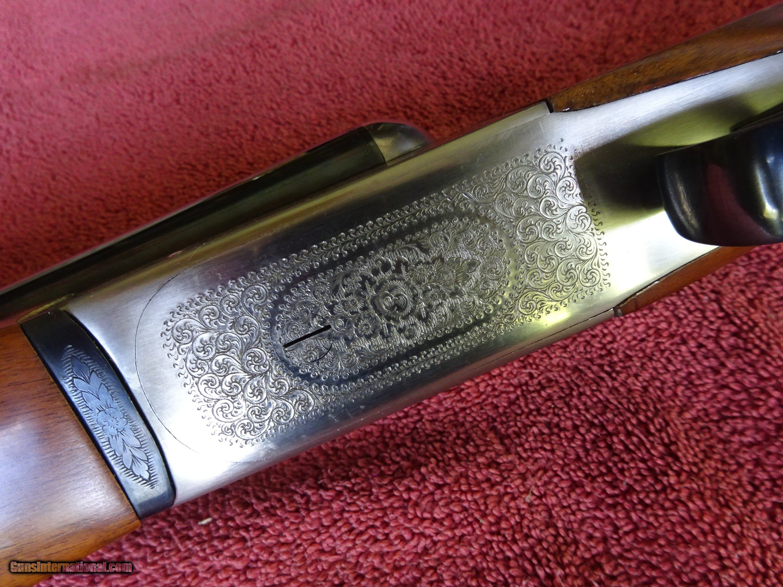 Description: SARRIUGARTE, AMERICAN ARMS, YORK MODEL 10 GAUGE 3 1/2" MAGNUM. 32" BARRELS, FULL AND FULL, COIN FINISH, BOXLOCK FRAME. BLUED TOP LEVER, SAFETY, TRIGGERGUARD AND FOREARM IRON. FULLY ENGRAVED WITH ACANTHUS SCROLL AND FOLIATE CLUSTERS, ENGRAVED SCREWS. PISTOL GRIP STOCK, BEAVERTAIL FOREARM, FINE CUT CHECKERING, BRASS OVAL STOCK INLAY, 1 1/4" X 2 1/4" X 14 1/2", 11 POUNDS EVEN. NEW UNFIRED IN THE ORIGINAL BOX WITH FACTORY CERTIFICATE AND WARRANTY. GREAT TURKEY OR GOOSE GUN. MADE IN THE 1980s IN SPAIN. THESE BIG 10 GAUGE GUNS RARELY COME UP FOR SALE. GREAT VALUE FOR THE MONEY. $1750.00 + $50.00 Insured shipping to an FFL address. See all Pats gun listings on this site! We also have hundreds of pieces of ORIGINAL gun company advertising & memorabilia available for sale on our site SPORTINGCOLLECTIBLES. We have no reprints or reproductions. Email for more information. SOLD |