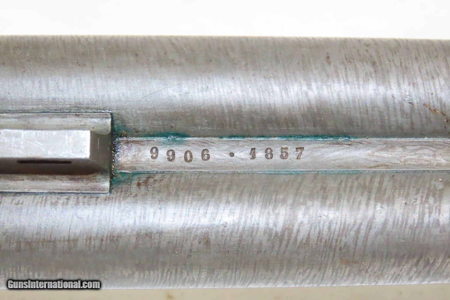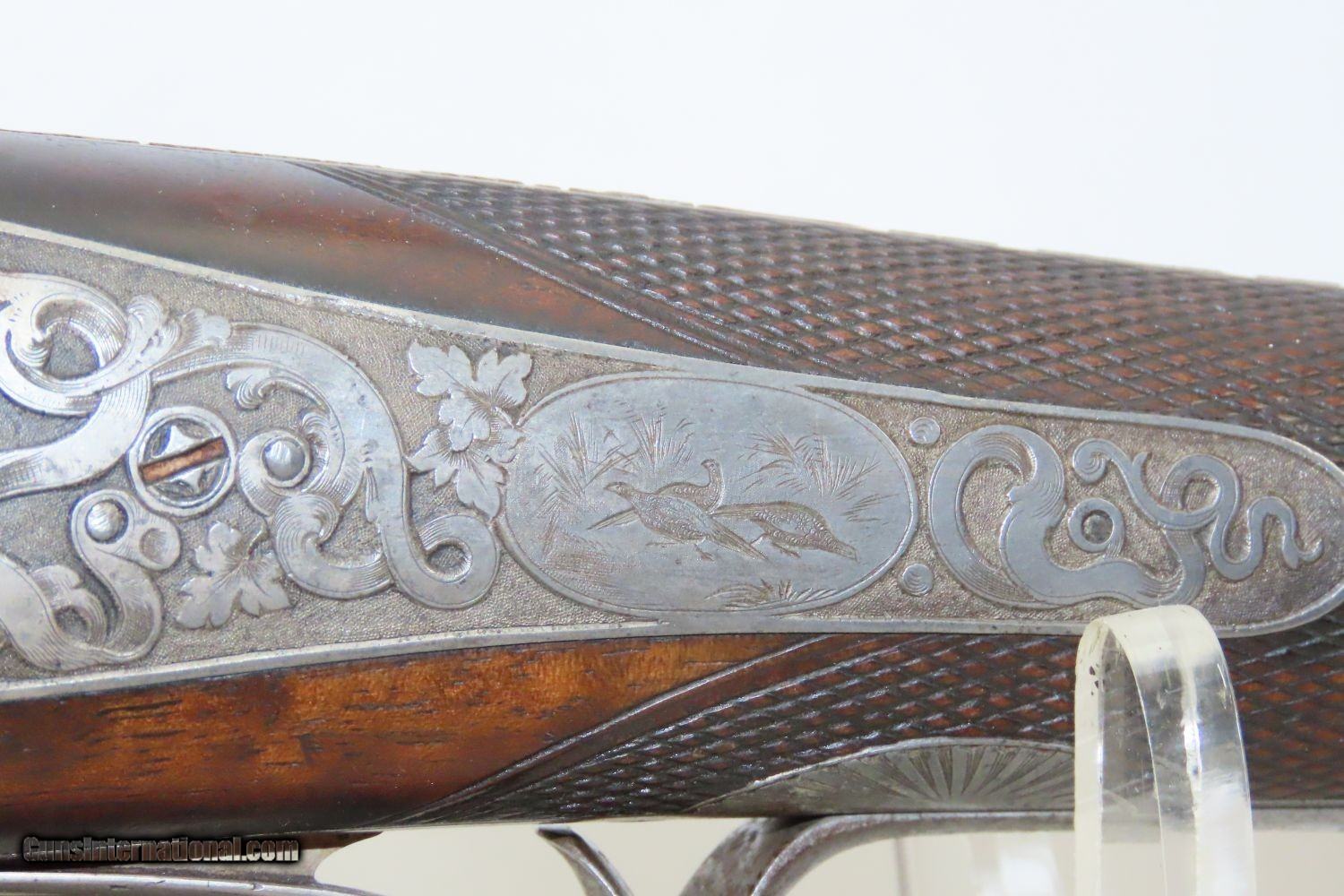 Description: Exquisite FRENCH SxS DUAL IGNITION Shotgun 16 Gauge Centerfire/Pinfire Case Deluxe Walnut, Engraved, Gold, Cased Here we present an antique French Engraved and Gold Inlaid Beatus Beringer Double Barrel Pinfire/Centerfire Combination 16 Gauge Shotgun, made circa the mid-19th Century in Paris, France. Beatus Beringer of Paris and St. Etienne appears in records between 1835 and 1869. His Paris address was 26 Rue de la Monnaie. He exhibited at the Great Exhibition at Crystal Palace in 1851. Aside from the "INVon BERINGER Bte A PARIS" marked Damascus barrels, the shotgun has full coverage relief engraved leafy scroll and wild game designs. This engraving may have been executed by Louis Penel of St. Etienne (active circa 1857-1870) who is known to have engraved and signed other shotguns by Beringer which display similar designs. It has a single post front sight and is mounted in a deluxe French walnut stock with checkering at the wrist. This breech-loading pinfire and/or centerfire shotgun utilizes the trigger guard as an underlever that swivels to allow the muzzles to fall and the breech to tip up for loading and unloading. The rear of the trigger guard falls into a detent under the spring pressure of the rest of the guard (which acts as a leaf spring) to prevent the lever from swiveling at will. As for the dual ignition pinfire/centerfire aspect of this double, you will notice a small screw head on the exterior of each of the hammers. These attach a centerfire firing pin to each hammer, thus allowing the use of either of these types of shells. This is a very clean, sleek design that does everything it needs to do, sometimes with dual purposes. The overall condition is fine. Very nice Damascus twist pattern is visible. Strong tight actions. Bright bore. This example sports a solid stock with nice checkering. Clear gold inlays atop the barrel and bottom of the trigger guard. Deeply, and finely detailed engraved frame and trigger guard. The case has clearly seen much use and is mostly bare of its original leather covering. It did its job, however, and the shotgun inside has been very well preserved. Own the original! This is a legitimate antique and not a reproduction. Barrels are 26-1/8 inches. Caliber: 16 Gauge Pinfire Chambers: 2-1/2 inch LOP: 14-3/4 inches Overall condition as seen in photos. Very Fast. Very Safe. FREE SHIPPING WORLDWIDE. Delivered directly to your door by express mail! Guaranteed AUTHENTIC & Includes CERTIFICATE OF AUTHENTICITY. ancestryguns $3585 #210408 SOLD Antique: Yes |