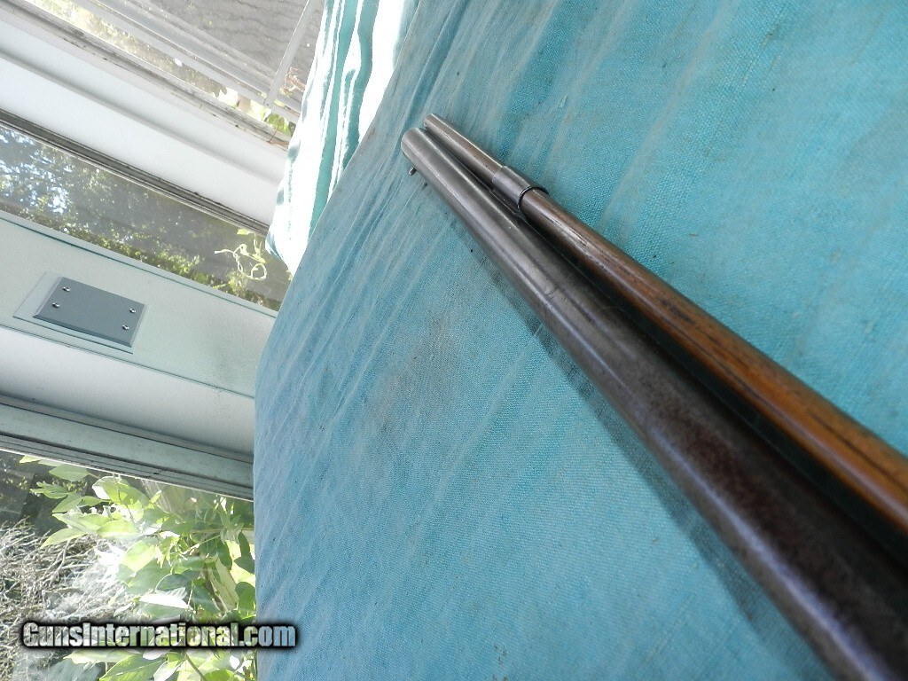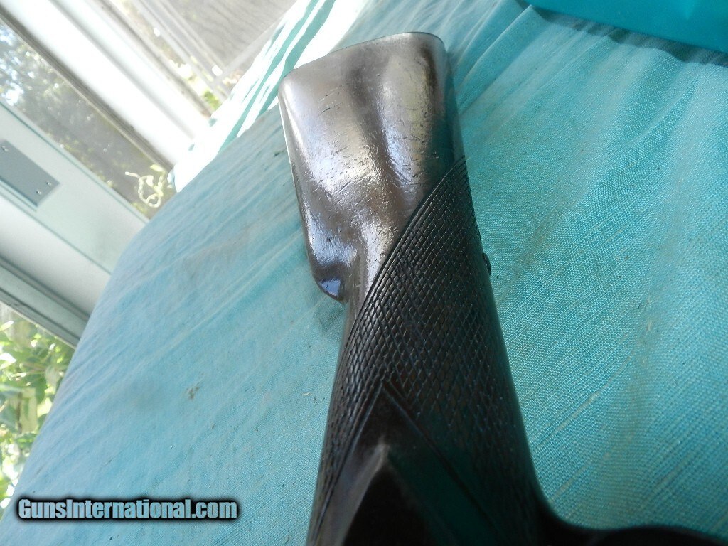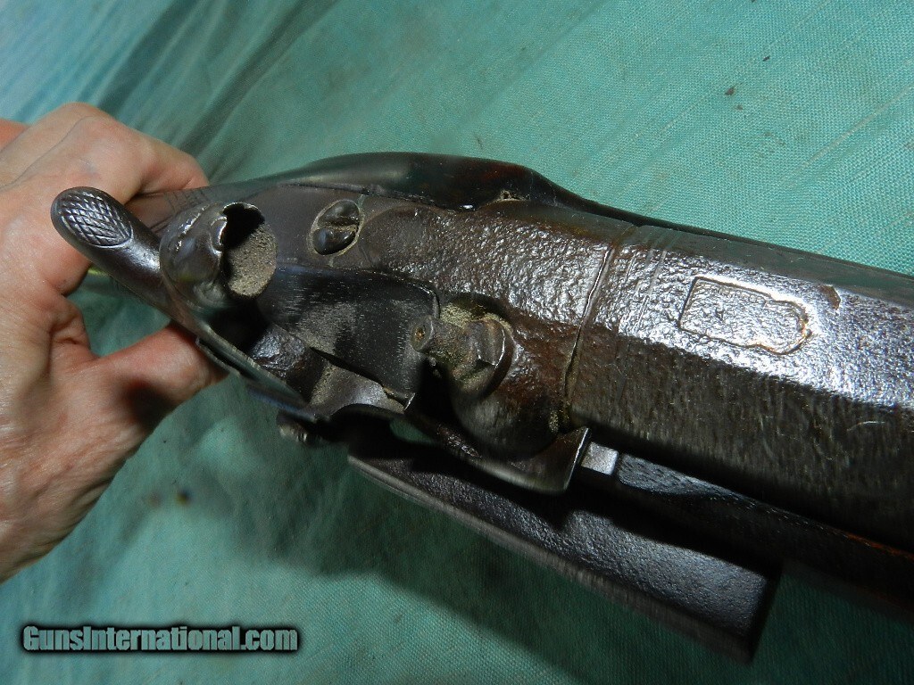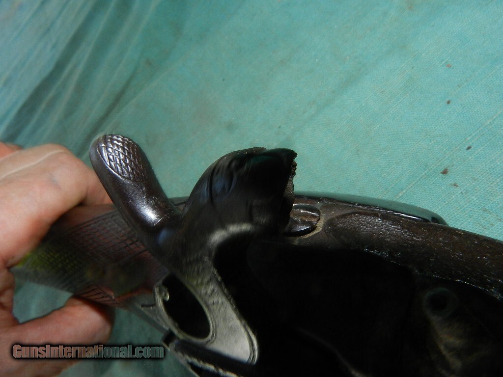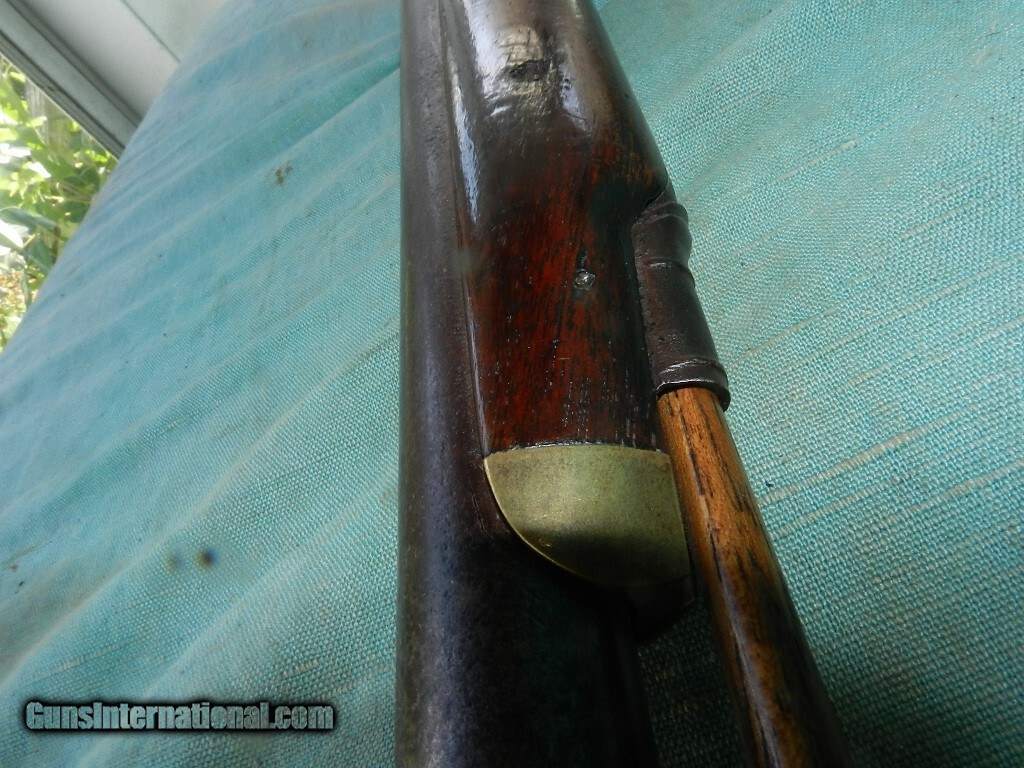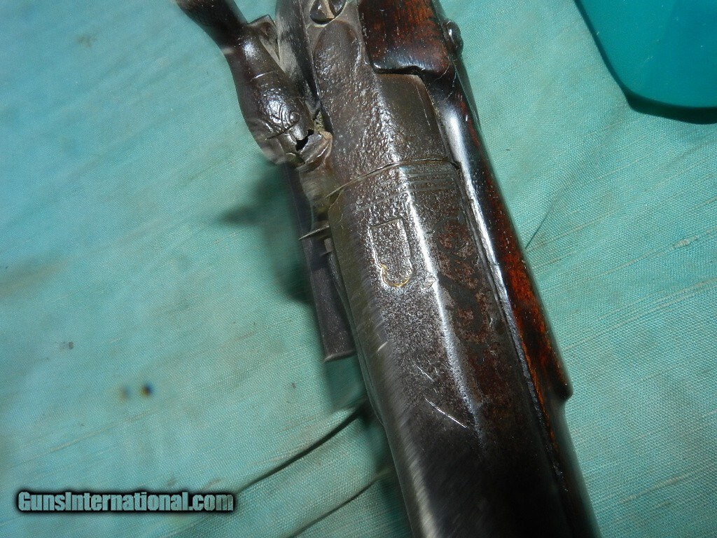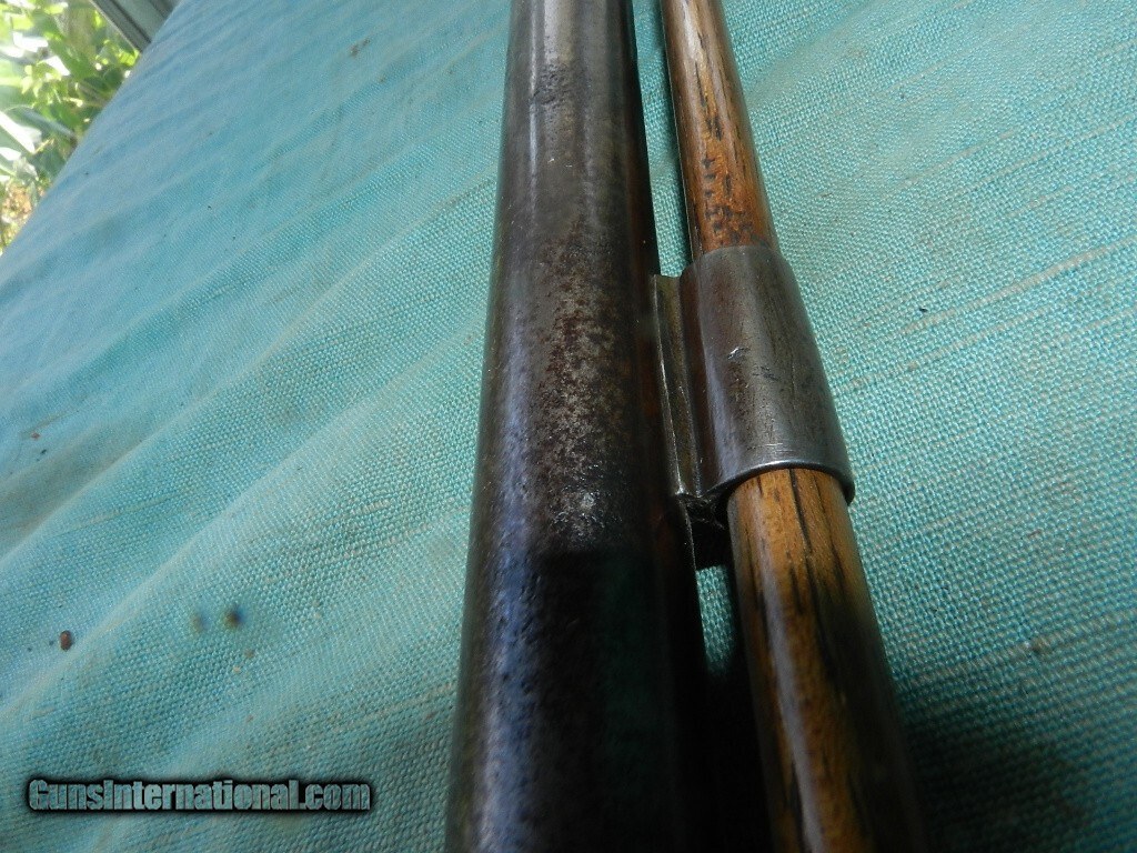 Description: With a 14 bore,and a 35” barrel with a moderately oxidized bore. The metal surfaces of this Patilla-lock fowler are mostly a mix of deep gunmetal and plum-brown patina with scattered areas of light to perhaps moderate pitting. There are some fancy tarnished silver inlays around the breech and a maker’s touchmark that is difficult to discern, the barrel also inlaid in silver with “En Eybar”. The lockplate and triggerguard are both inscribed with the town name “Aranguren” and the lock is quite nicely made with dog’s head hammer with fancy chiseled accents and nicely sculpted bridle. The checkered walnut halfstock remains in very good condition with scattered light scuffs, dings and a thin 5 1/2” crack along the underside of forend, abiut unoticable. A hickory ramrod is present and the arm is sighted with a silver blade front sight flanked by a silver inlaid arrow. The lock seems to function normally. A rather nice quality Spanish fowler. When buying a gun always have it examined by a competent gunsmith before shooting. To buy a gun from me you must get a direct email for me, with details, and shipping cost. We don’t have a web site .I prefer money orders or a check. Item ships when funds come in. I try to keep guns affordable, which means I make less money than most dealers. You won’t get altitude sickness, or nose bleed, with my prices! I consistently have the best selection of older guns If you attempt to buy, you must still contact us for details . Best to email to buy. Sometimes a local person can stop buy and purchase before the gun is removed. Sometimes not home to get calls. Some guns are required shipment to a gun dealer near you for a transfer to you when it arrives. Otherwise many older or black powder guns ship to your door. With the widest selection of older guns at great prices, We don’t have a store, and sell on the internet only. I’m easy to get along with. Thank You Antique: Yes Price: $395.00 Contact Seller |