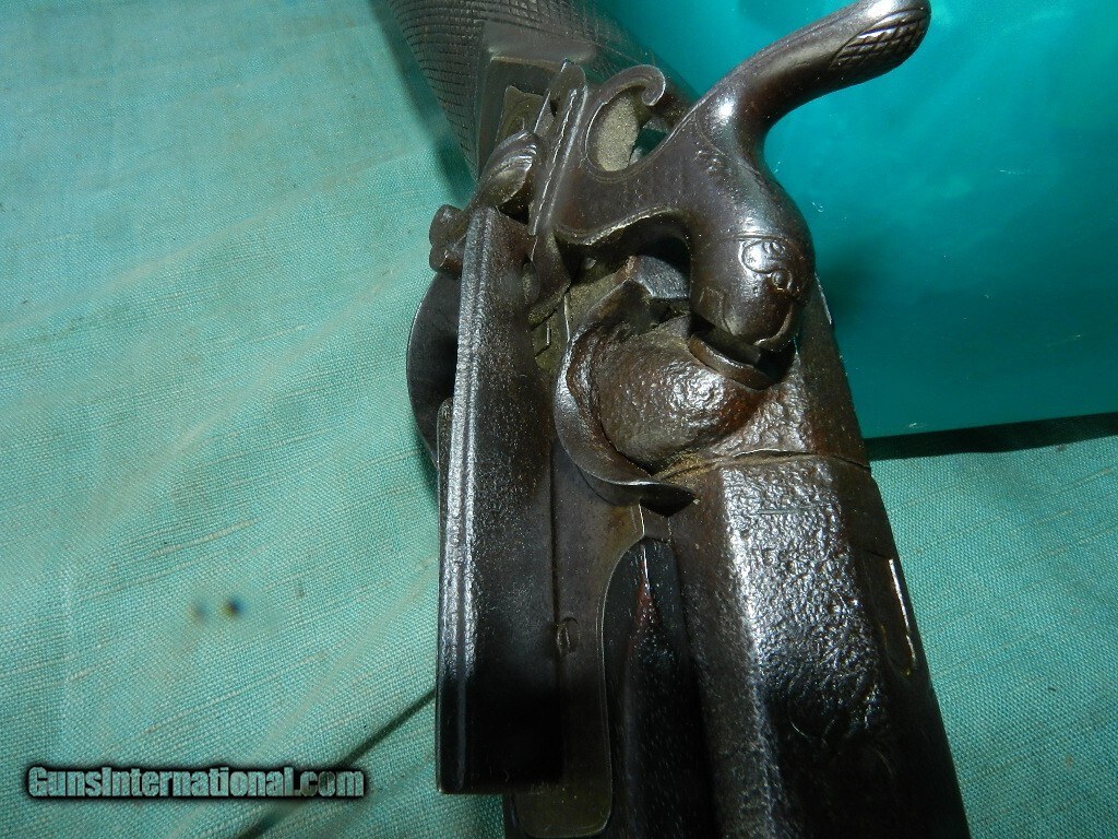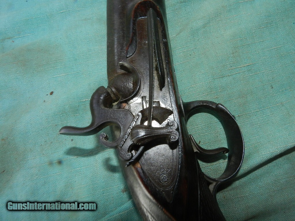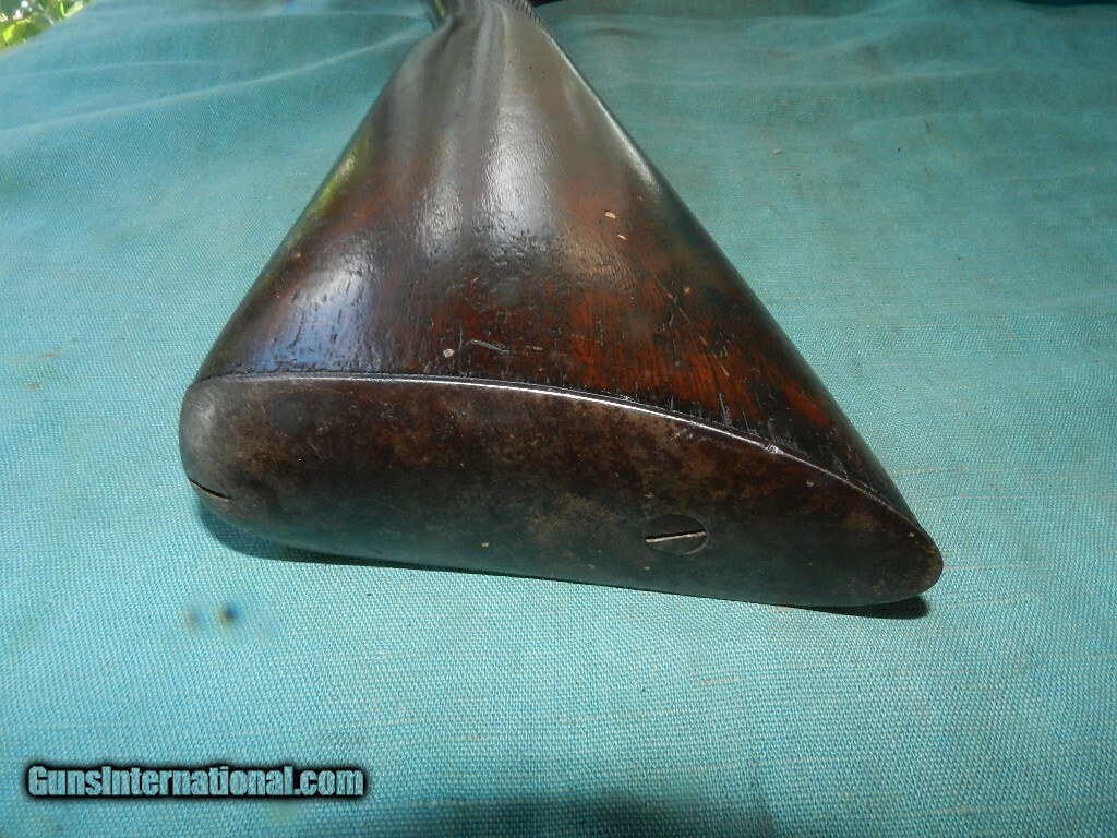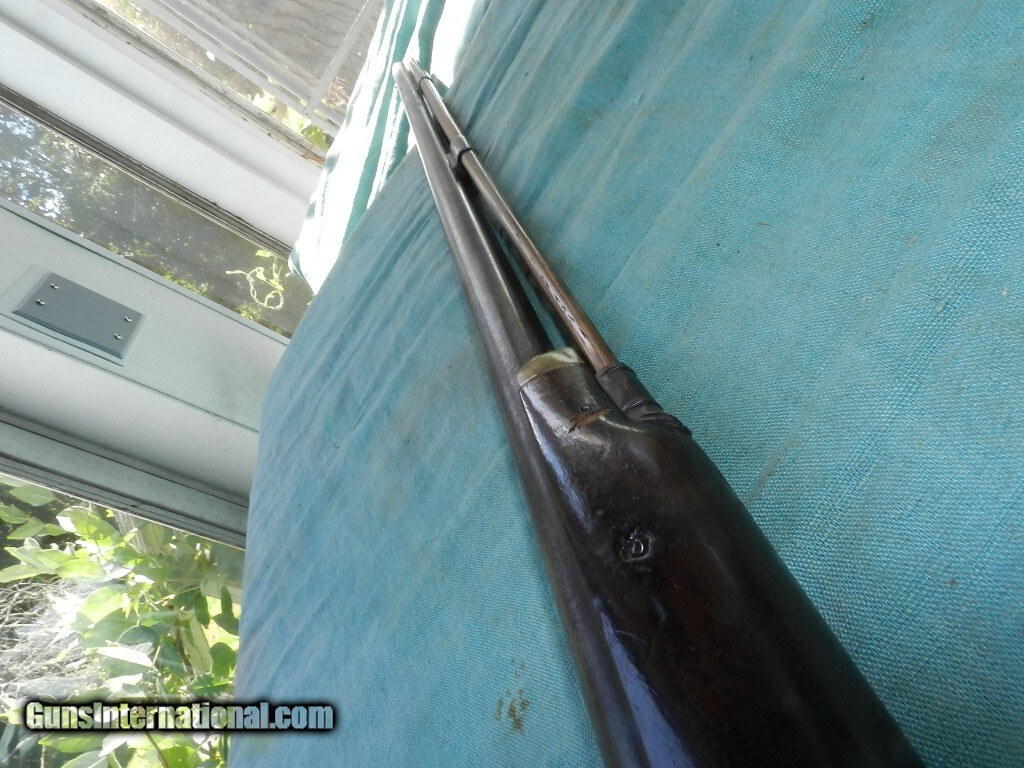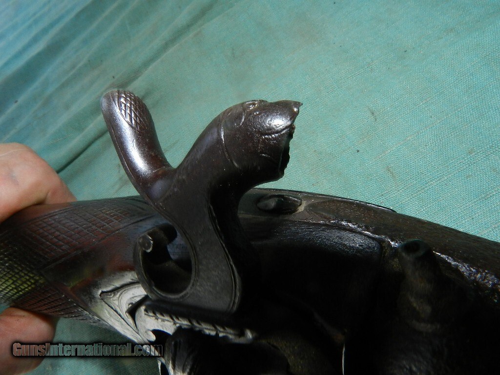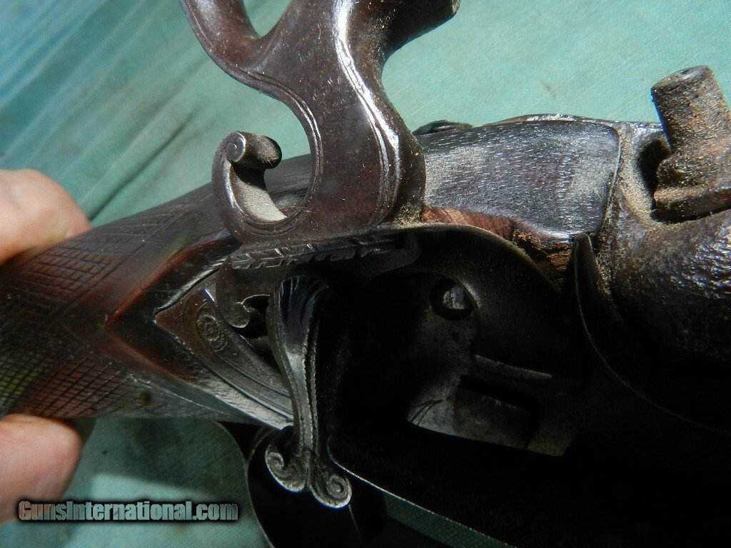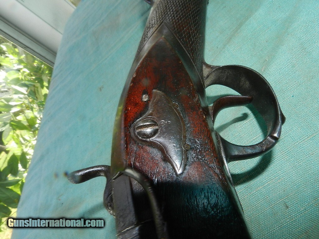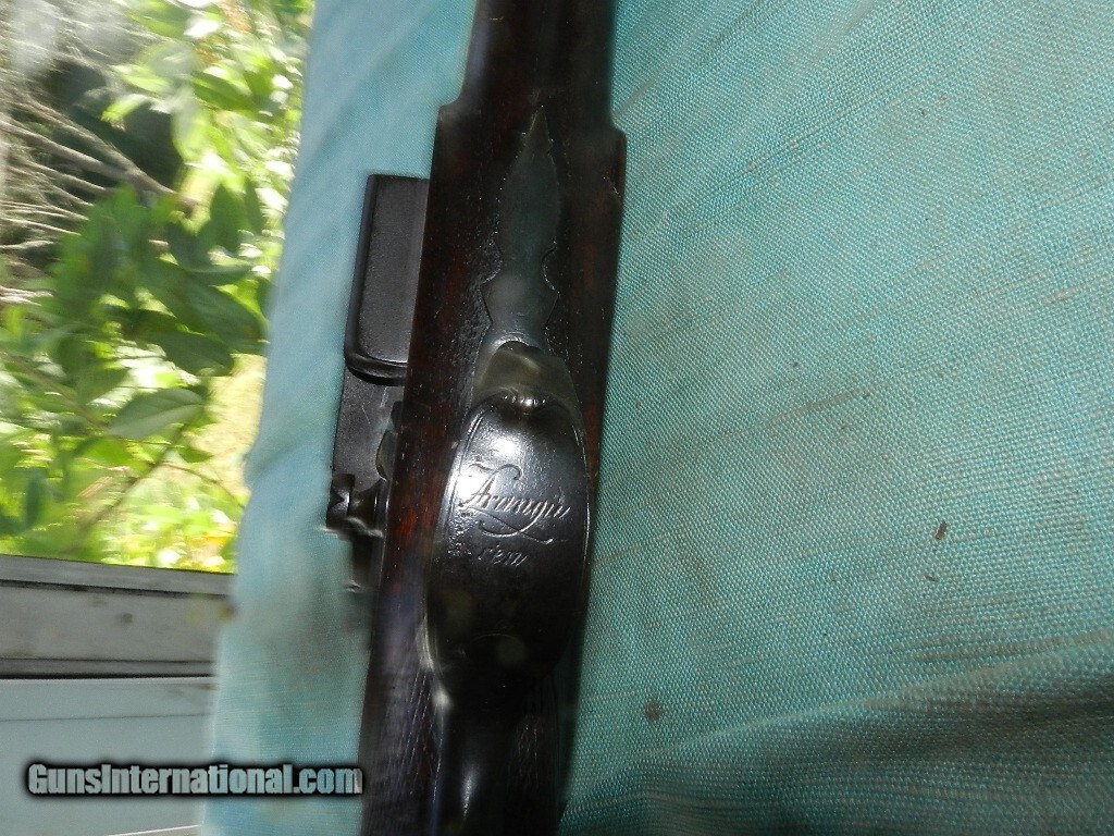 Description: With a 14 bore,and a 35” barrel with a moderately oxidized bore. The metal surfaces of this Patilla-lock fowler are mostly a mix of deep gunmetal and plum-brown patina with scattered areas of light to perhaps moderate pitting. There are some fancy tarnished silver inlays around the breech and a maker’s touchmark that is difficult to discern, the barrel also inlaid in silver with “En Eybar”. The lockplate and triggerguard are both inscribed with the town name “Aranguren” and the lock is quite nicely made with dog’s head hammer with fancy chiseled accents and nicely sculpted bridle. The checkered walnut halfstock remains in very good condition with scattered light scuffs, dings and a thin 5 1/2” crack along the underside of forend, abiut unoticable. A hickory ramrod is present and the arm is sighted with a silver blade front sight flanked by a silver inlaid arrow. The lock seems to function normally. A rather nice quality Spanish fowler. When buying a gun always have it examined by a competent gunsmith before shooting. To buy a gun from me you must get a direct email for me, with details, and shipping cost. We don’t have a web site .I prefer money orders or a check. Item ships when funds come in. I try to keep guns affordable, which means I make less money than most dealers. You won’t get altitude sickness, or nose bleed, with my prices! I consistently have the best selection of older guns If you attempt to buy, you must still contact us for details . Best to email to buy. Sometimes a local person can stop buy and purchase before the gun is removed. Sometimes not home to get calls. Some guns are required shipment to a gun dealer near you for a transfer to you when it arrives. Otherwise many older or black powder guns ship to your door. With the widest selection of older guns at great prices, We don’t have a store, and sell on the internet only. I’m easy to get along with. Thank You Antique: Yes Price: $395.00 Contact Seller |