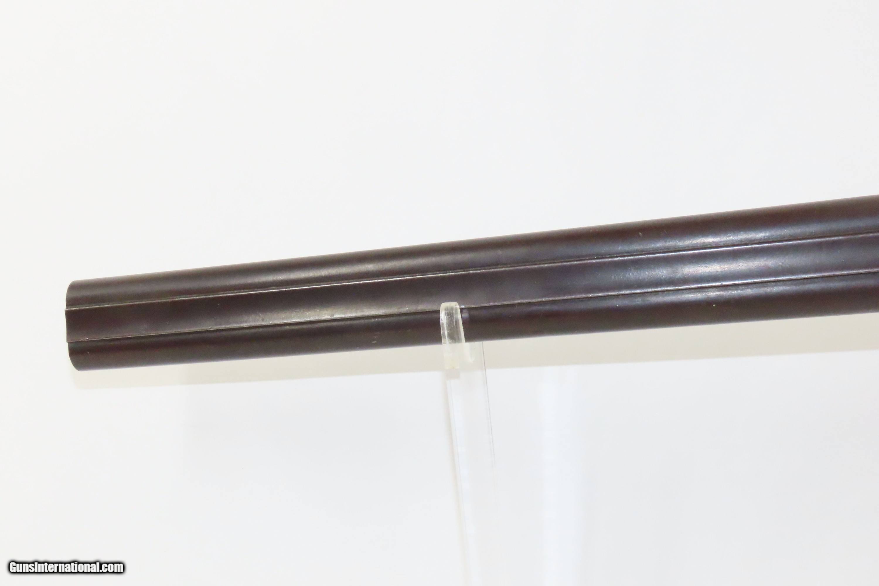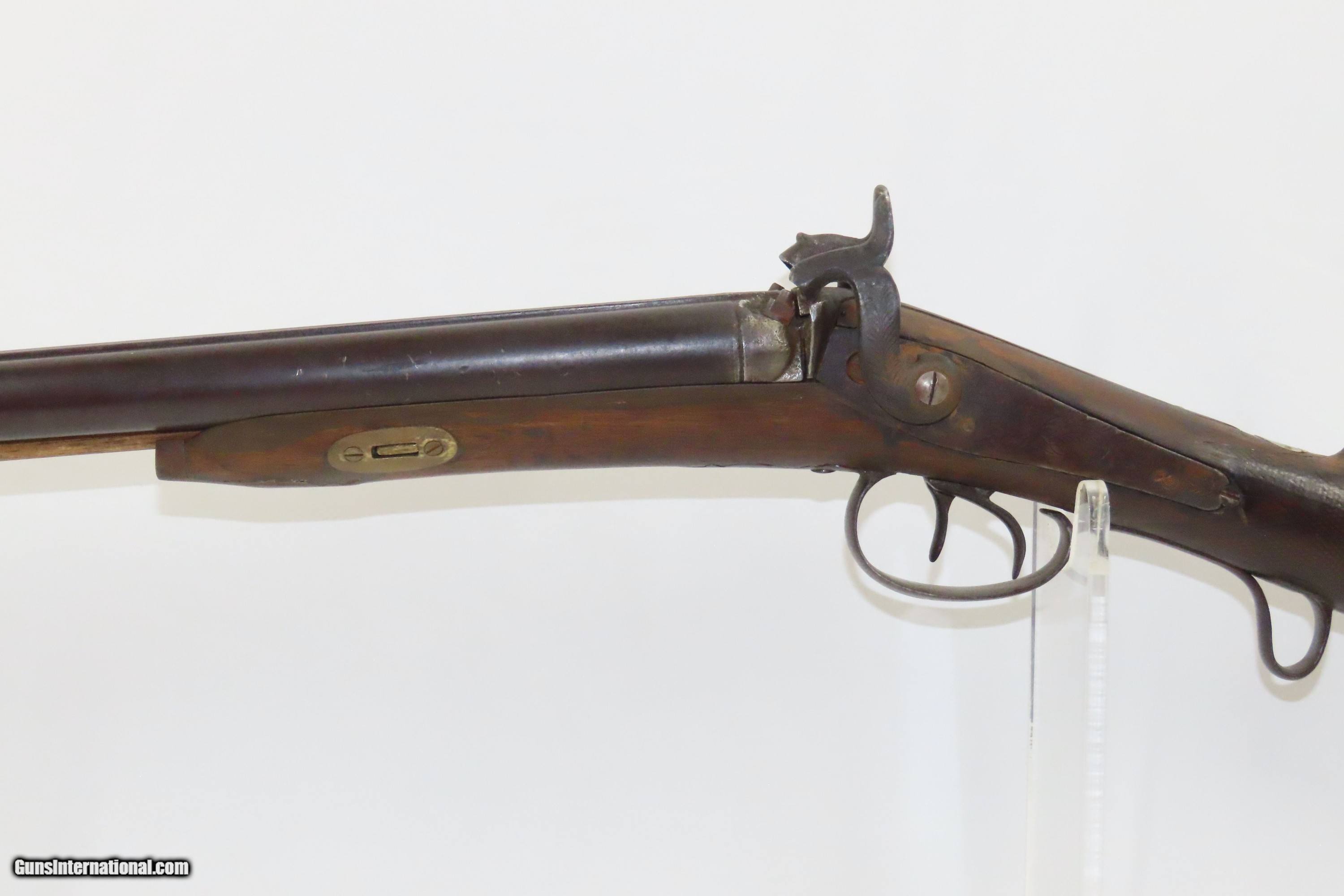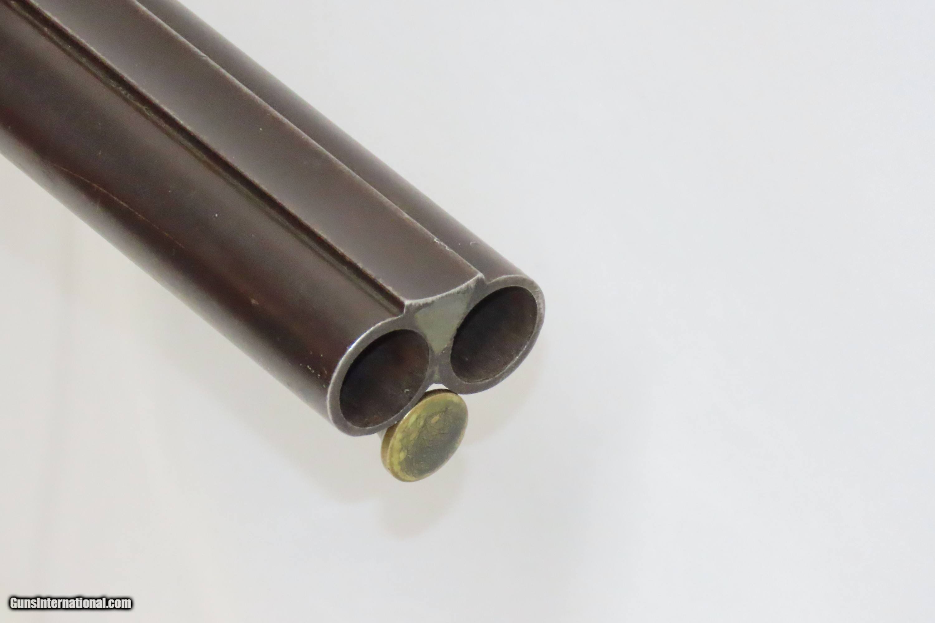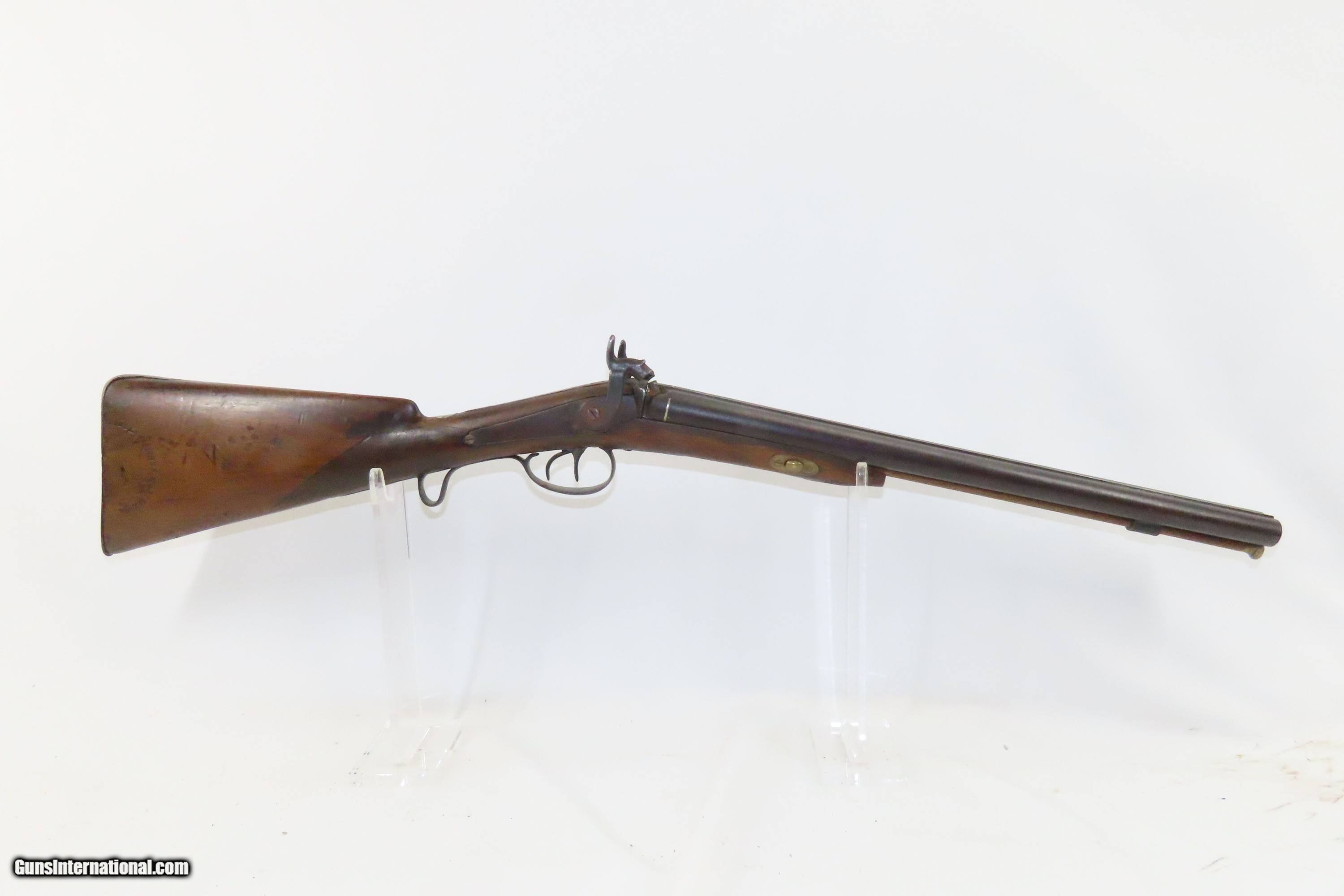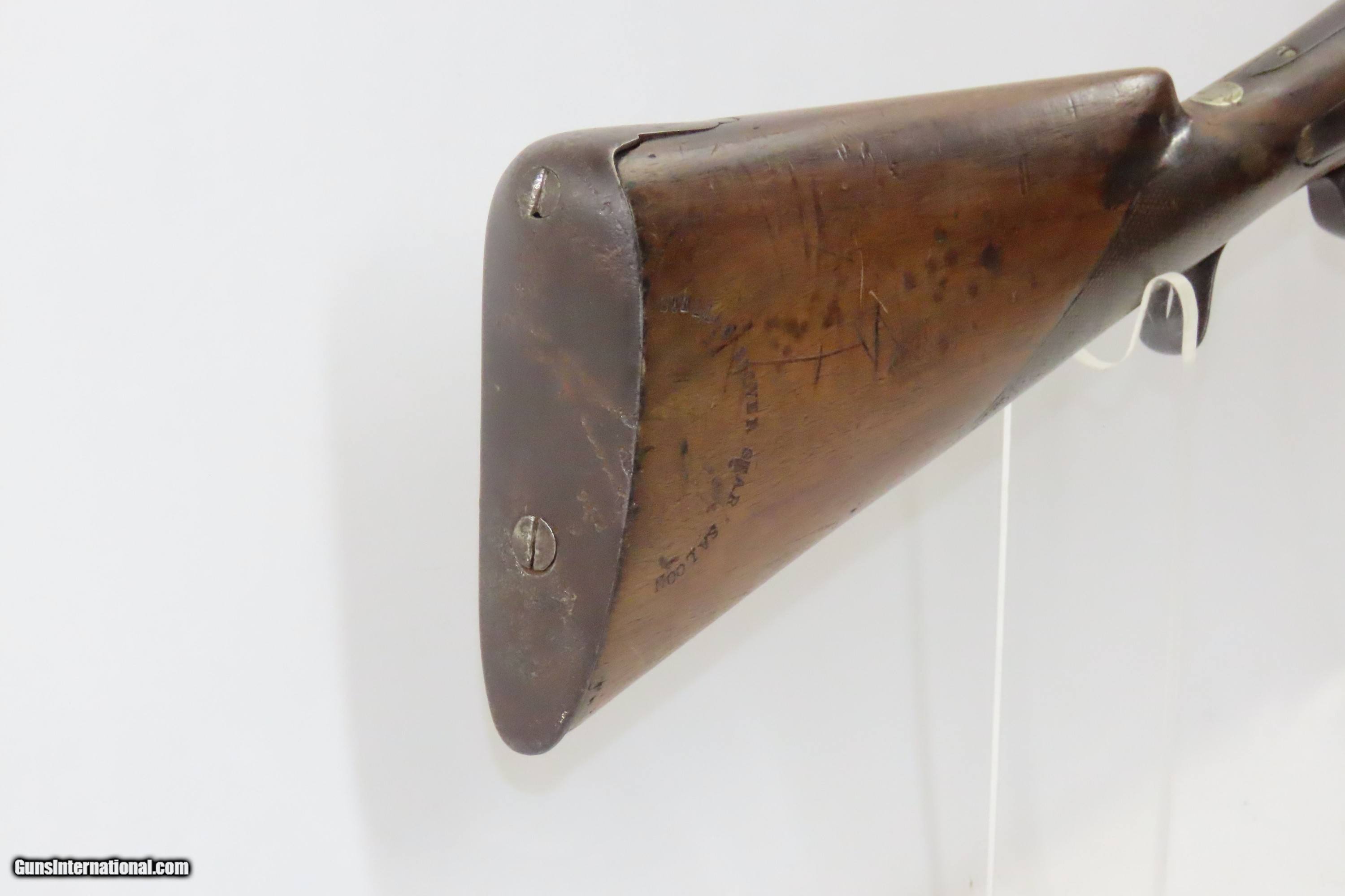Description: “STELLA’S SILVER STAR SALOON” Antique BELGIAN SHOTGUN 16 Ga Double Barrel Bar Style Percussion Shotgun c1860s Here we present an antique Belgian Double Barrel Side by Side Percussion Shotgun, marked “STELLA’S SILVER STAR SALOON”, manufactured circa the 1860s in Liege, Belgium. During this era, there were many English and Belgian gunmakers who were capitalizing on the eager markets in the United States. This 16 gauge scattergun is marked “Stella’s Silver Star Saloon” on the buttstock. Shotguns, shortened ones especially, were used to keep the peace in many a saloon back in the Wild West days. When not being used to corral drunk cowboys, it would have been a staple of most homesteads hanging over the mantle during the tumultuous times of the mid-1800s or riding “shotgun” on coaches by couriers. The overall condition is fair. Dark patina throughout. The actions are strong. The bores are dim and smooth. Barrels shortened. The stock has been extensively repaired with epoxy in the forend, around the locks, and repaired at the wrist. Own the original! This is a legitimate antique and not a reproduction. Barrel: 18-1/2 inches. Caliber: 16 Gauge Overall condition as seen in photos. Very Fast. Very Safe. FREE SHIPPING WORLDWIDE. Delivered directly to your door by express mail! ancestryguns $1400 #234083 SOLD Antique: Yes |