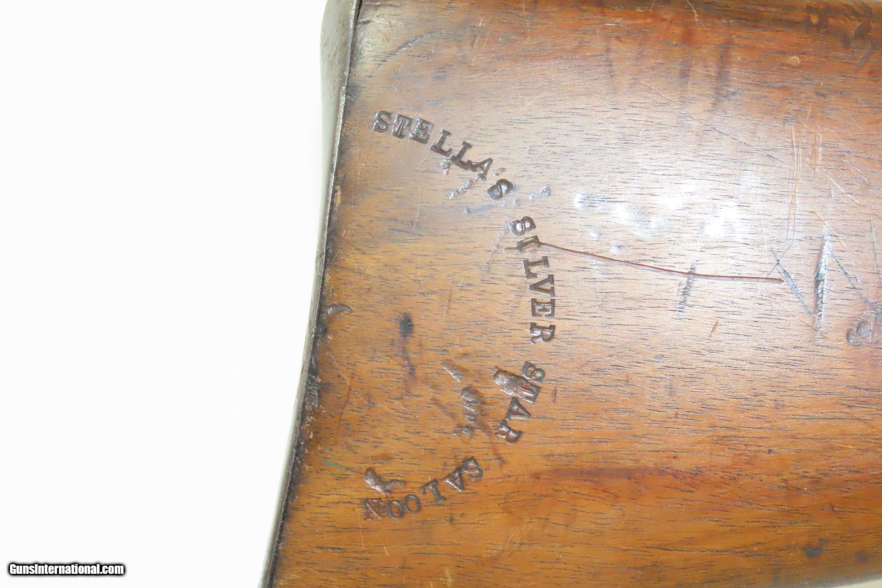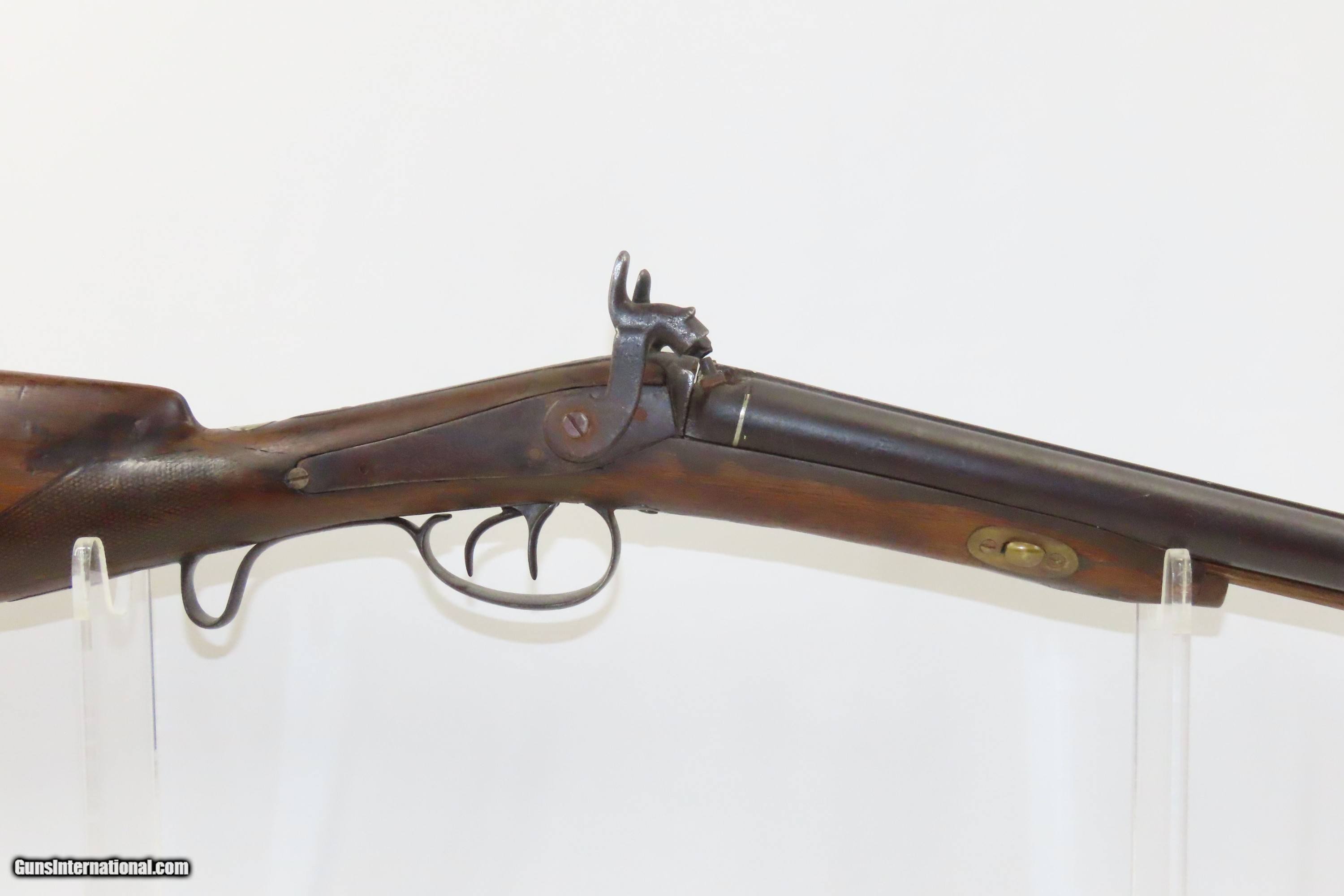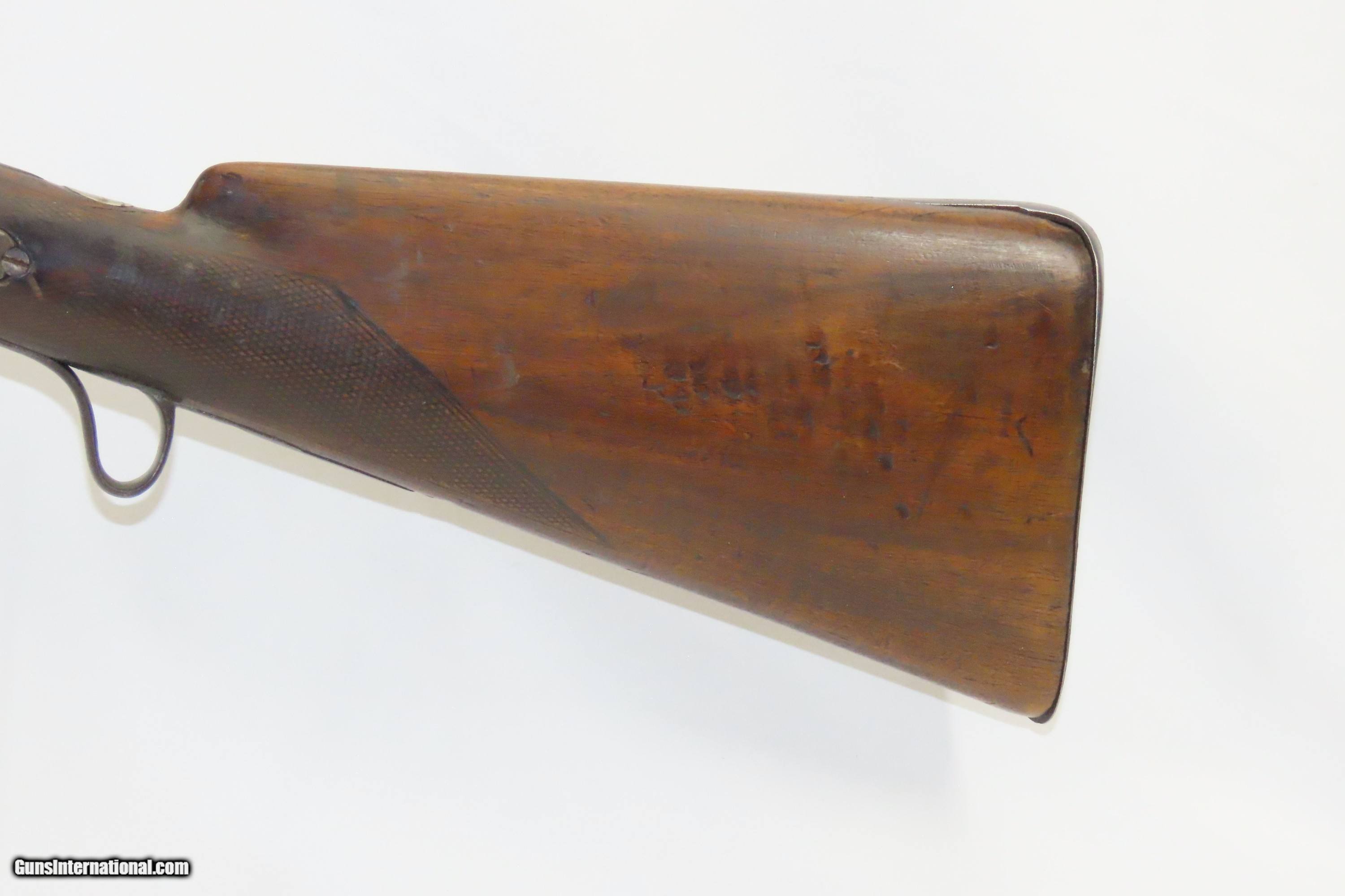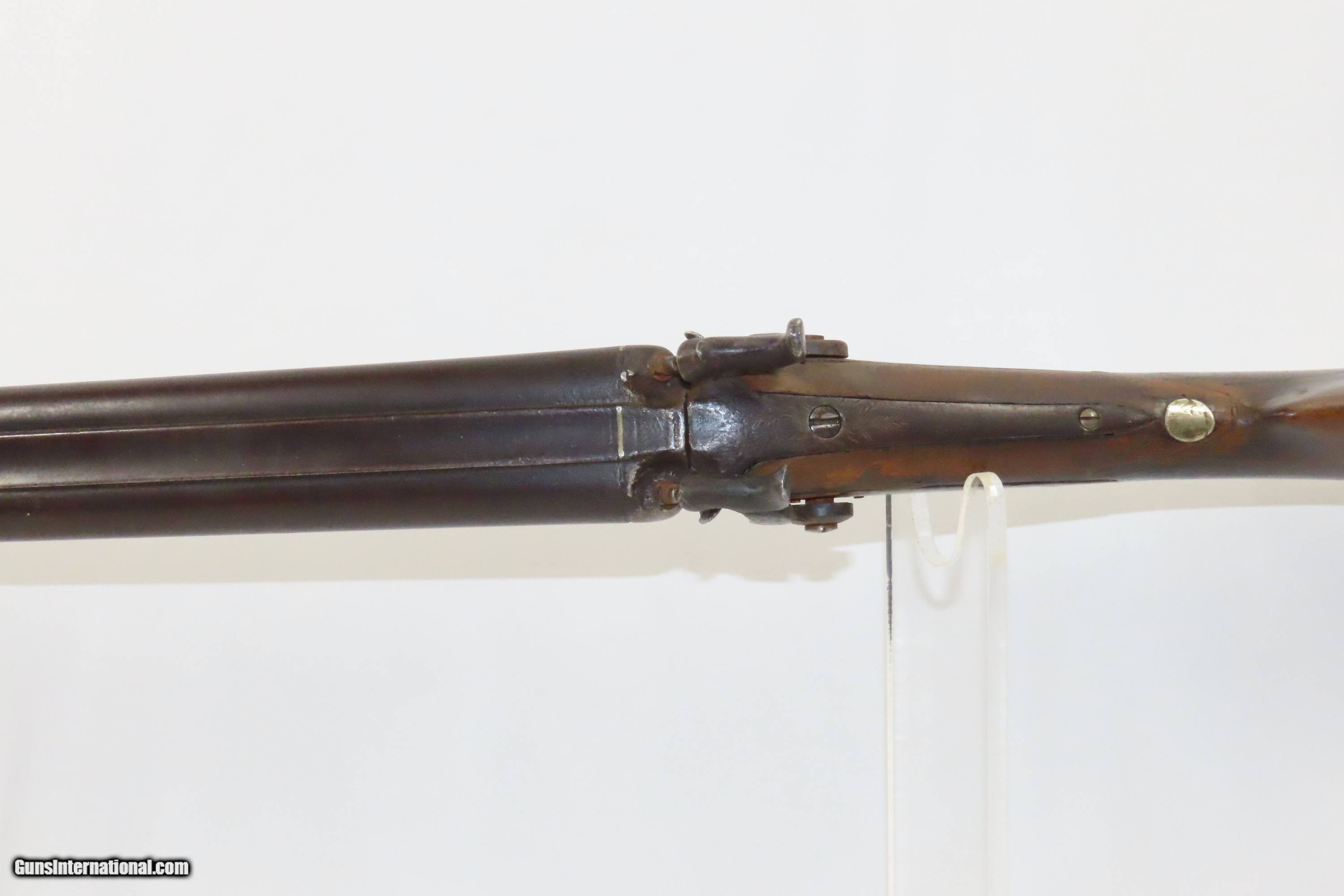 Description: “STELLA’S SILVER STAR SALOON” Antique BELGIAN SHOTGUN 16 Ga Double Barrel Bar Style Percussion Shotgun c1860s Here we present an antique Belgian Double Barrel Side by Side Percussion Shotgun, marked “STELLA’S SILVER STAR SALOON”, manufactured circa the 1860s in Liege, Belgium. During this era, there were many English and Belgian gunmakers who were capitalizing on the eager markets in the United States. This 16 gauge scattergun is marked “Stella’s Silver Star Saloon” on the buttstock. Shotguns, shortened ones especially, were used to keep the peace in many a saloon back in the Wild West days. When not being used to corral drunk cowboys, it would have been a staple of most homesteads hanging over the mantle during the tumultuous times of the mid-1800s or riding “shotgun” on coaches by couriers. The overall condition is fair. Dark patina throughout. The actions are strong. The bores are dim and smooth. Barrels shortened. The stock has been extensively repaired with epoxy in the forend, around the locks, and repaired at the wrist. Own the original! This is a legitimate antique and not a reproduction. Barrel: 18-1/2 inches. Caliber: 16 Gauge Overall condition as seen in photos. Very Fast. Very Safe. FREE SHIPPING WORLDWIDE. Delivered directly to your door by express mail! ancestryguns $1400 #234083 SOLD Antique: Yes |