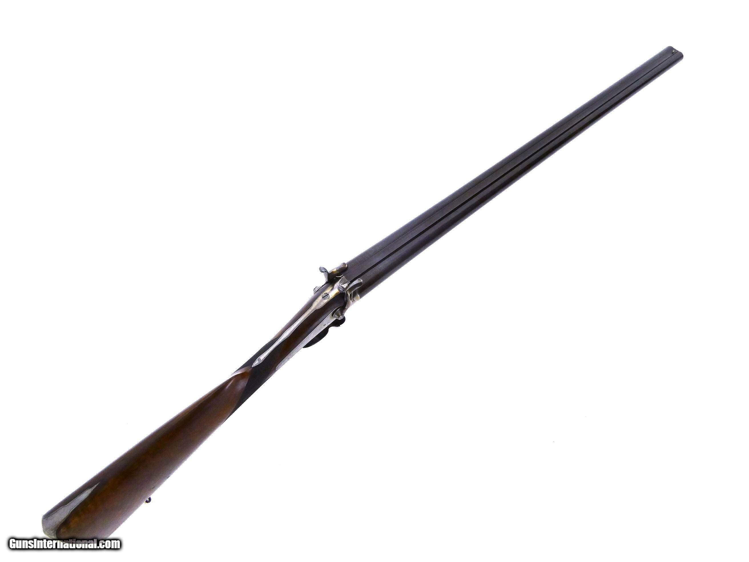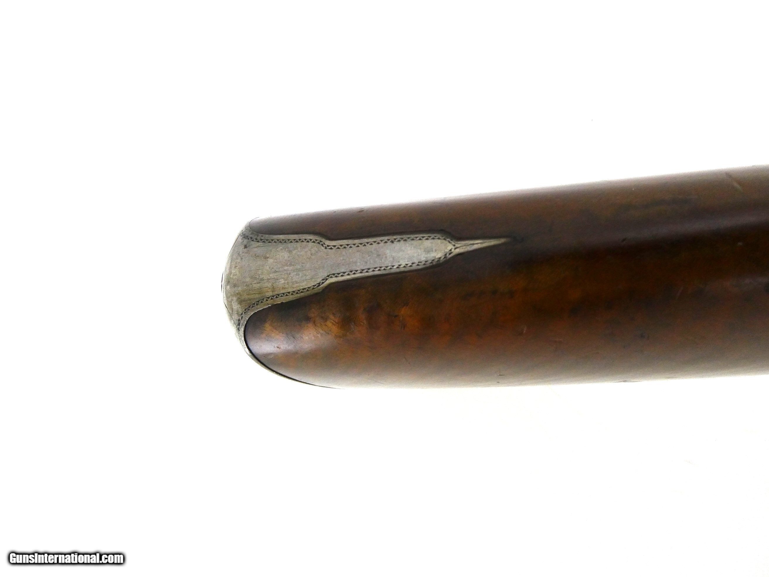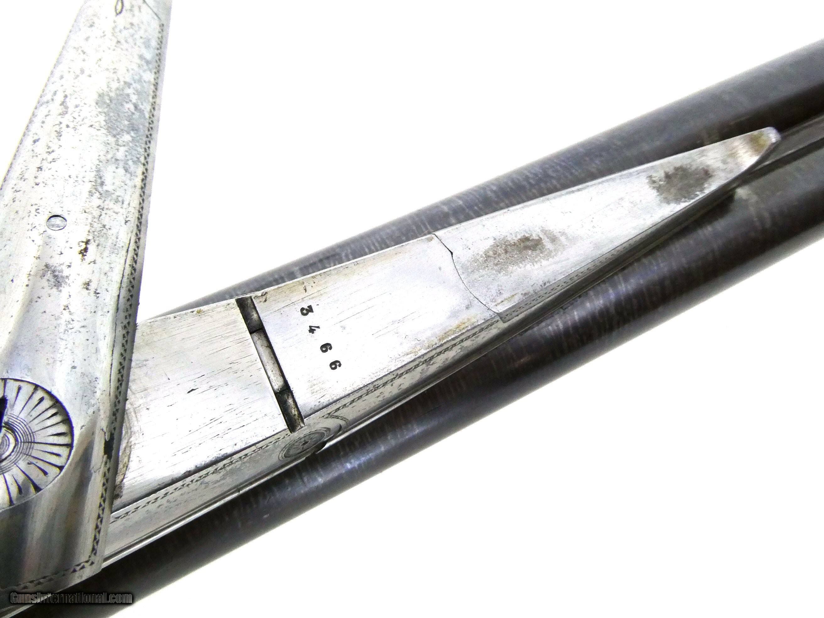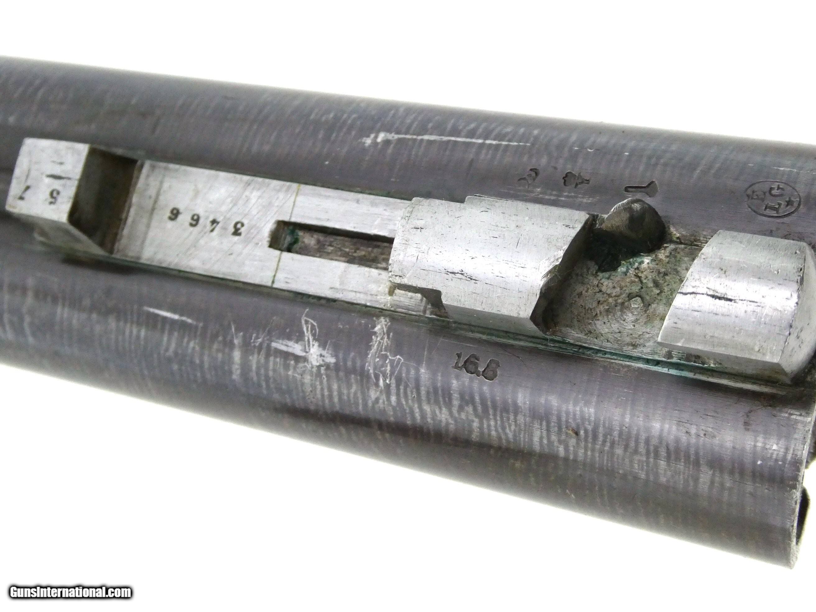 Description: Very nice antique pinfire shotgun by Gottlieb Rickenbach of Basel (1834-1910). System Lancaster or T-lock action, double trigger, 29.7" Damascus steel barrels with Damascus rib and Belgian (Liege) proof marks. Good bore condition, straight English walnut stock with some traces of handling. Nickle-plated locks and furniture with some scattered stains and light frosting. Left hammer with an old repair. Very fine light engraving on locks and furniture. OAL=46", LOP=14", good original finish on the barrels. Add this very light and elegant belle epoque 16 gauge shotgun to your collection. Antique: Yes Shotgun Gauge: 16 Gauge Price: $1,079.00 Shipping: $75.00 Contact Seller |