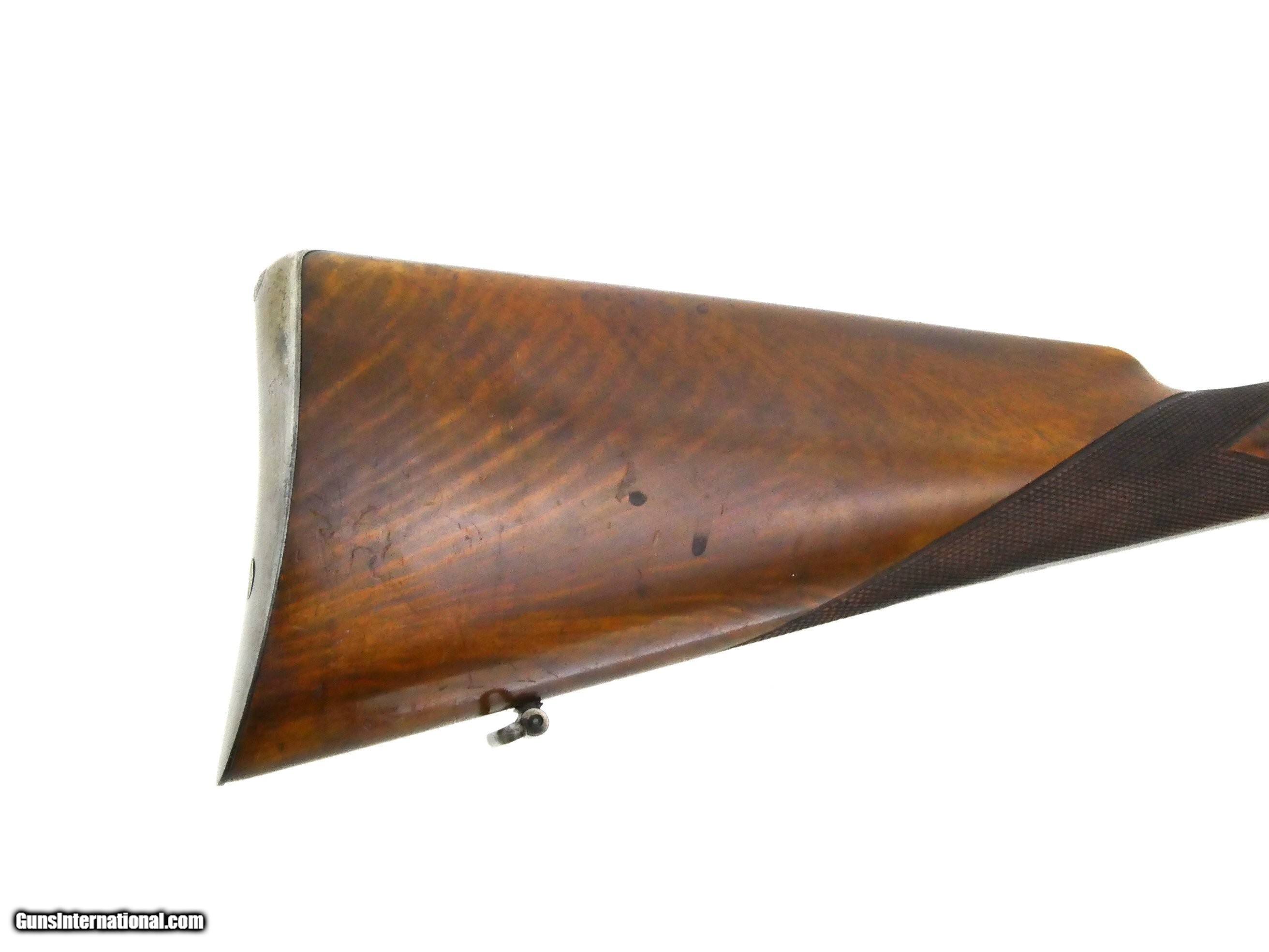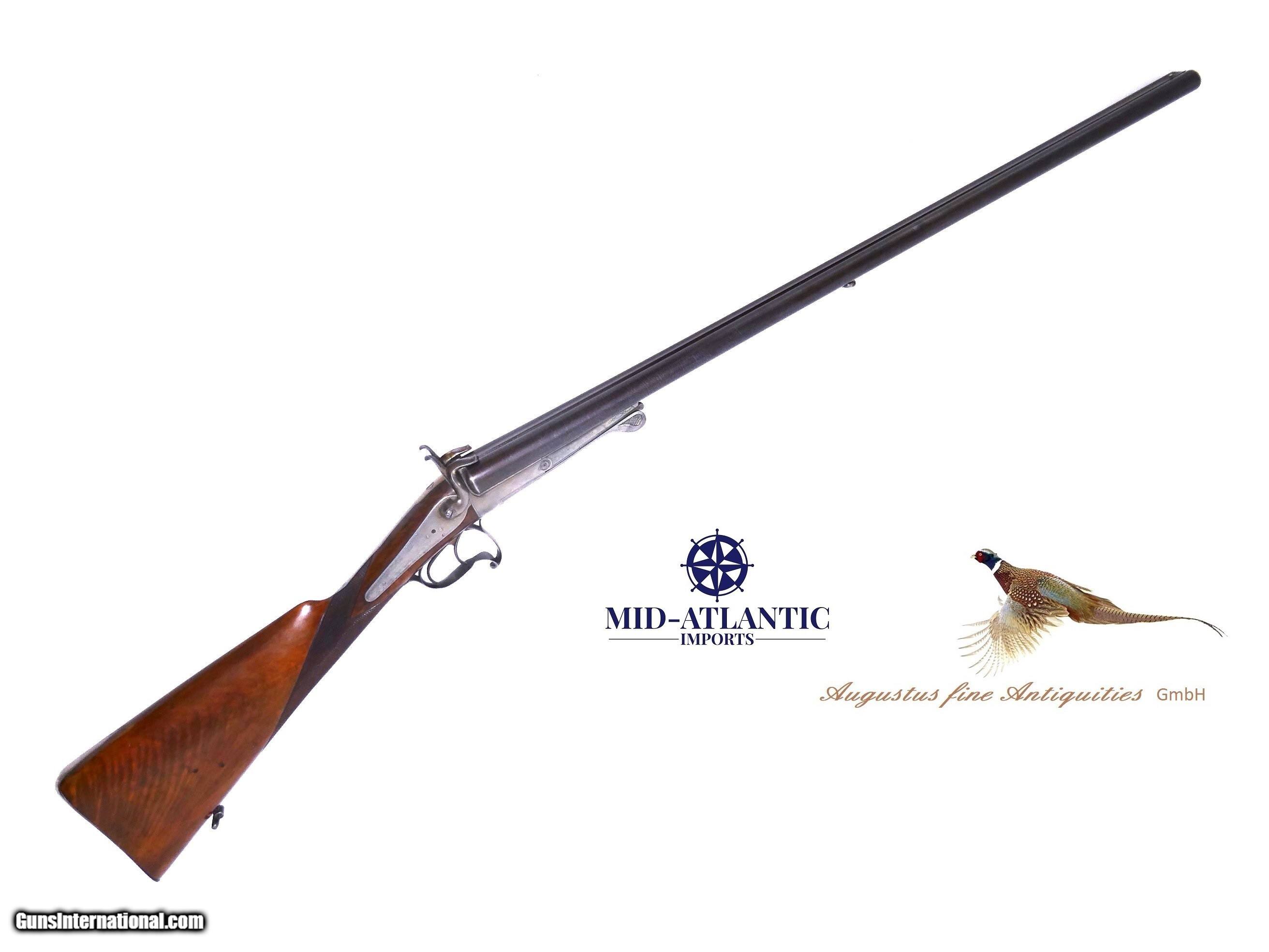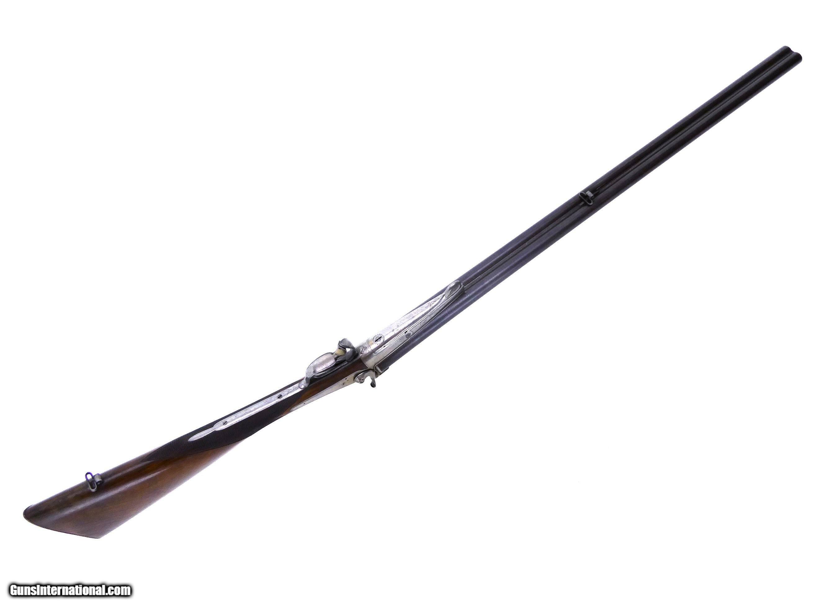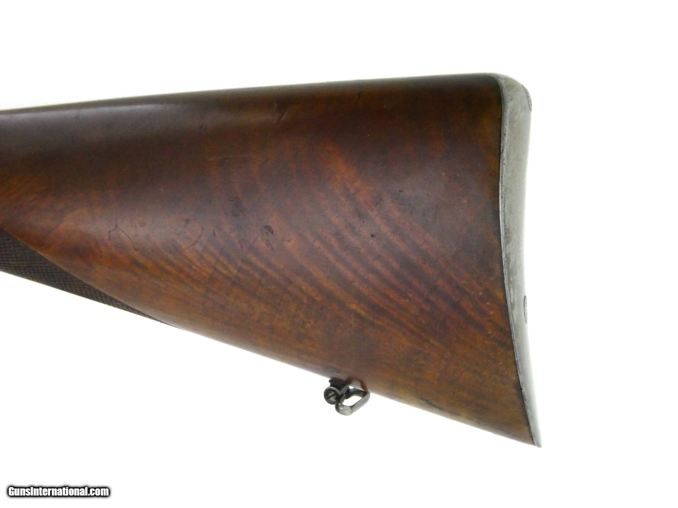 Description: Very nice antique pinfire shotgun by Gottlieb Rickenbach of Basel (1834-1910). System Lancaster or T-lock action, double trigger, 29.7" Damascus steel barrels with Damascus rib and Belgian (Liege) proof marks. Good bore condition, straight English walnut stock with some traces of handling. Nickle-plated locks and furniture with some scattered stains and light frosting. Left hammer with an old repair. Very fine light engraving on locks and furniture. OAL=46", LOP=14", good original finish on the barrels. Add this very light and elegant belle epoque 16 gauge shotgun to your collection. Antique: Yes Shotgun Gauge: 16 Gauge Price: $1,079.00 Shipping: $75.00 Contact Seller |