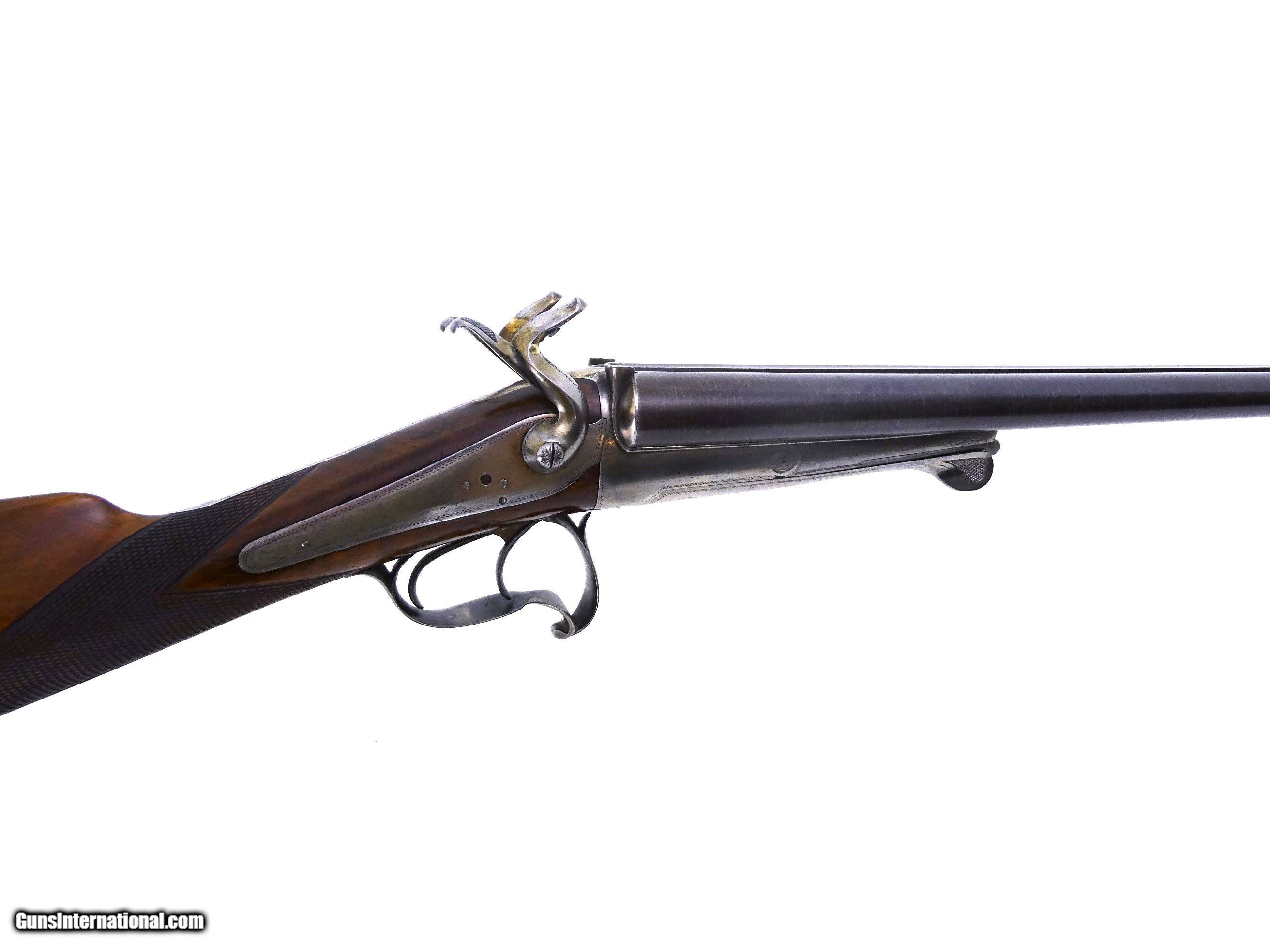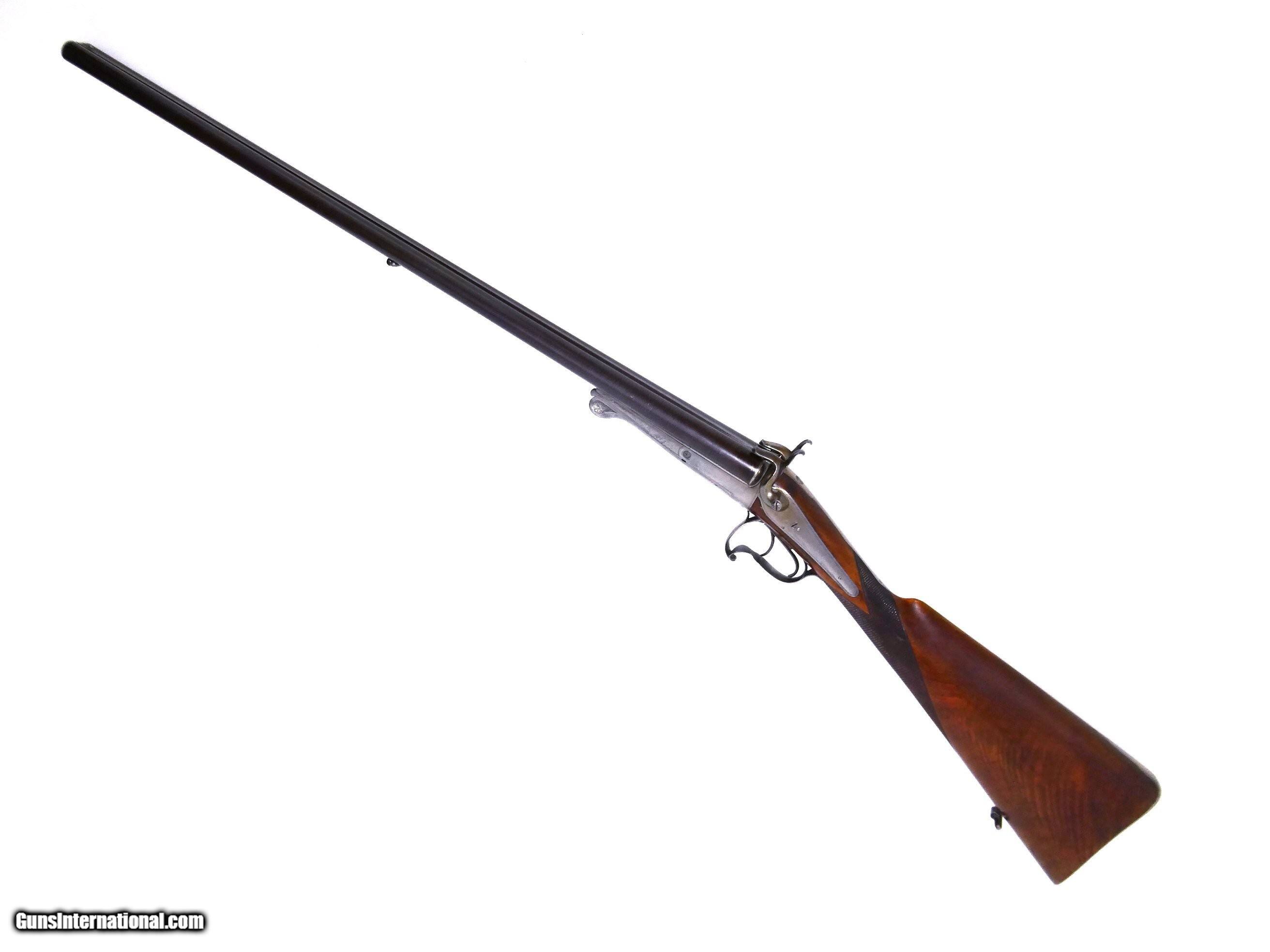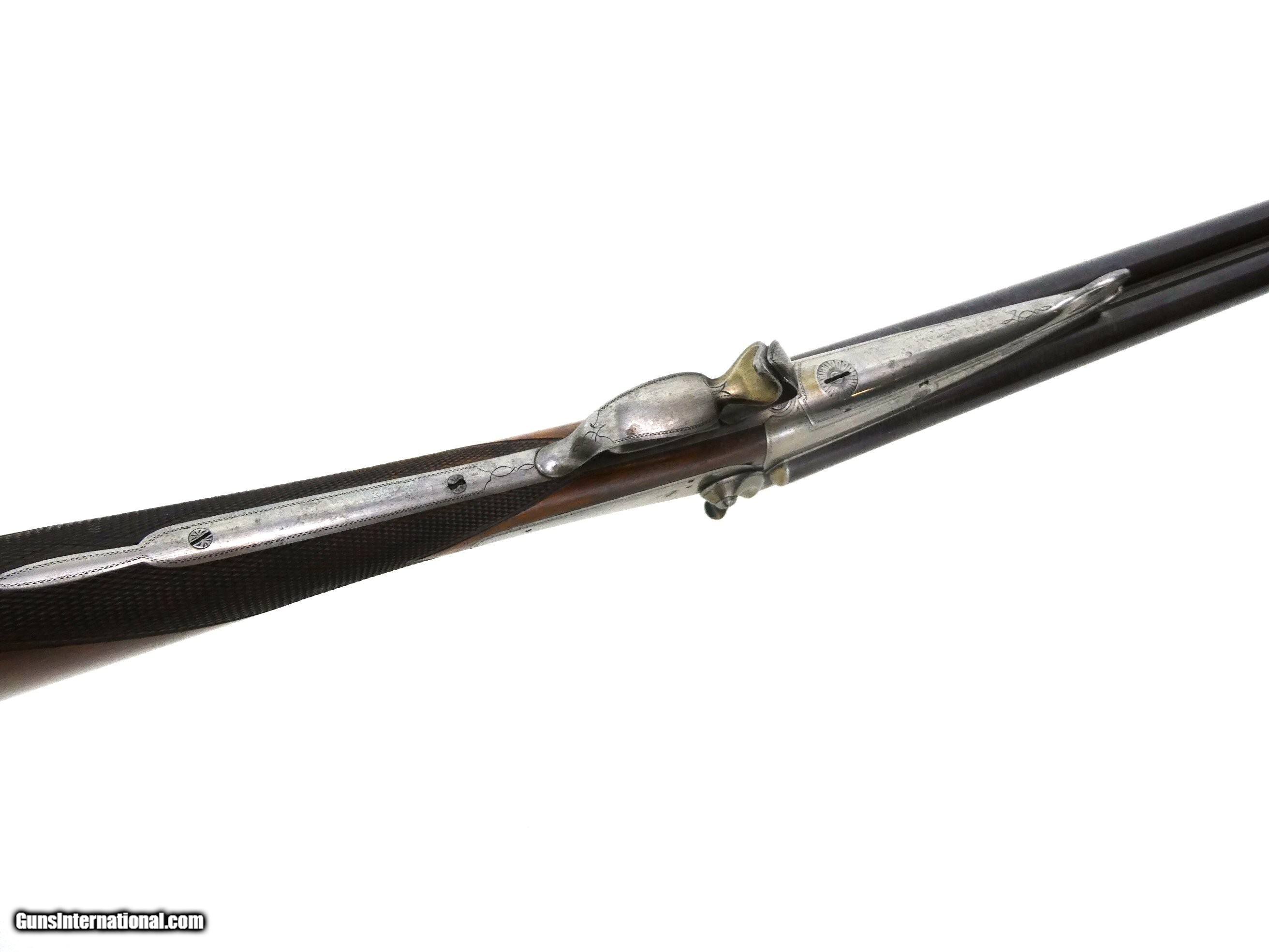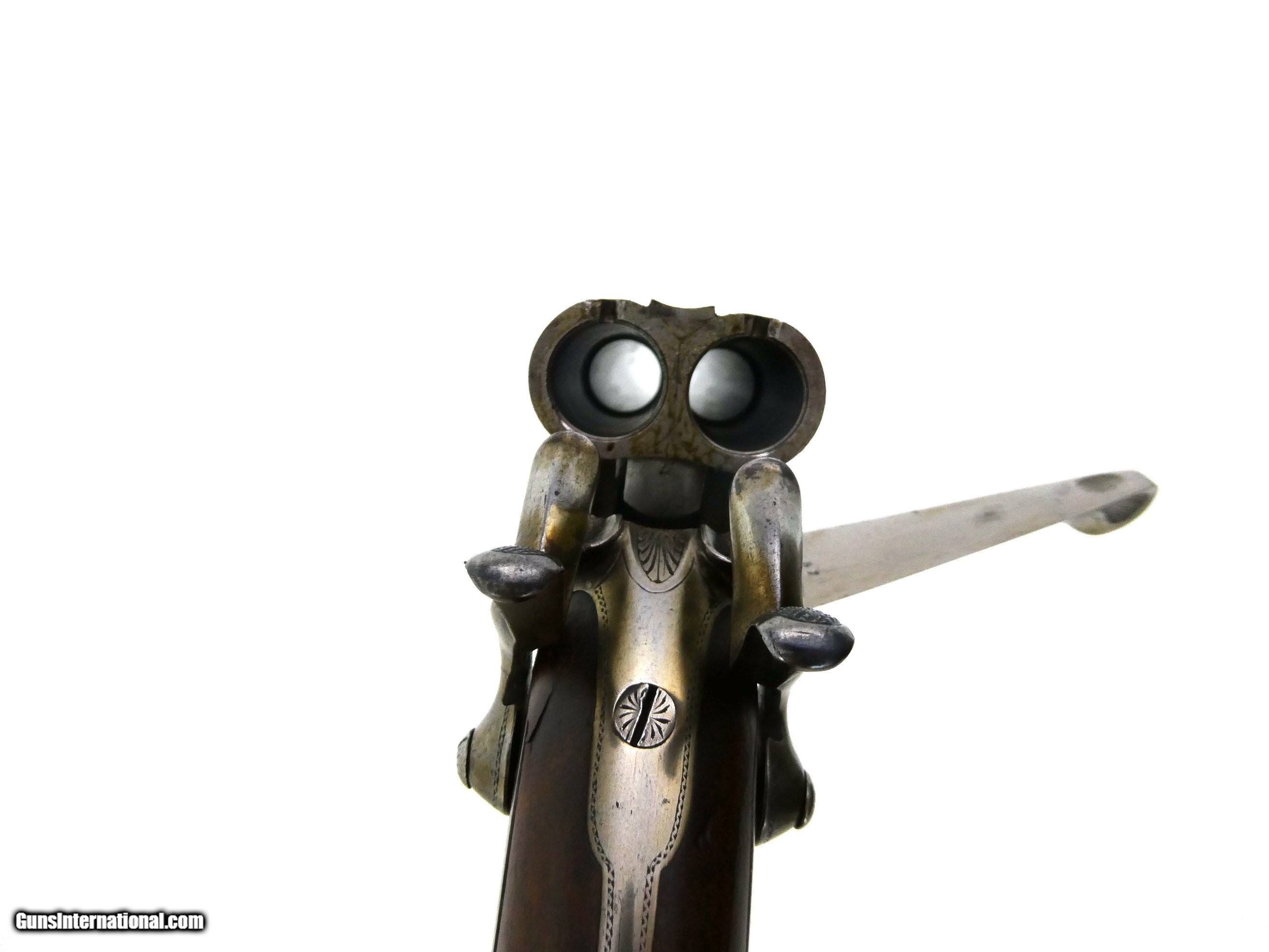 Description: Very nice antique pinfire shotgun by Gottlieb Rickenbach of Basel (1834-1910). System Lancaster or T-lock action, double trigger, 29.7" Damascus steel barrels with Damascus rib and Belgian (Liege) proof marks. Good bore condition, straight English walnut stock with some traces of handling. Nickle-plated locks and furniture with some scattered stains and light frosting. Left hammer with an old repair. Very fine light engraving on locks and furniture. OAL=46", LOP=14", good original finish on the barrels. Add this very light and elegant belle epoque 16 gauge shotgun to your collection. Antique: Yes Shotgun Gauge: 16 Gauge Price: $1,079.00 Shipping: $75.00 Contact Seller |