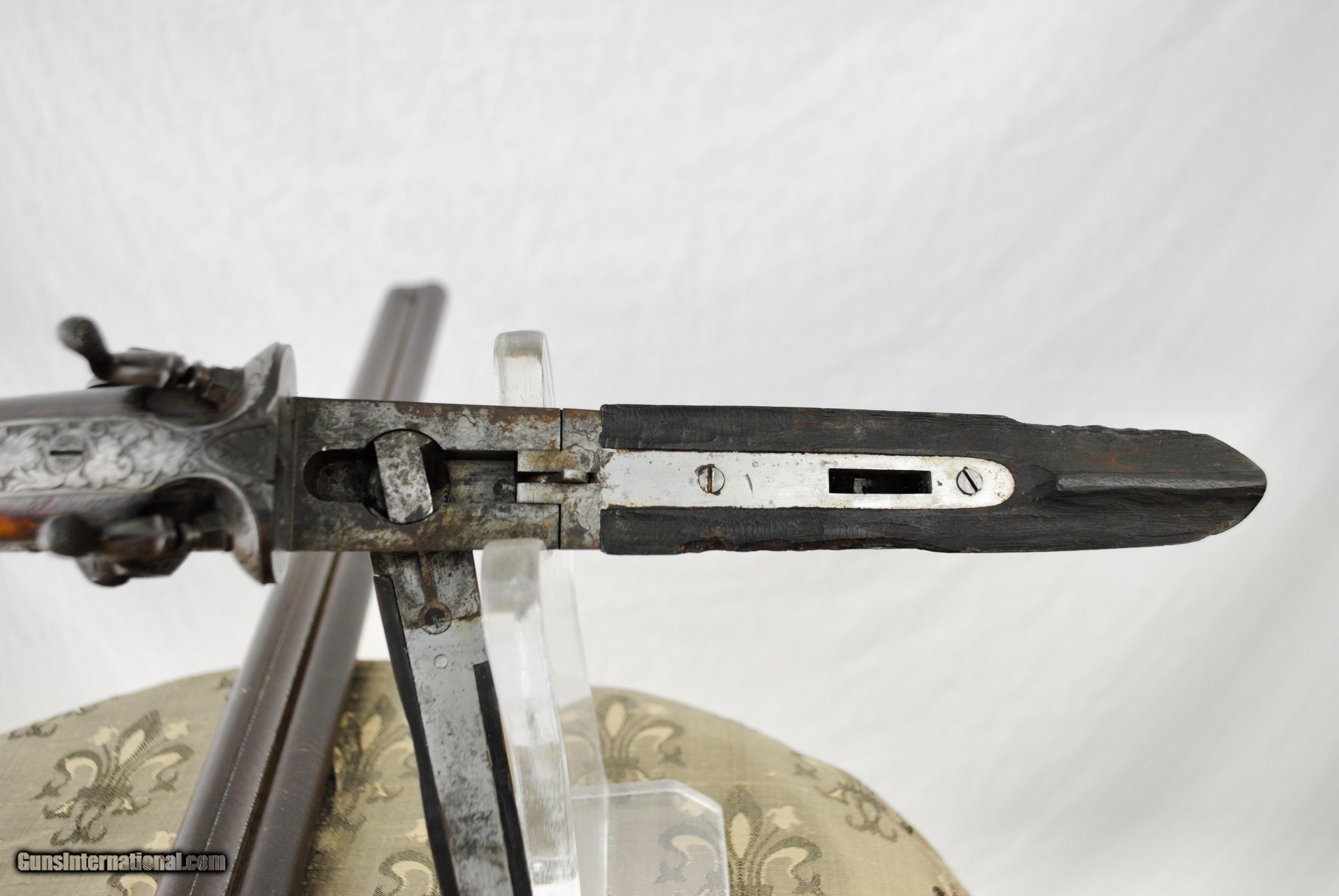 Description: Antique German made A. Zapf 16 gauge with full length Briley 28 gauge tubes. This maker is still in business today in Germany and has been in business since 1795. Elegant Lefaucheux bolting system. Floral and game scene engraved. Back action locks with rebounding hammers. Horn and metal trigger guard. Damascus barrels are 31 1/2" and have 98% of the original finish. The Briley tubes have 4 choke tubes included, skeet, skeet, IC and Mod. Tools as pictures are also included. No cracks to the stock. No loose ribs. Tight on face. Weight of the gun is 6 LBS 14 3/8 OZ. LOP is 13 3/4". Drop at comb - 1 5/16". Drop at heel - 2 5/8". Shipping is $50 and can be sent directly as loacl law allows. SOLD Antique: Yes Shotgun Gauge: 28 Gauge |