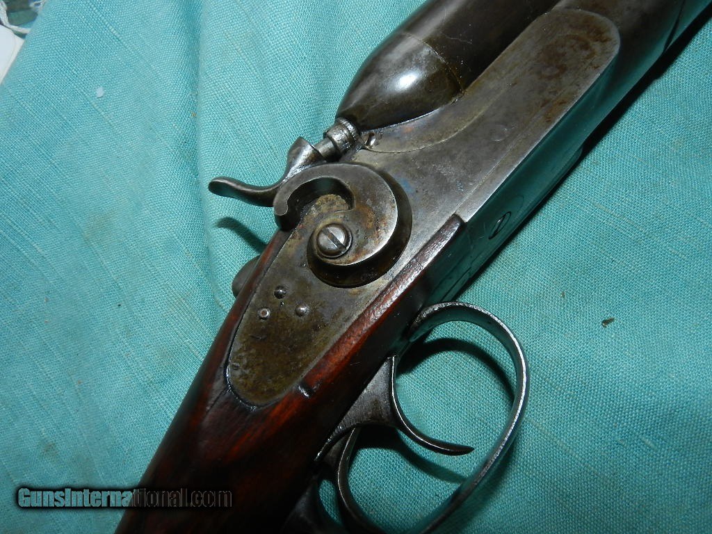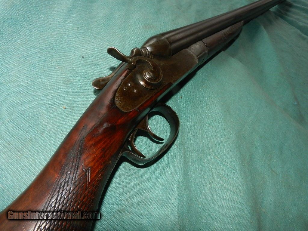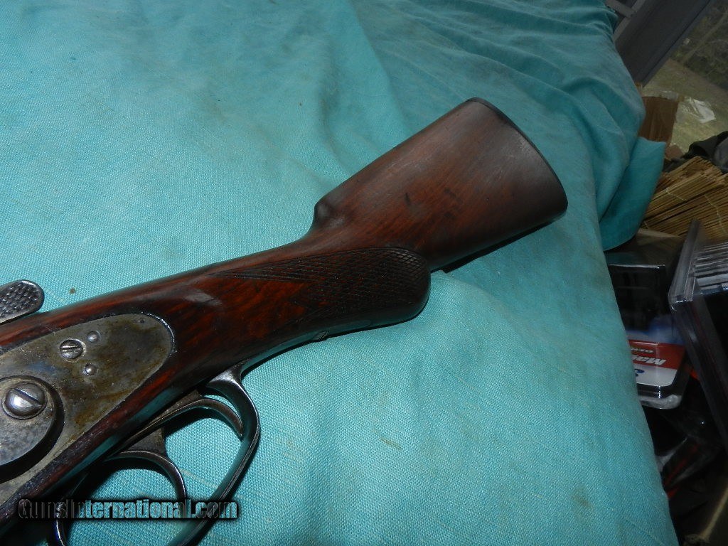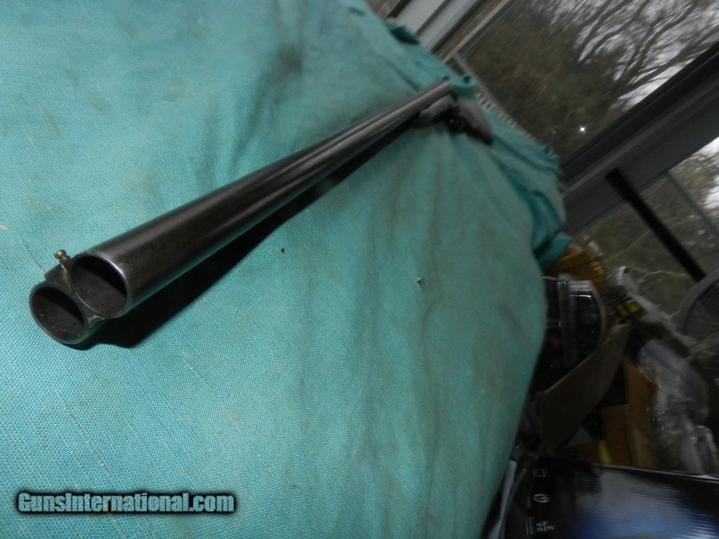 Description: This American 12ga double coach shotgun has 30" steel barrels chambered for the brass shell of about 2 3/4" and chokes of : right IM and left is a super , super tight Cyl. measuring about .670" inside the bore. The muzzle barrel ends touch together and doesn't ,look like they had been cut. Has a font brass bead sight that has been there a long time. Even though this may be considered antique it must ship to a C&R or FFL license, no exceptions.The bores are very clean and shiny with very slight speckles near the breech. The American walnut stocks are good, solid with hand checkering and a crack near the top tang from long ago but not loose, or open, and a thin narrwo crakck at the back of the right lock-plate. Both hammer march and work well, and I can see the firing pins. The LOP with an a black hard rubber butt-plate is about 13 1/4". the locks still have strong color case hardening , and the barrels have blue turing to brownish. When buying a gun always have it examined by a competent gunsmith before shooting. To buy a gun from me you must get a direct email for me, with details, and shipping cost. We don’t have a web site .I prefer money orders or a check. Item ships when funds come in. I try to keep guns affordable, which means I make less money than most dealers. You won’t get altitude sickness, or nose bleed, with my prices! I consistently have the best selection of older guns If you attempt to buy, you must still contact us for details . Best to email to buy. Sometimes a local person can stop buy and purchase before the gun is removed. Sometimes not home to get calls. Some guns are required shipment to a gun dealer near you for a transfer to you when it arrives. Otherwise many older or black powder guns ship to your door. With the widest selection of older guns at great prices, We don’t have a store, and sell on the internet only. I’m easy to get along with. Thank You SOLD |
