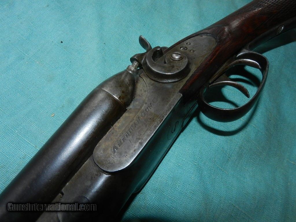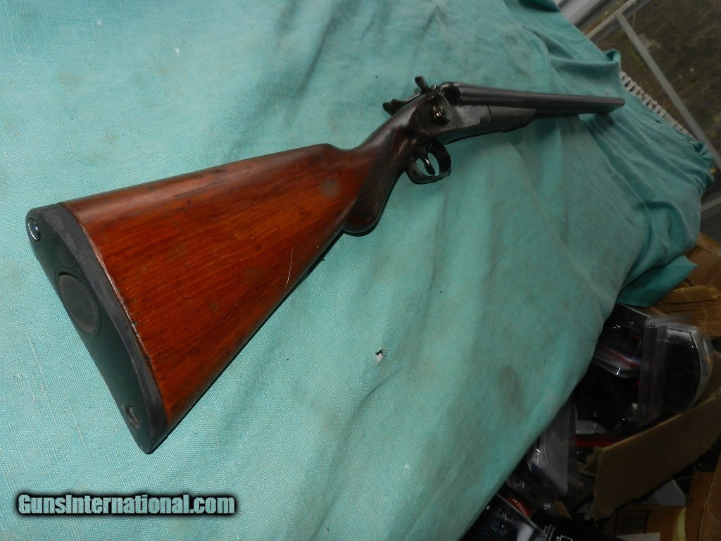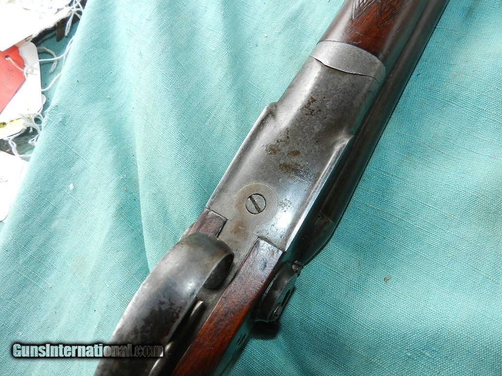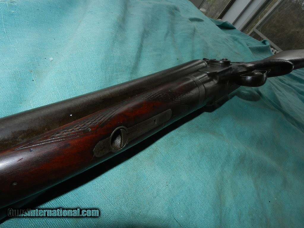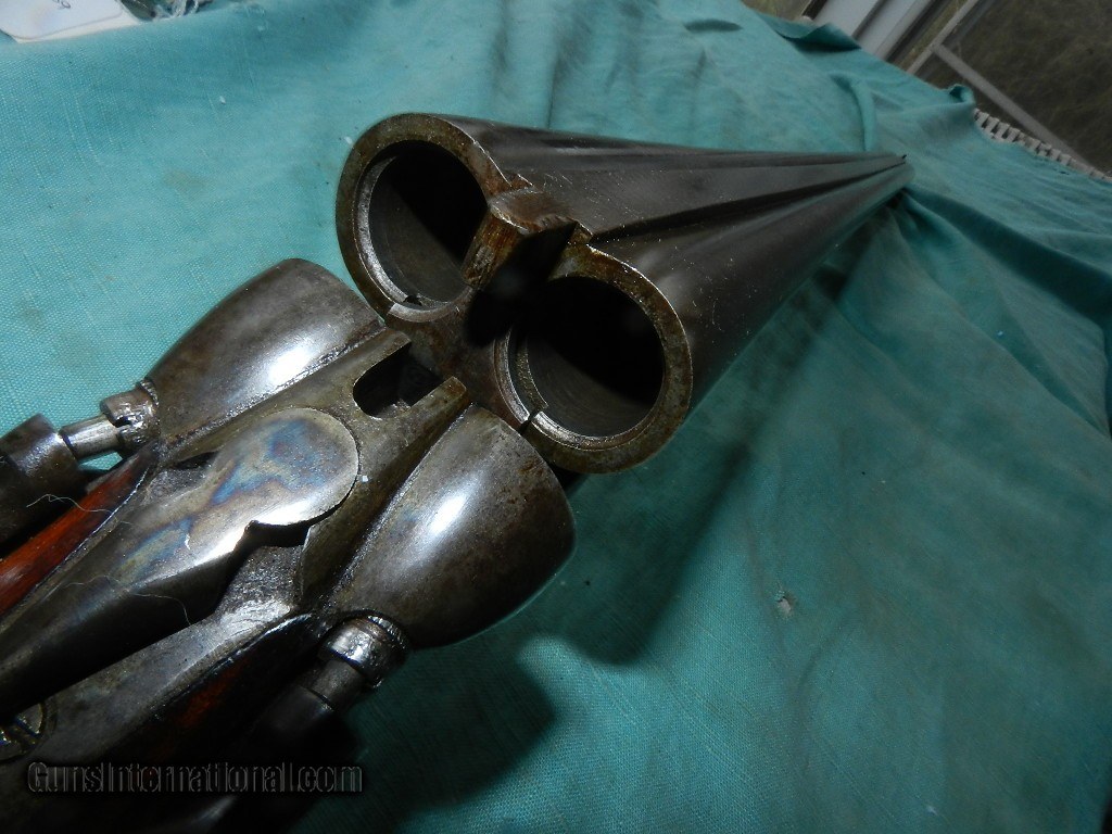 Description: This American 12ga double coach shotgun has 30" steel barrels chambered for the brass shell of about 2 3/4" and chokes of : right IM and left is a super , super tight Cyl. measuring about .670" inside the bore. The muzzle barrel ends touch together and doesn't ,look like they had been cut. Has a font brass bead sight that has been there a long time. Even though this may be considered antique it must ship to a C&R or FFL license, no exceptions.The bores are very clean and shiny with very slight speckles near the breech. The American walnut stocks are good, solid with hand checkering and a crack near the top tang from long ago but not loose, or open, and a thin narrwo crakck at the back of the right lock-plate. Both hammer march and work well, and I can see the firing pins. The LOP with an a black hard rubber butt-plate is about 13 1/4". the locks still have strong color case hardening , and the barrels have blue turing to brownish. When buying a gun always have it examined by a competent gunsmith before shooting. To buy a gun from me you must get a direct email for me, with details, and shipping cost. We don’t have a web site .I prefer money orders or a check. Item ships when funds come in. I try to keep guns affordable, which means I make less money than most dealers. You won’t get altitude sickness, or nose bleed, with my prices! I consistently have the best selection of older guns If you attempt to buy, you must still contact us for details . Best to email to buy. Sometimes a local person can stop buy and purchase before the gun is removed. Sometimes not home to get calls. Some guns are required shipment to a gun dealer near you for a transfer to you when it arrives. Otherwise many older or black powder guns ship to your door. With the widest selection of older guns at great prices, We don’t have a store, and sell on the internet only. I’m easy to get along with. Thank You SOLD |