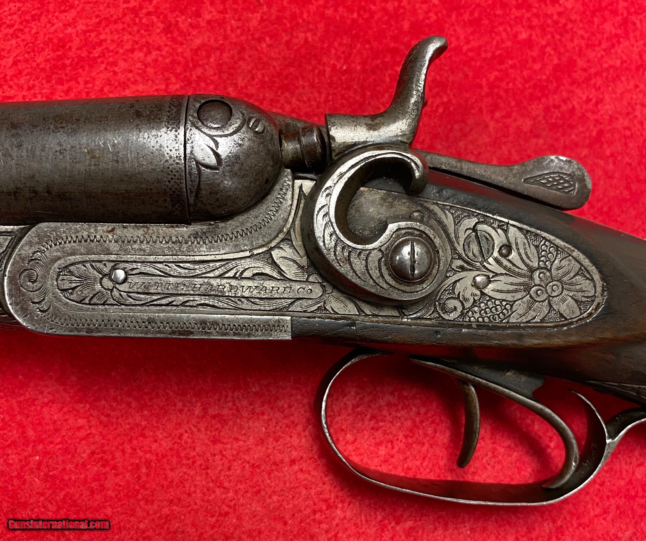 Description: Antique Engraved Belgium SxS 16 Gauge Shotgun with the Witte Hardware Co stamp. Low 4 digit serial number stamped under barrels. Nicely engraved early double SxS. Very good condition overall. Very good bores. Very good mechanics and extremely tight. Now a Coach gun with 18" barrels that were cut back some time ago. Winchester butt plate. Nice old early shotgun that would look great in any display. All vintage firearms should be checked prior to firing by a competent gunsmith. $35.00 insured shipping. SOLD Antique: Yes Shotgun Gauge: 16 Gauge Manufacturer: Belgium Model: Coach Serial Number: 3318 Barrel Length: 18” Chambers: Two Ejectors: Yes Condition: Very good Metal Condition: Very good Wood Condition: Very good Bore Condition: Very good Barrels: Steel Stock: Wood Sights: Fixed Engraving: Yes Item Location: WV |