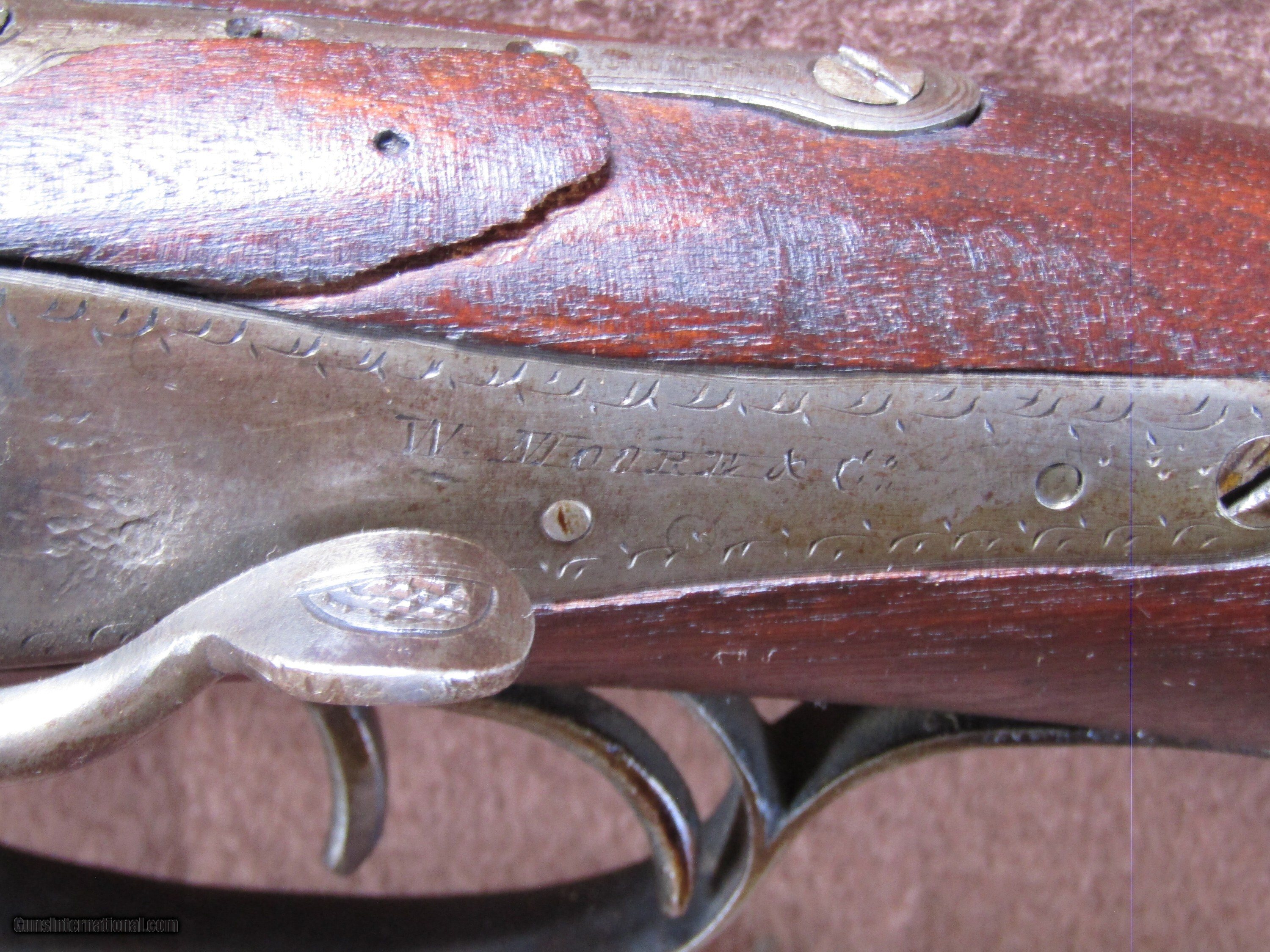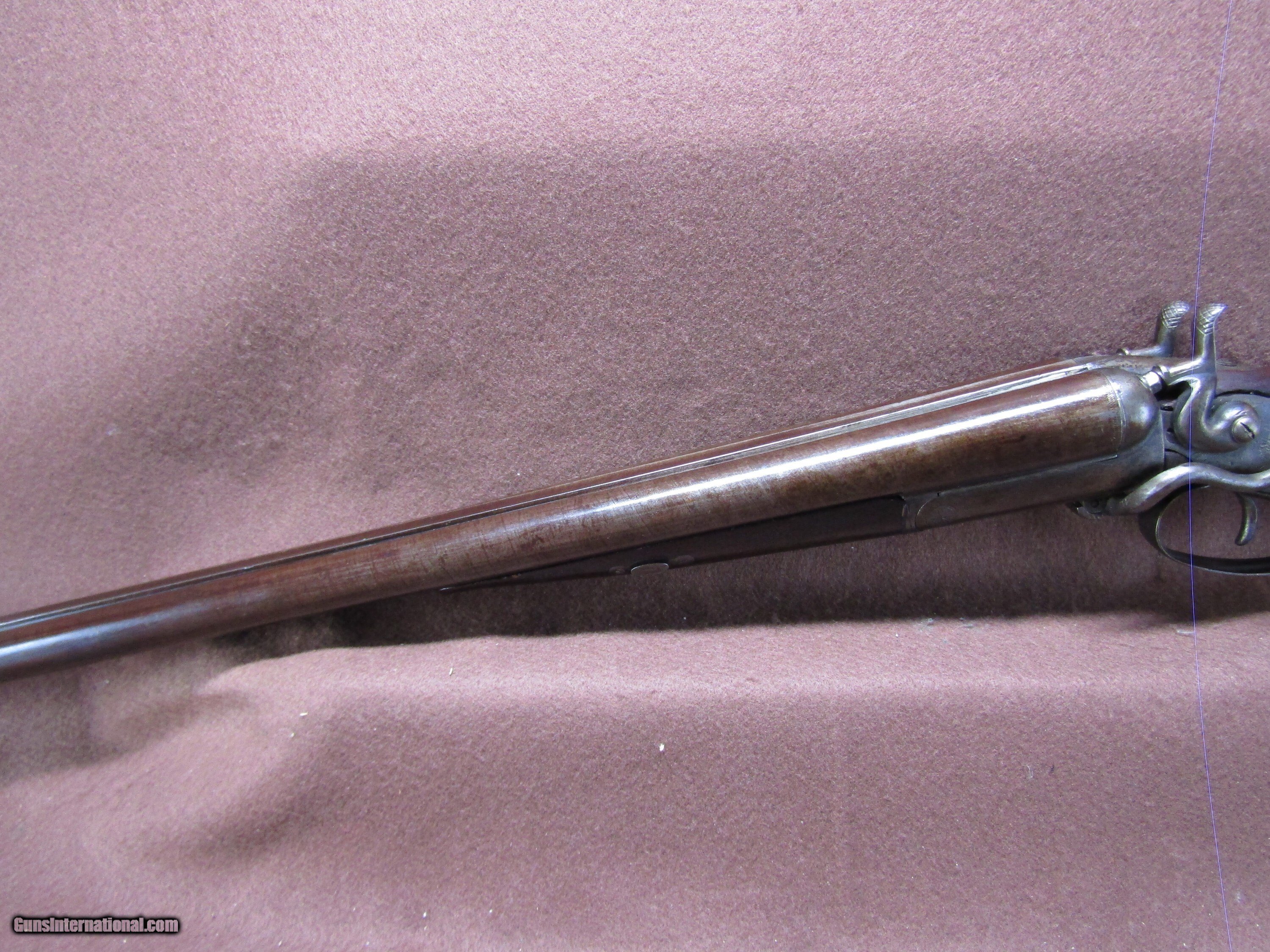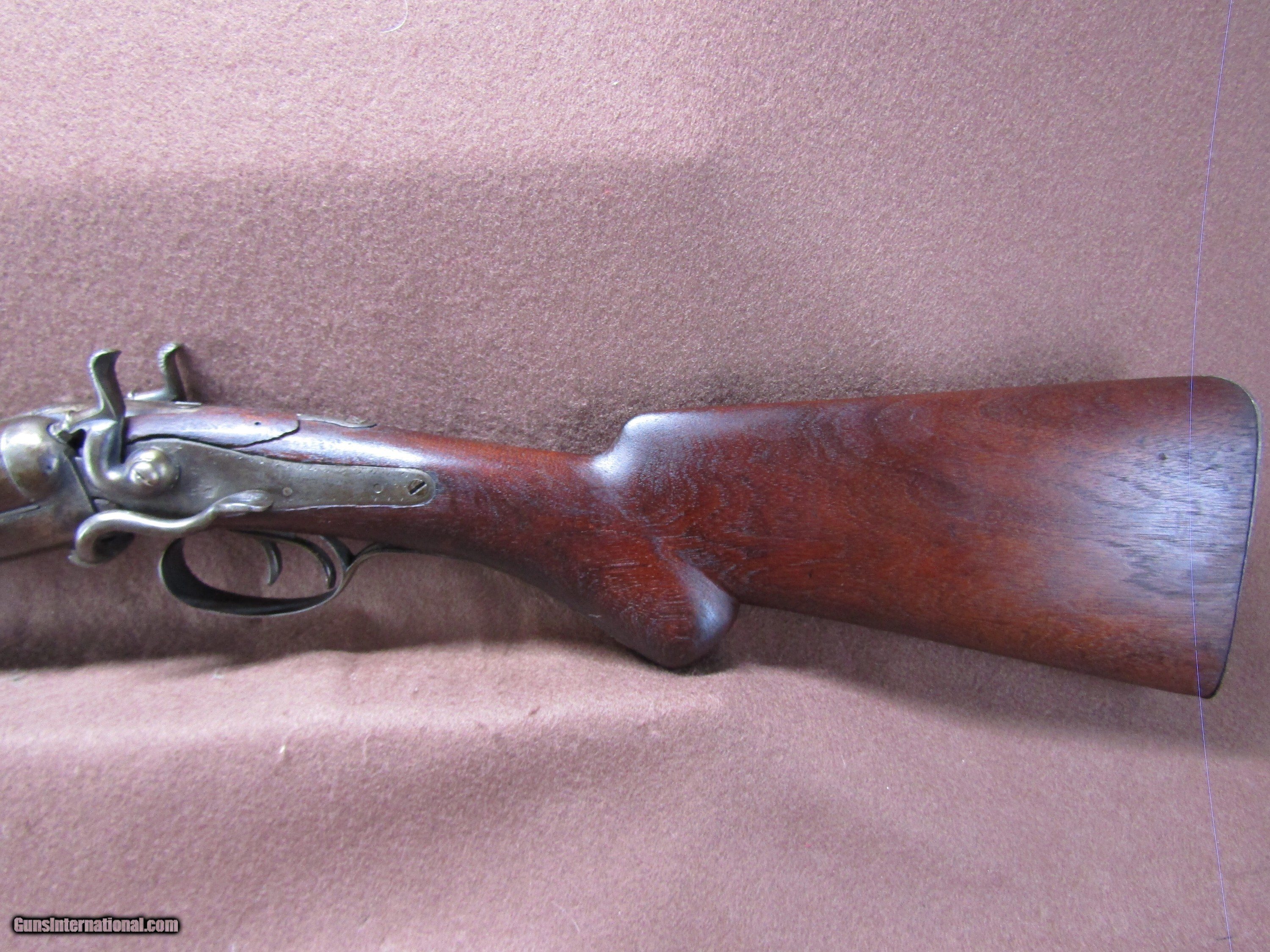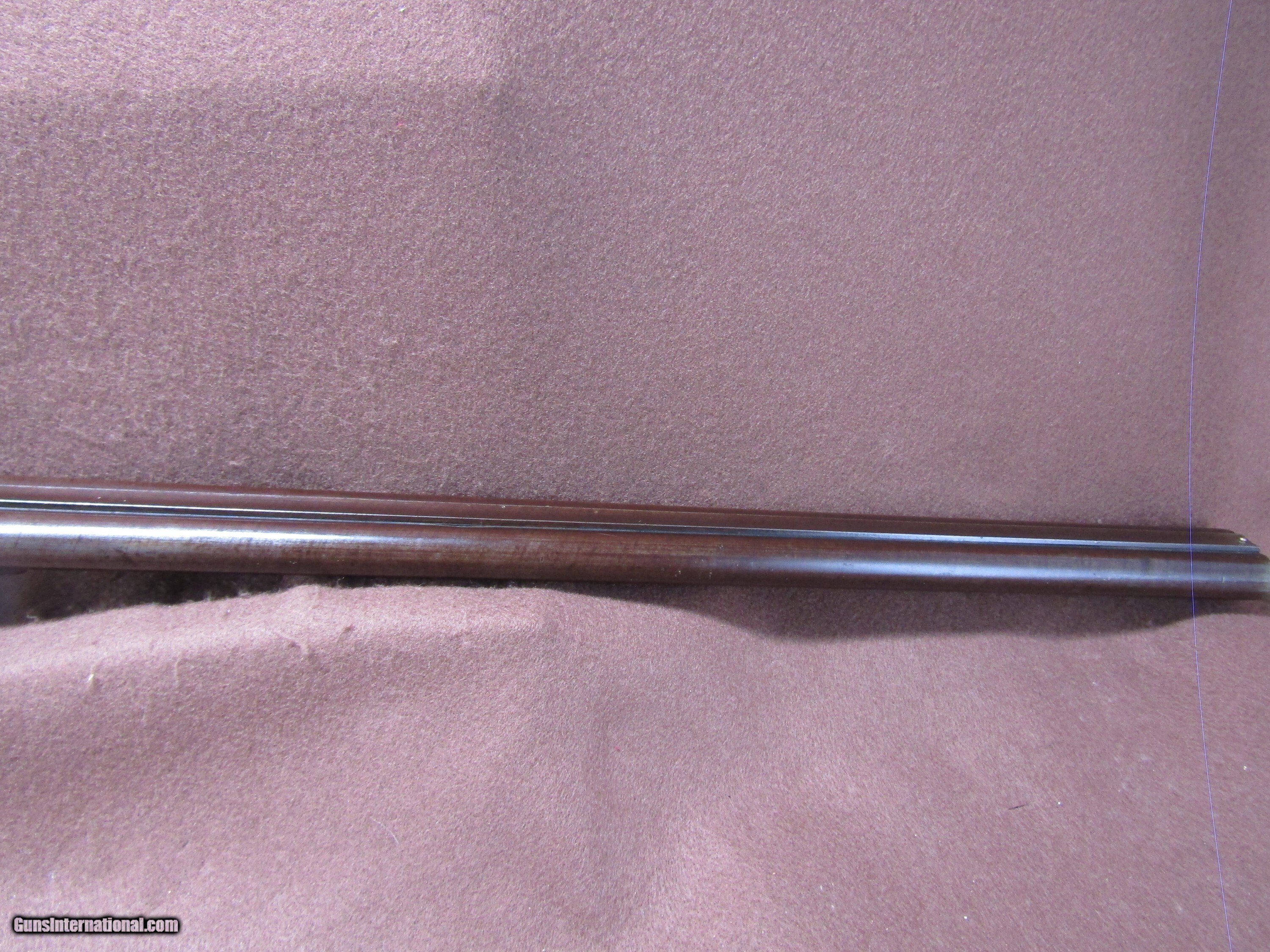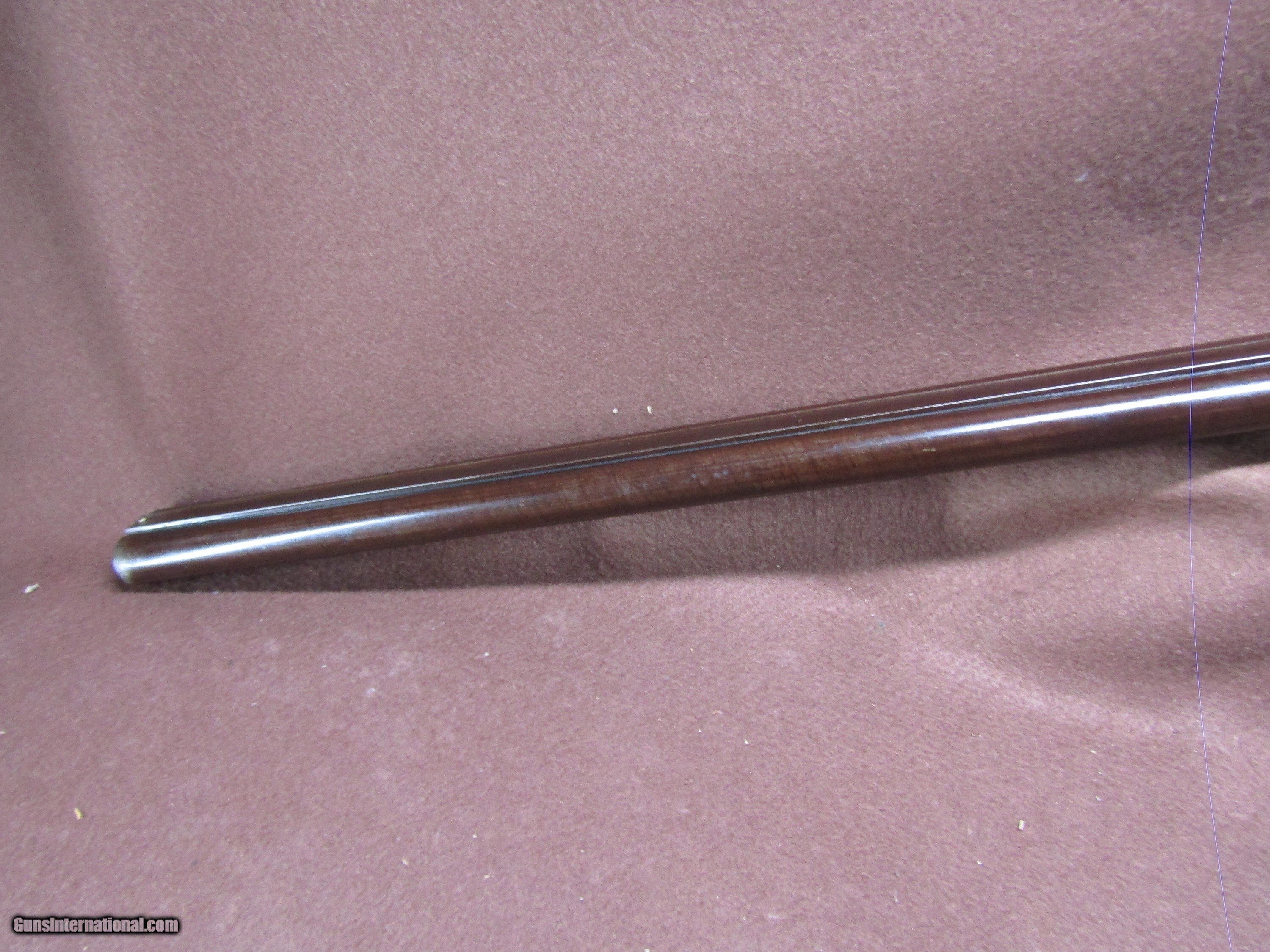 Description: The Wm. Moore 12-gauge double-barrel shotgun is an antique side-by-side hammer gun featuring 30-inch London Fine Twist barrels. The chokes are configured as improved cylinder and cylinder bore, and the barrels include a front bead sight. This shotgun has a plain metal butt plate, a smooth wood stock shaped in a Prince of Wales pistol grip style, and a matching forearm. The overall length measures approximately 46 inches, with a length of pull of 14 inches. Manufacture is estimated around circa 1880, and no serial number is present. The right barrel has a small dent near the muzzle. The stock shows evidence of a prior repair, and the forearm is missing its cap. The firing pins are absent, but the lockup is described as tight and the action cycles as intended. The bores remain in good condition with visible shine. This firearm is used and displays wear consistent with its age and configuration. Included components are limited to the shotgun itself with its original wood furniture and metal fittings. No accessories, case, or additional parts are noted. The gun’s construction reflects 19th-century London craftsmanship with fine twist steel barrels and traditional external hammers. Overall dimensions and mechanical details are consistent with period Wm. Moore doubles produced for sporting use in the late 1800s. Shotgun Gauge: 12 Gauge Manufacturer: Wm Moore Model: Side Release Hammer Double Serial Number: NSN Barrel Length: 30 Chambers: 2 Condition: Wall Hanger Metal Condition: Good Wood Condition: Good Bore Condition: Good Barrels: 2 Barrel Type: London Fine Twist Triggers: 2 LOP: 14 Rib: Solid Sights: Bead Manufacture Date: 1880's Price: $280.00 Shipping: $37.97 Contact Seller |