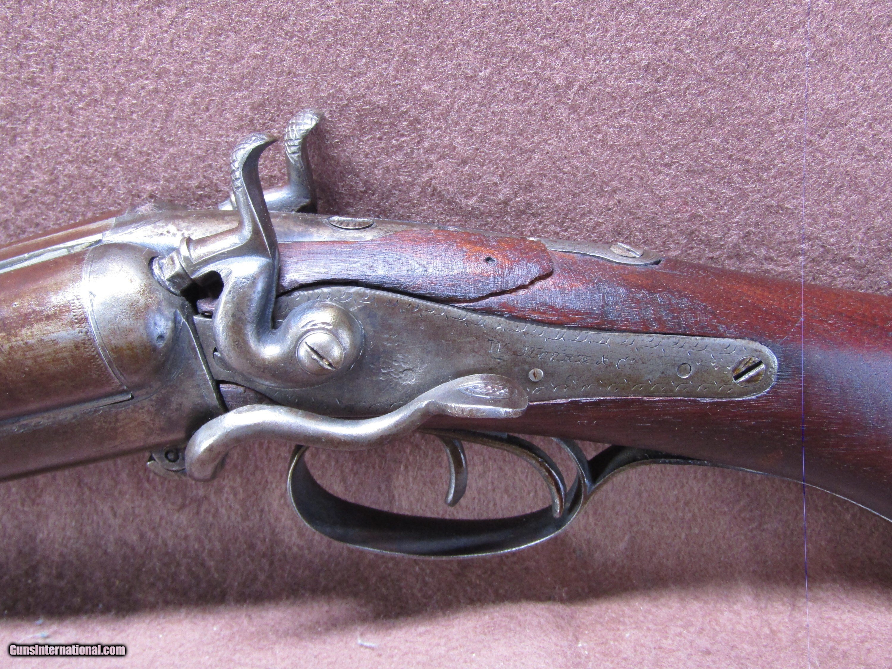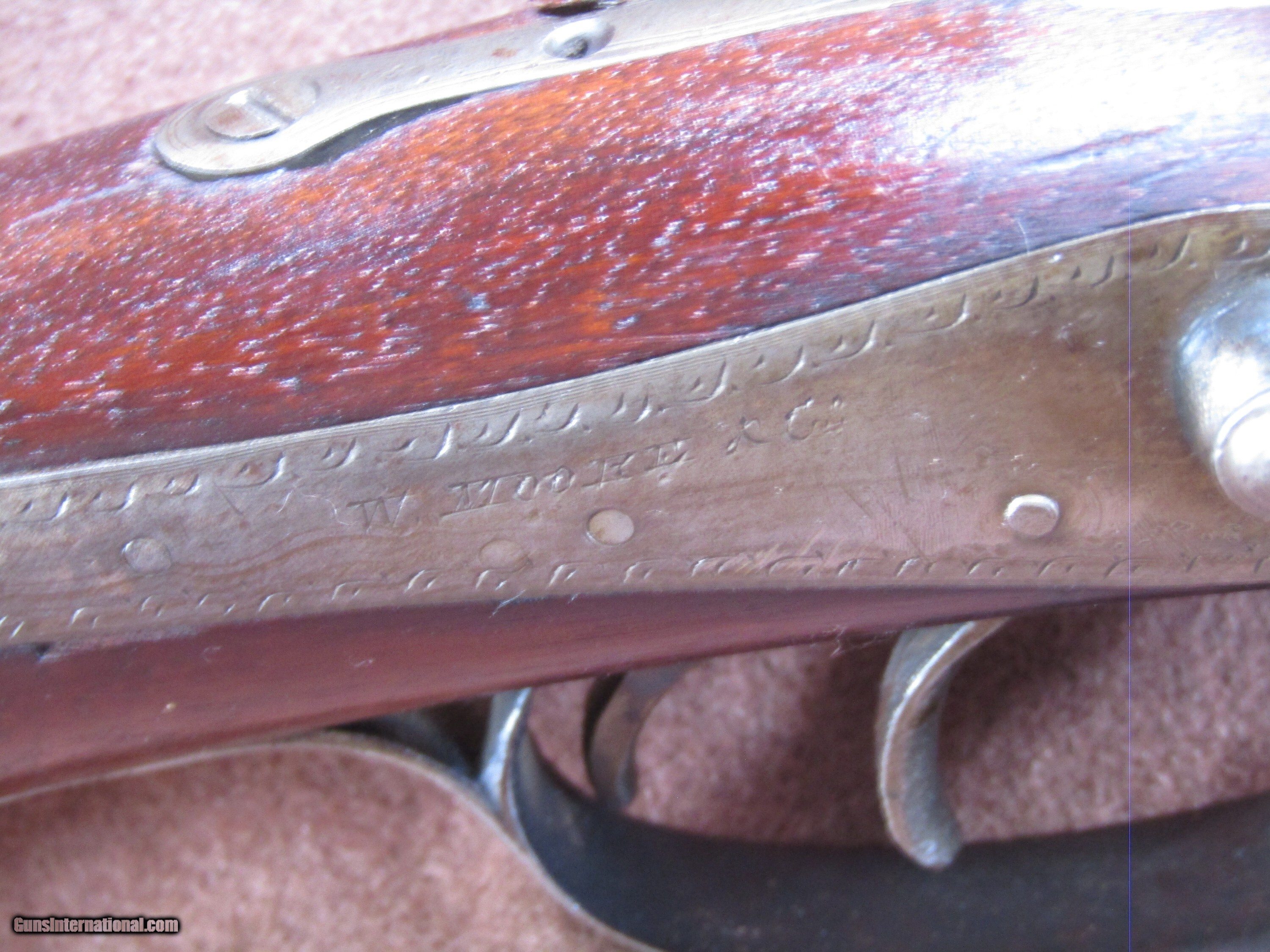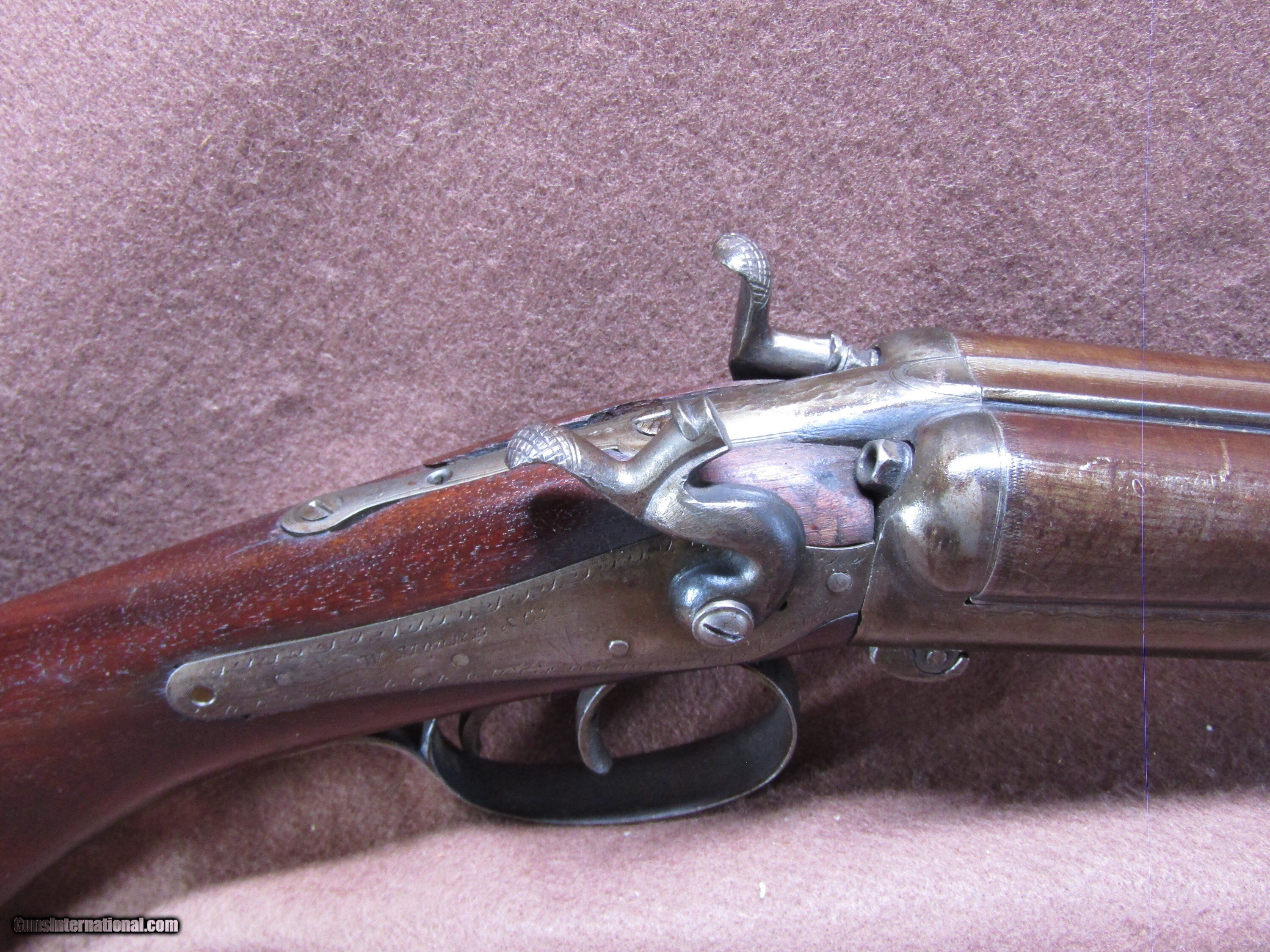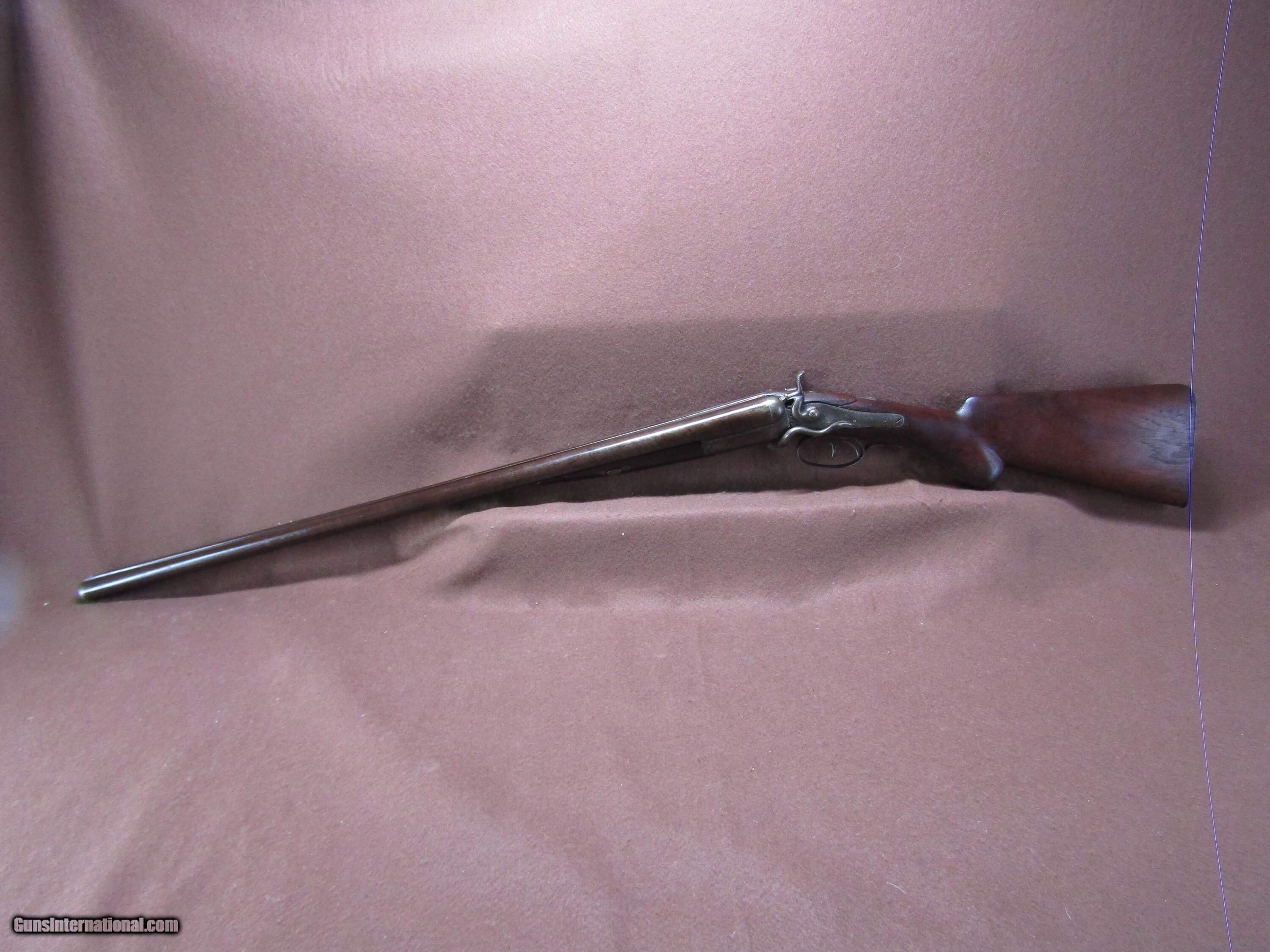 Description: The Wm. Moore 12-gauge double-barrel shotgun is an antique side-by-side hammer gun featuring 30-inch London Fine Twist barrels. The chokes are configured as improved cylinder and cylinder bore, and the barrels include a front bead sight. This shotgun has a plain metal butt plate, a smooth wood stock shaped in a Prince of Wales pistol grip style, and a matching forearm. The overall length measures approximately 46 inches, with a length of pull of 14 inches. Manufacture is estimated around circa 1880, and no serial number is present. The right barrel has a small dent near the muzzle. The stock shows evidence of a prior repair, and the forearm is missing its cap. The firing pins are absent, but the lockup is described as tight and the action cycles as intended. The bores remain in good condition with visible shine. This firearm is used and displays wear consistent with its age and configuration. Included components are limited to the shotgun itself with its original wood furniture and metal fittings. No accessories, case, or additional parts are noted. The gun’s construction reflects 19th-century London craftsmanship with fine twist steel barrels and traditional external hammers. Overall dimensions and mechanical details are consistent with period Wm. Moore doubles produced for sporting use in the late 1800s. Shotgun Gauge: 12 Gauge Manufacturer: Wm Moore Model: Side Release Hammer Double Serial Number: NSN Barrel Length: 30 Chambers: 2 Condition: Wall Hanger Metal Condition: Good Wood Condition: Good Bore Condition: Good Barrels: 2 Barrel Type: London Fine Twist Triggers: 2 LOP: 14 Rib: Solid Sights: Bead Manufacture Date: 1880's Price: $280.00 Shipping: $37.97 Contact Seller |