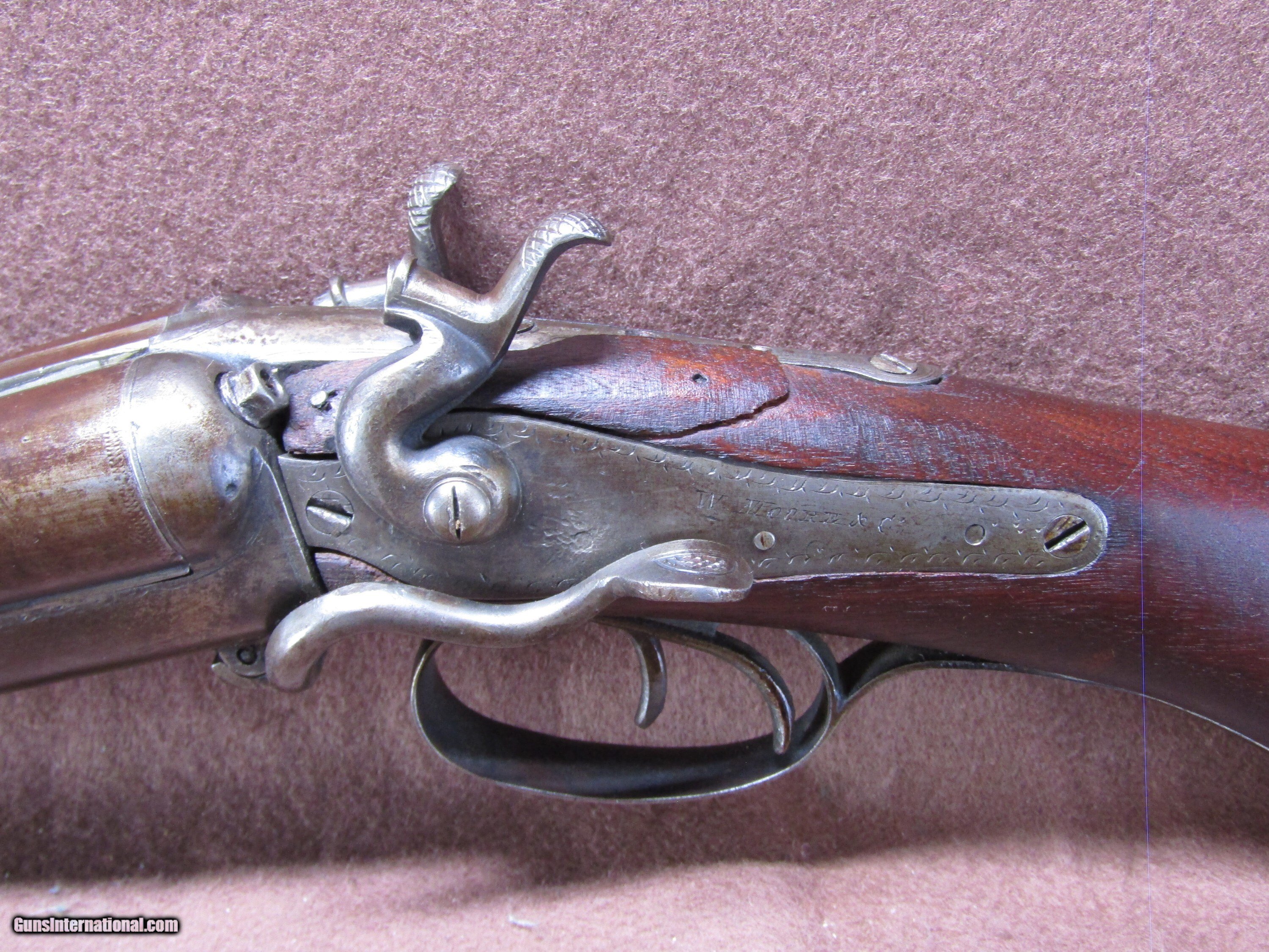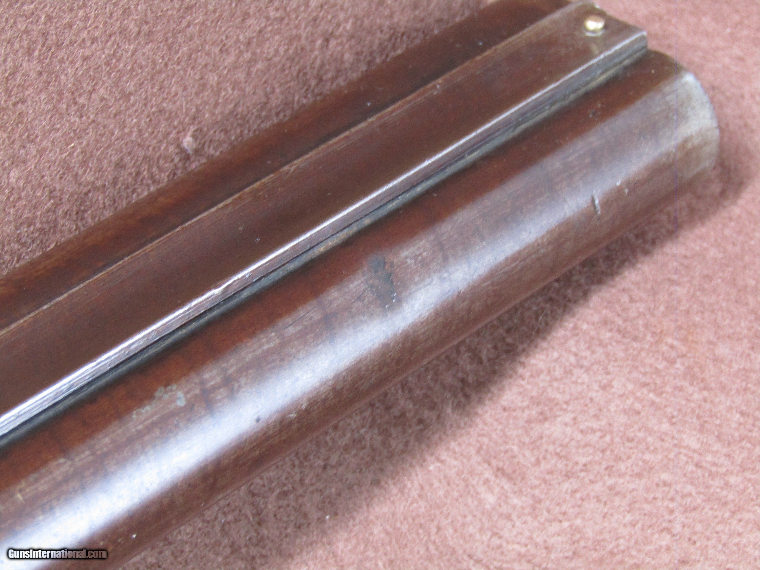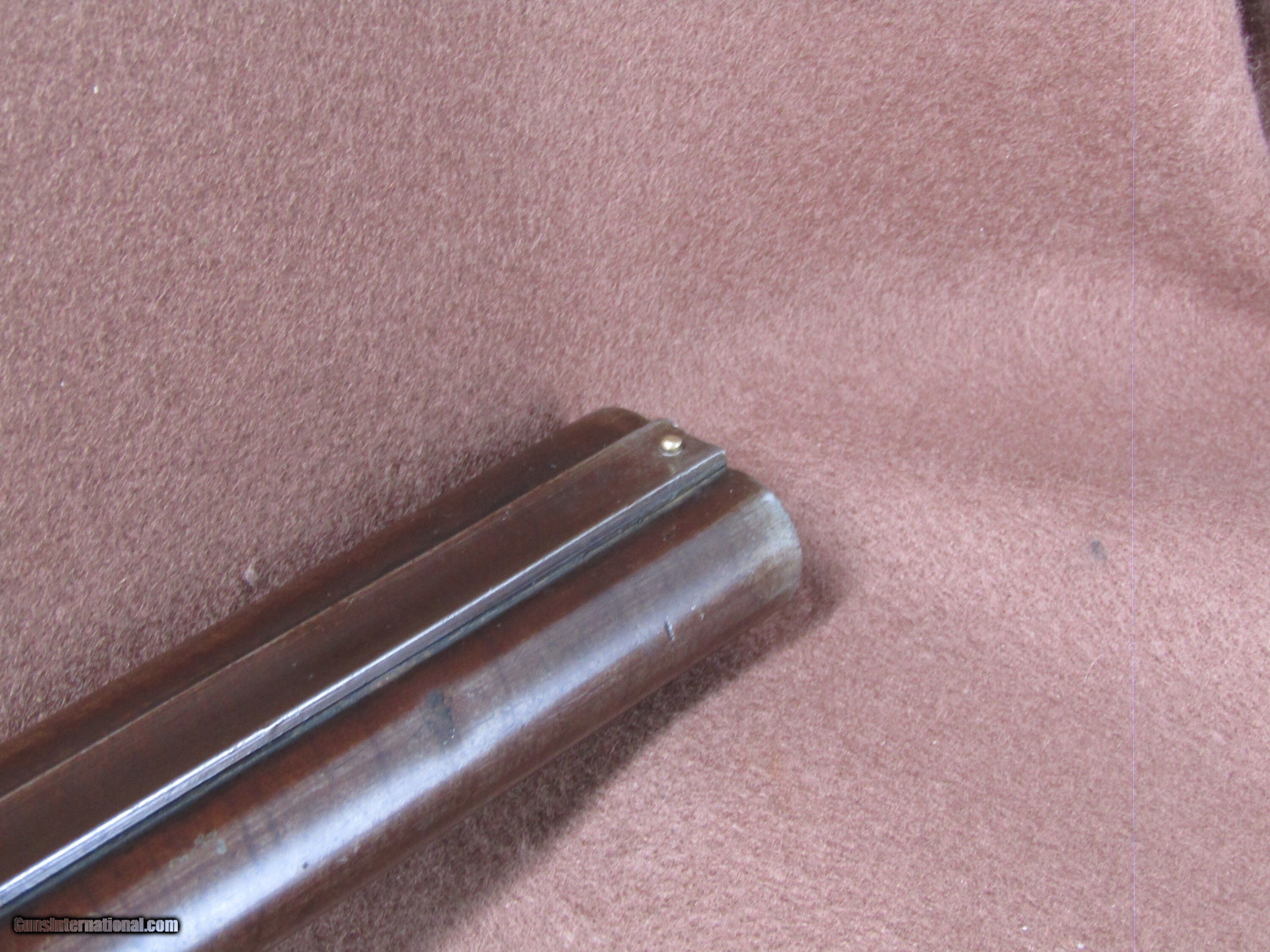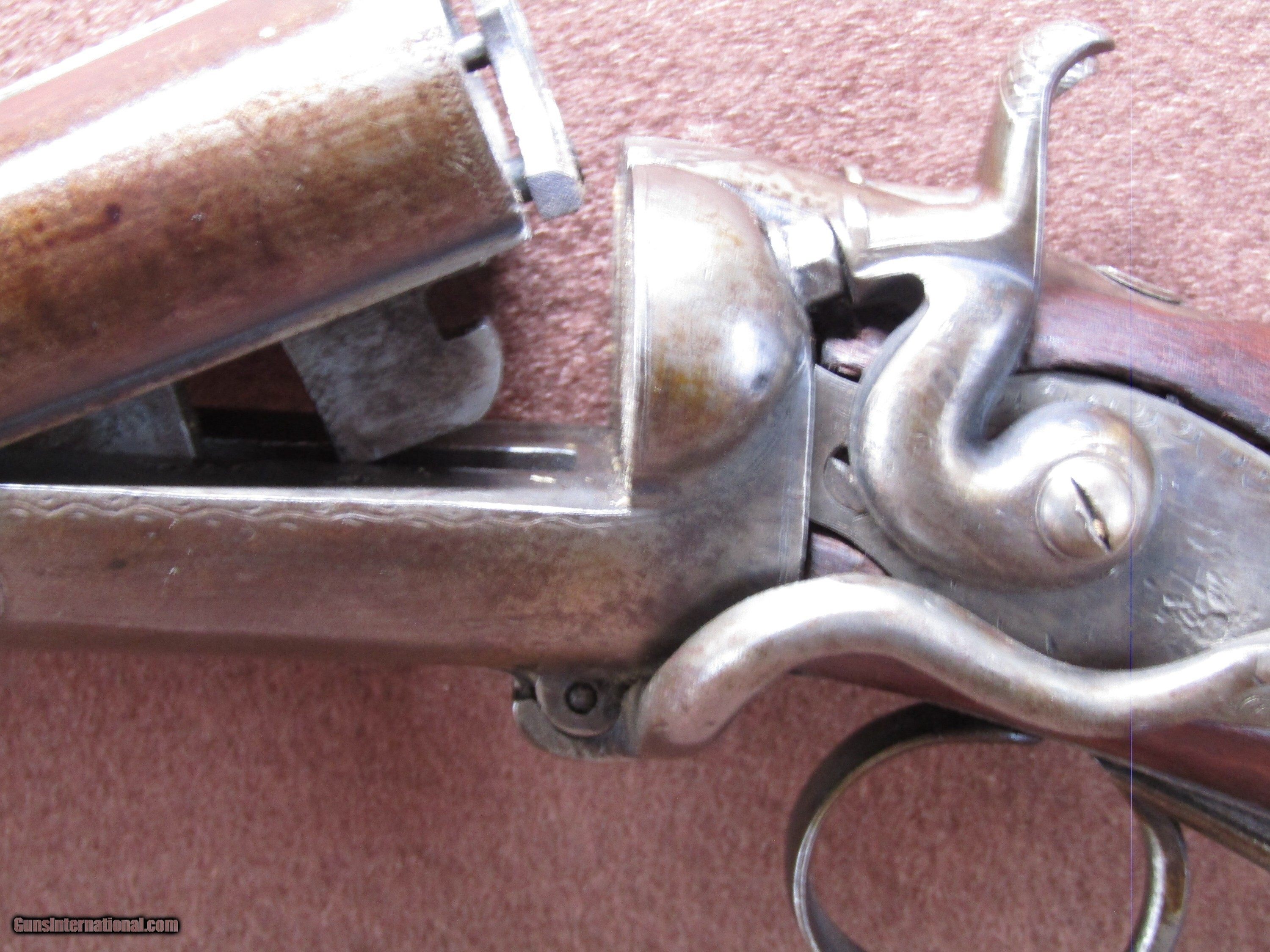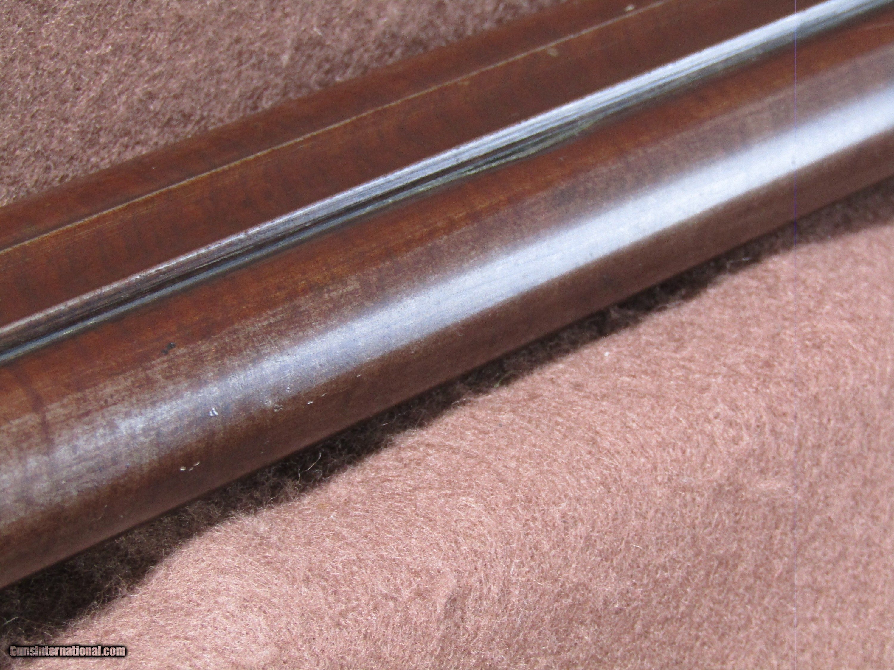 Description: The Wm. Moore 12-gauge double-barrel shotgun is an antique side-by-side hammer gun featuring 30-inch London Fine Twist barrels. The chokes are configured as improved cylinder and cylinder bore, and the barrels include a front bead sight. This shotgun has a plain metal butt plate, a smooth wood stock shaped in a Prince of Wales pistol grip style, and a matching forearm. The overall length measures approximately 46 inches, with a length of pull of 14 inches. Manufacture is estimated around circa 1880, and no serial number is present. The right barrel has a small dent near the muzzle. The stock shows evidence of a prior repair, and the forearm is missing its cap. The firing pins are absent, but the lockup is described as tight and the action cycles as intended. The bores remain in good condition with visible shine. This firearm is used and displays wear consistent with its age and configuration. Included components are limited to the shotgun itself with its original wood furniture and metal fittings. No accessories, case, or additional parts are noted. The gun’s construction reflects 19th-century London craftsmanship with fine twist steel barrels and traditional external hammers. Overall dimensions and mechanical details are consistent with period Wm. Moore doubles produced for sporting use in the late 1800s. Shotgun Gauge: 12 Gauge Manufacturer: Wm Moore Model: Side Release Hammer Double Serial Number: NSN Barrel Length: 30 Chambers: 2 Condition: Wall Hanger Metal Condition: Good Wood Condition: Good Bore Condition: Good Barrels: 2 Barrel Type: London Fine Twist Triggers: 2 LOP: 14 Rib: Solid Sights: Bead Manufacture Date: 1880's Price: $280.00 Shipping: $37.97 Contact Seller |
