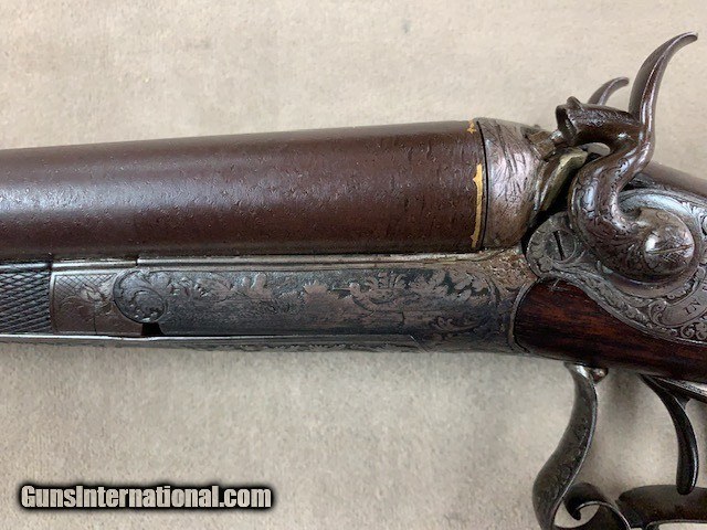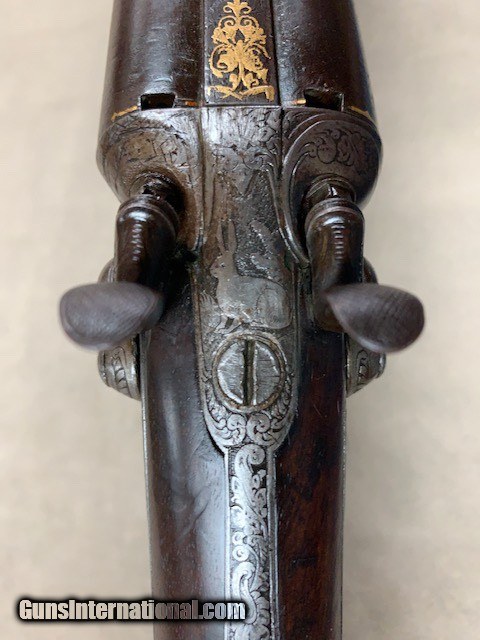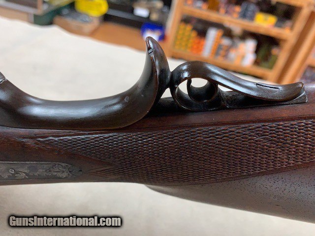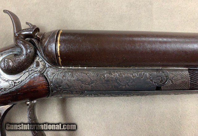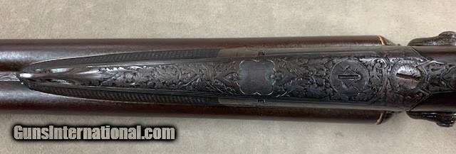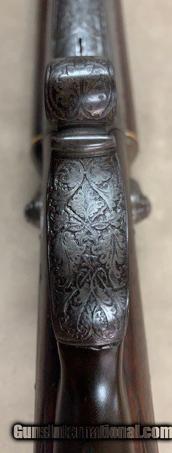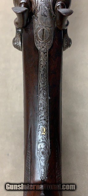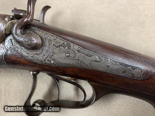Description: This an excellent condition pre 1898 Antique Austrian Underlever Back Action Side by Side 16 Ga hammer shotgun by an individual maker Ant. Mulhcz as inlaid in gold on the rib at the breech. Chambers are 2&9/16 inches in length and bores are about good. Damascus Barrels are 30 inches in length. Exterior finish wood and metal is very good to excellent and totally original. Trigger guard is also engraved and partially made of horn (easier on the fingers in the very cold). This shotgun is elaborately engraved with wonderful game scenes and is marked with a "2" on the barrels and top tang indicatiing it is one of a pair of guns. Buttstock is excellent and of high quality European walnut. Obviously one of a pair made for a person of means. Hammers and triggers function as they should. Action is tight. Photos show all. Just came in from an estate. SOLD Curio/Relic: Yes Antique: Yes |