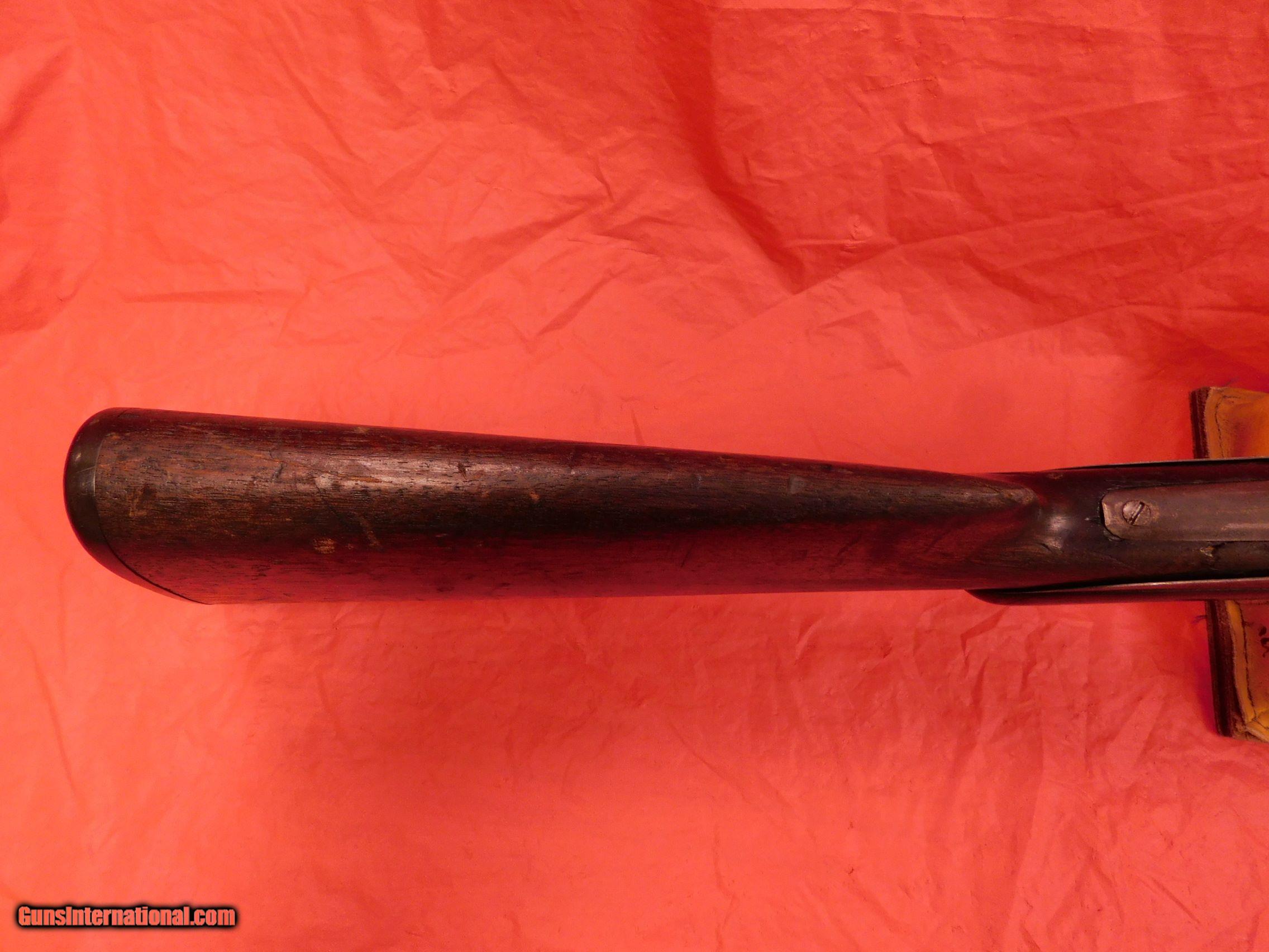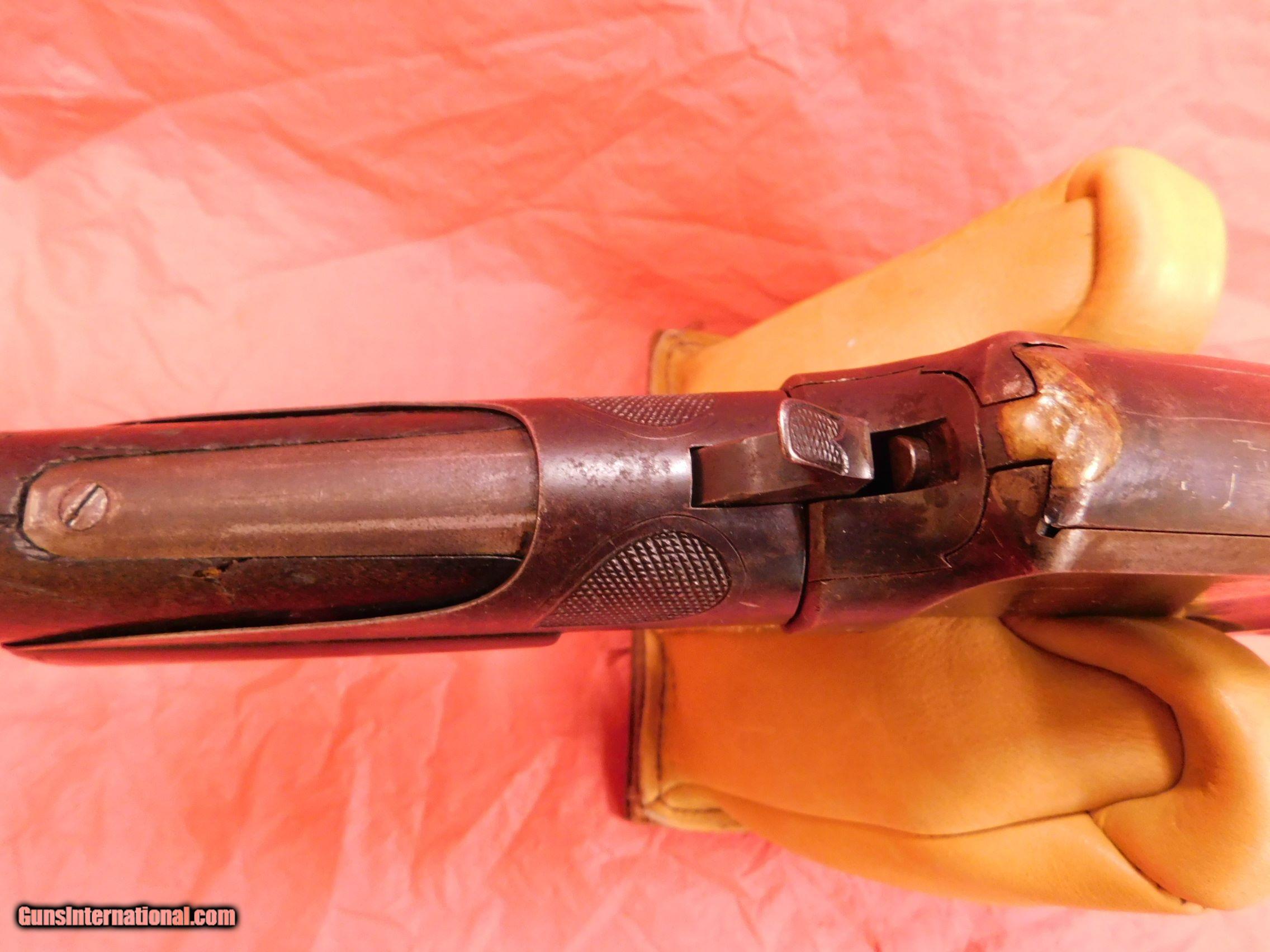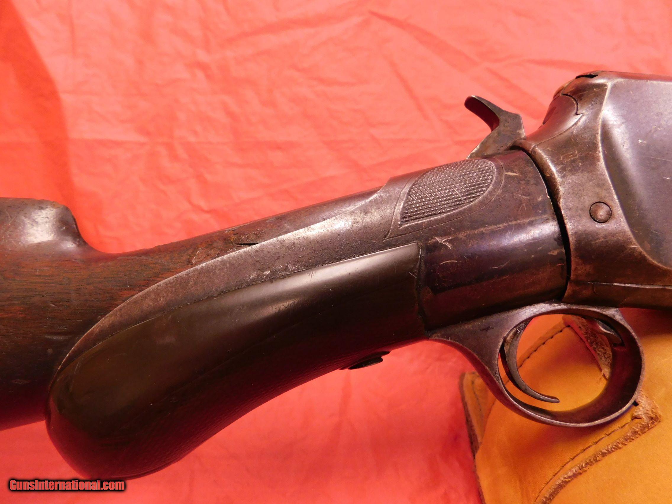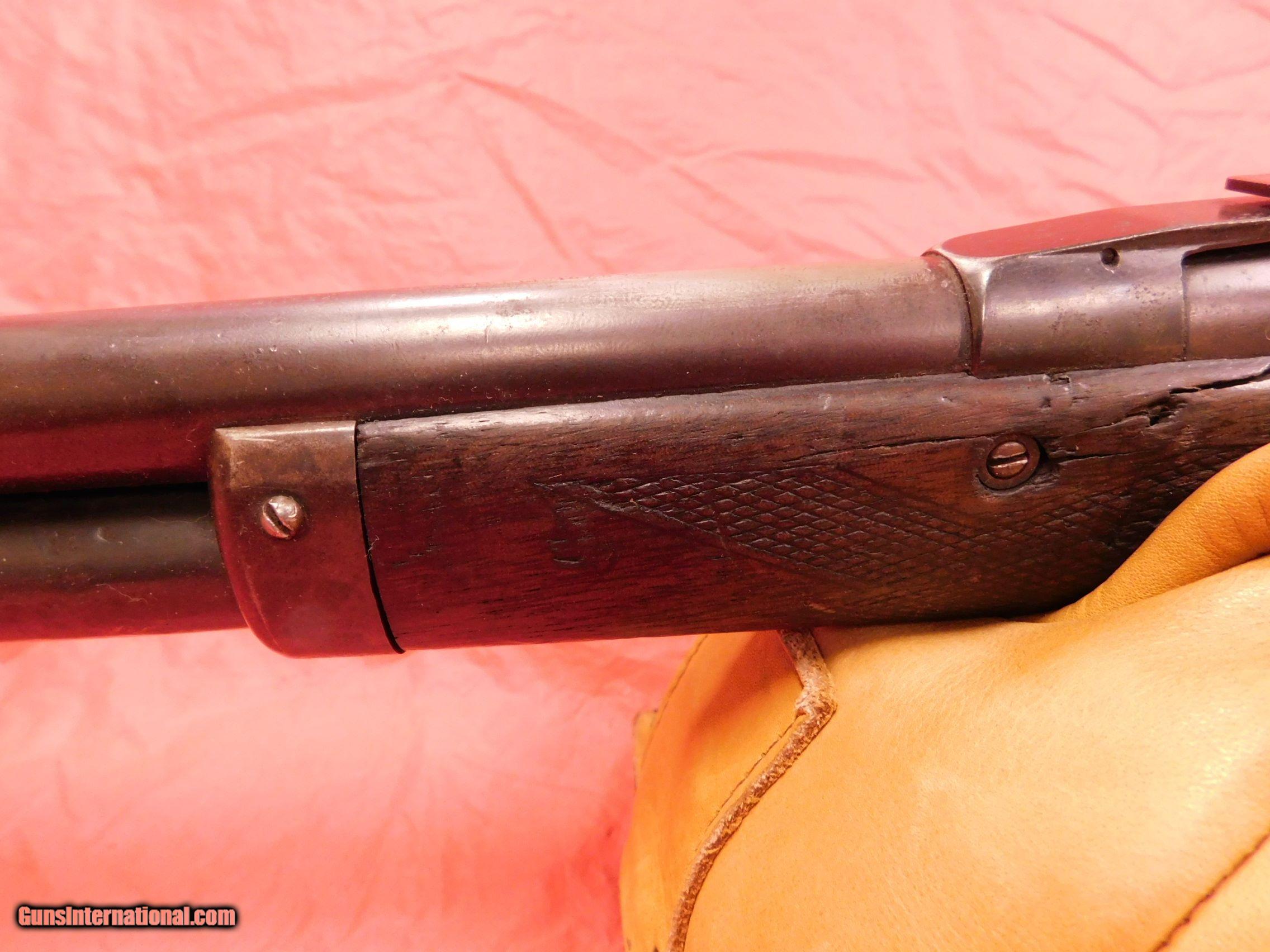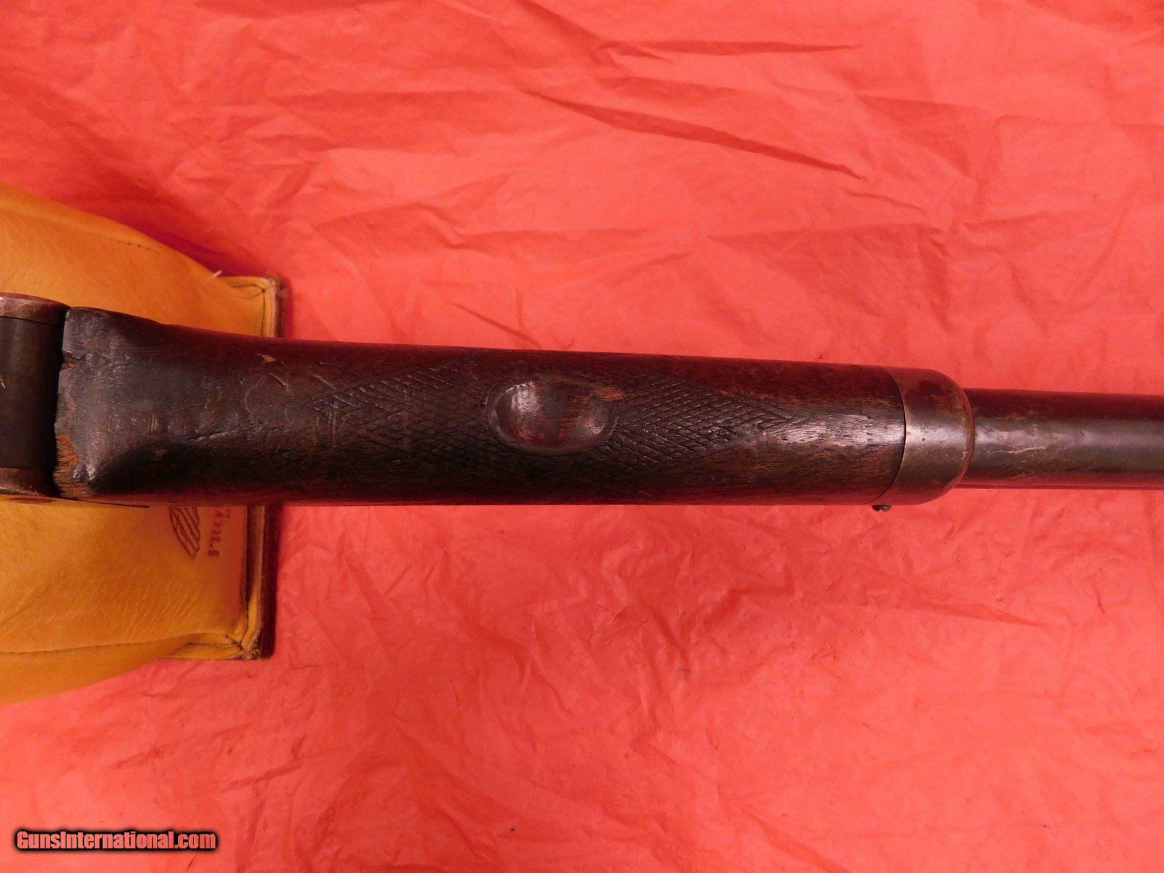 Description: Manufactured by the Burgess Gun Co. of Buffalo, New York circa 1892 to 1899. It is unknown what the total number manufactured is, however, it is estimated to be only a few thousand. This shotgun has the unique design invented by American Inventor Andrew Burgess, who established himself in business in 1892 to manufacture this unusual repeating shotgun which has an iron sleeve over the stock wrist that activates the bolt and breech mechanism when slid backwards. Burgess was also noted for his Lever Action rifles made by Colt and Whitney. This particular "Folding Gun" has a 19 1/2 inch barrel and is hinged on the underside of the receiver with a lift lever on top which releases the barrel so that it can be folded in half. A unique "quick draw" waist holster was made to go with it (not included). The shotgun was advertised as being especially adapted for police service, express messengers, U.S. Marshals, prison and bank guards. The underside of the receiver is marked with the three-line patent and reissue dates and the matching serial number is stamped on the front left edge of the receiver, and on the underside of the receiver. Blade front sight and there is a groove in the top of the barrel release lever that serves as the rear sight. All blue finish and mounted with a multi-point checkered walnut forearm and pistol grip stock with a checkered hard rubber Burgess Gun Co. Dog's head logo buttplate. Parts are missing, stock and forend cracked. Most of the bluing is there. Good wall hanger. Not recomended to be fired. Only $700 $45 shipping and NO cc fees. Even though this is an antique, we will only ship to an FFL. NO C&R License accepted. Please ask for Steve 716-833-2581 or 716-835-1546. SOLD Manufacturer: Burgess Model: Slide action Folding Shotgun Condition: used Barrels: 19 1/2 Gauge Info: 12 |
