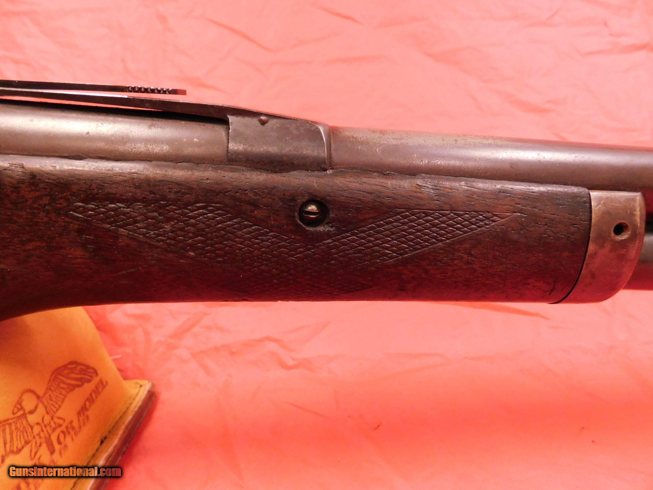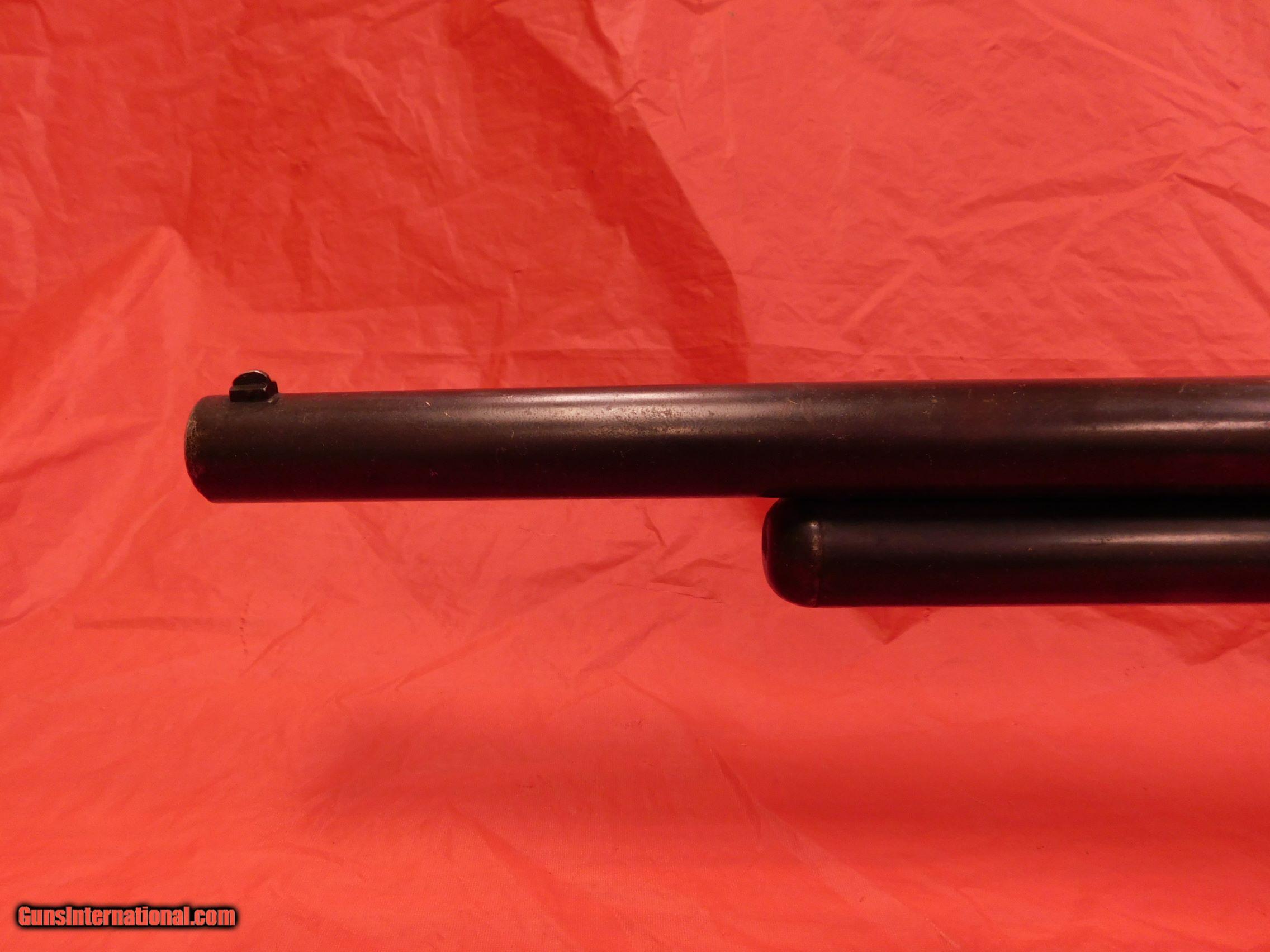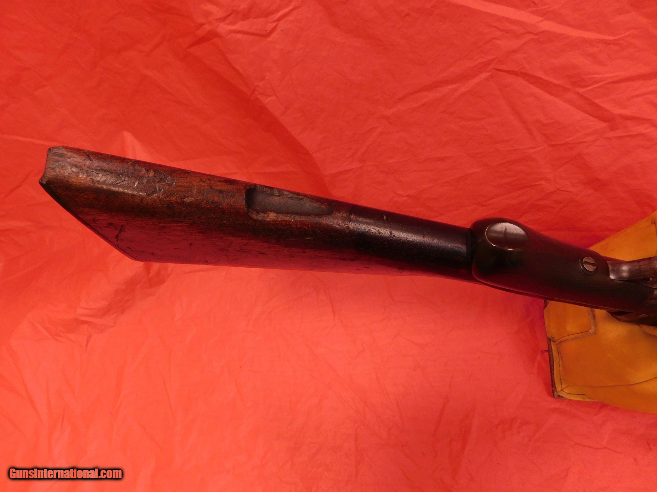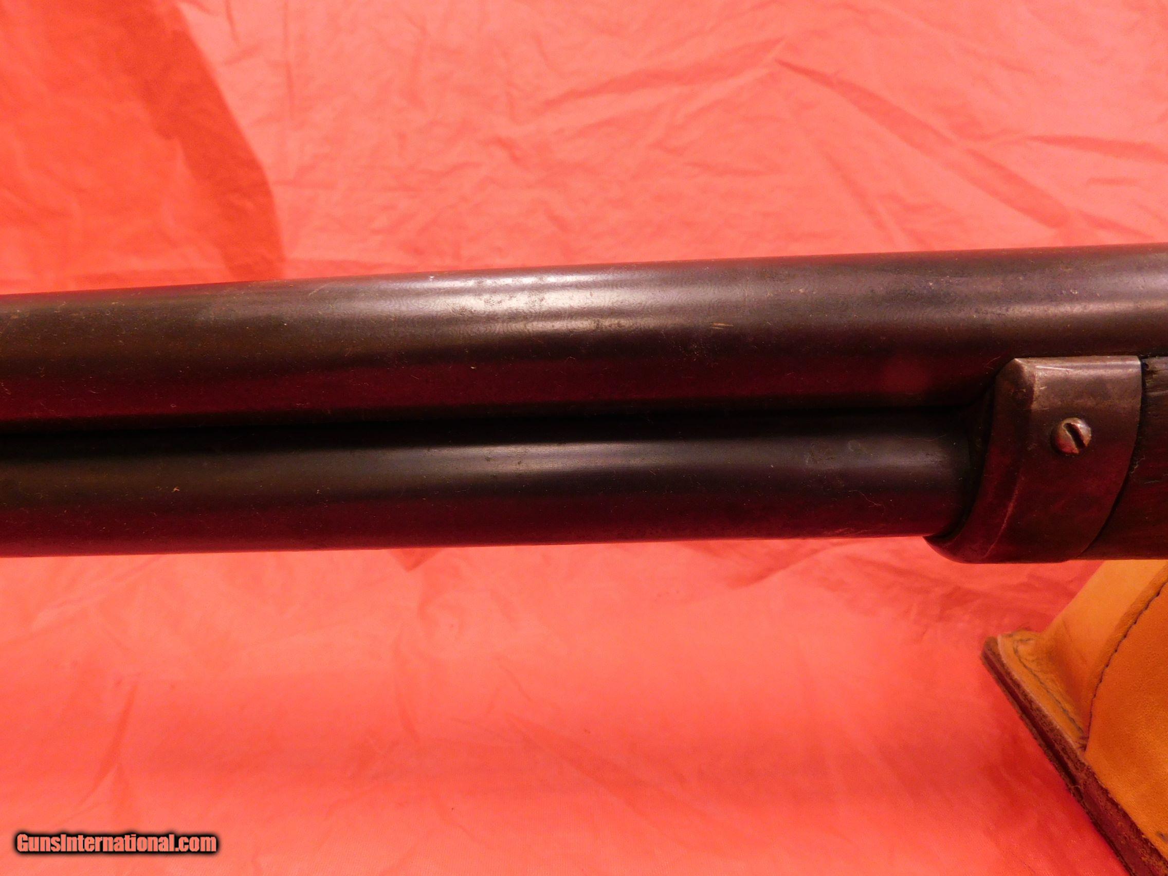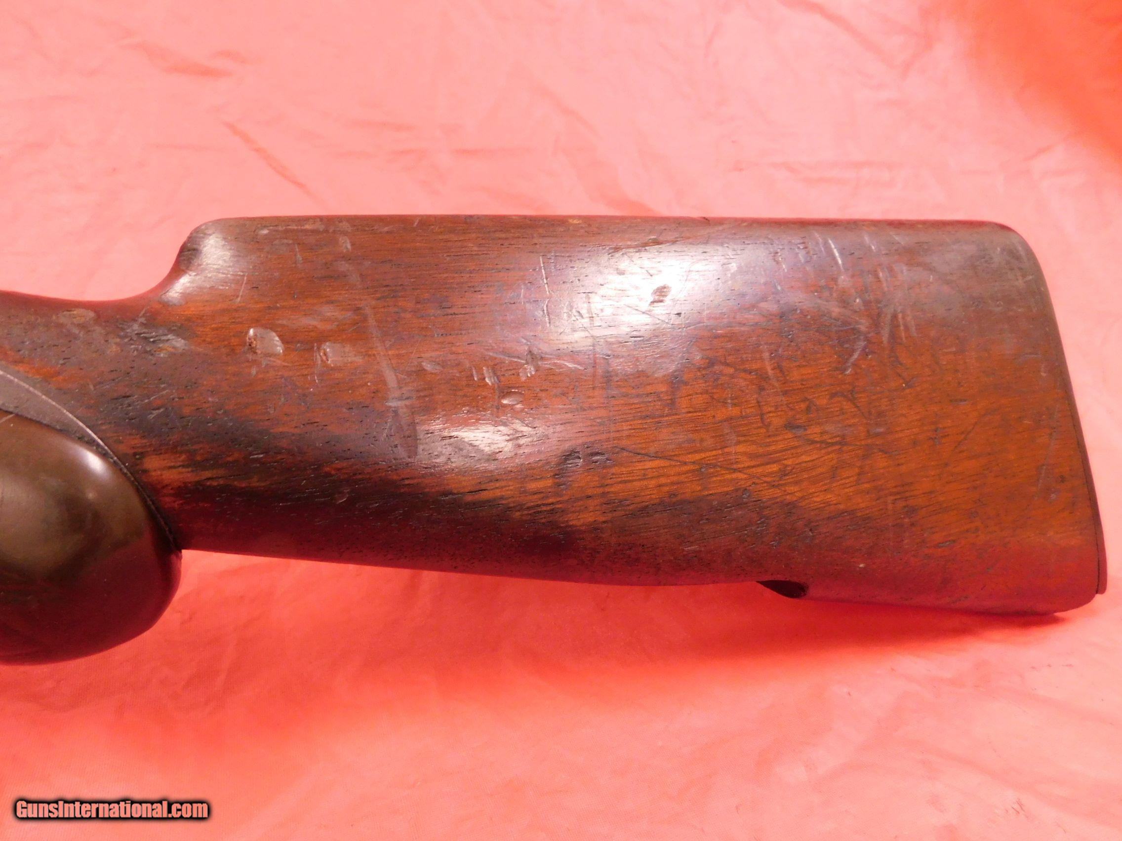 Description: Manufactured by the Burgess Gun Co. of Buffalo, New York circa 1892 to 1899. It is unknown what the total number manufactured is, however, it is estimated to be only a few thousand. This shotgun has the unique design invented by American Inventor Andrew Burgess, who established himself in business in 1892 to manufacture this unusual repeating shotgun which has an iron sleeve over the stock wrist that activates the bolt and breech mechanism when slid backwards. Burgess was also noted for his Lever Action rifles made by Colt and Whitney. This particular "Folding Gun" has a 19 1/2 inch barrel and is hinged on the underside of the receiver with a lift lever on top which releases the barrel so that it can be folded in half. A unique "quick draw" waist holster was made to go with it (not included). The shotgun was advertised as being especially adapted for police service, express messengers, U.S. Marshals, prison and bank guards. The underside of the receiver is marked with the three-line patent and reissue dates and the matching serial number is stamped on the front left edge of the receiver, and on the underside of the receiver. Blade front sight and there is a groove in the top of the barrel release lever that serves as the rear sight. All blue finish and mounted with a multi-point checkered walnut forearm and pistol grip stock with a checkered hard rubber Burgess Gun Co. Dog's head logo buttplate. Parts are missing, stock and forend cracked. Most of the bluing is there. Good wall hanger. Not recomended to be fired. Only $700 $45 shipping and NO cc fees. Even though this is an antique, we will only ship to an FFL. NO C&R License accepted. Please ask for Steve 716-833-2581 or 716-835-1546. SOLD Manufacturer: Burgess Model: Slide action Folding Shotgun Condition: used Barrels: 19 1/2 Gauge Info: 12 |