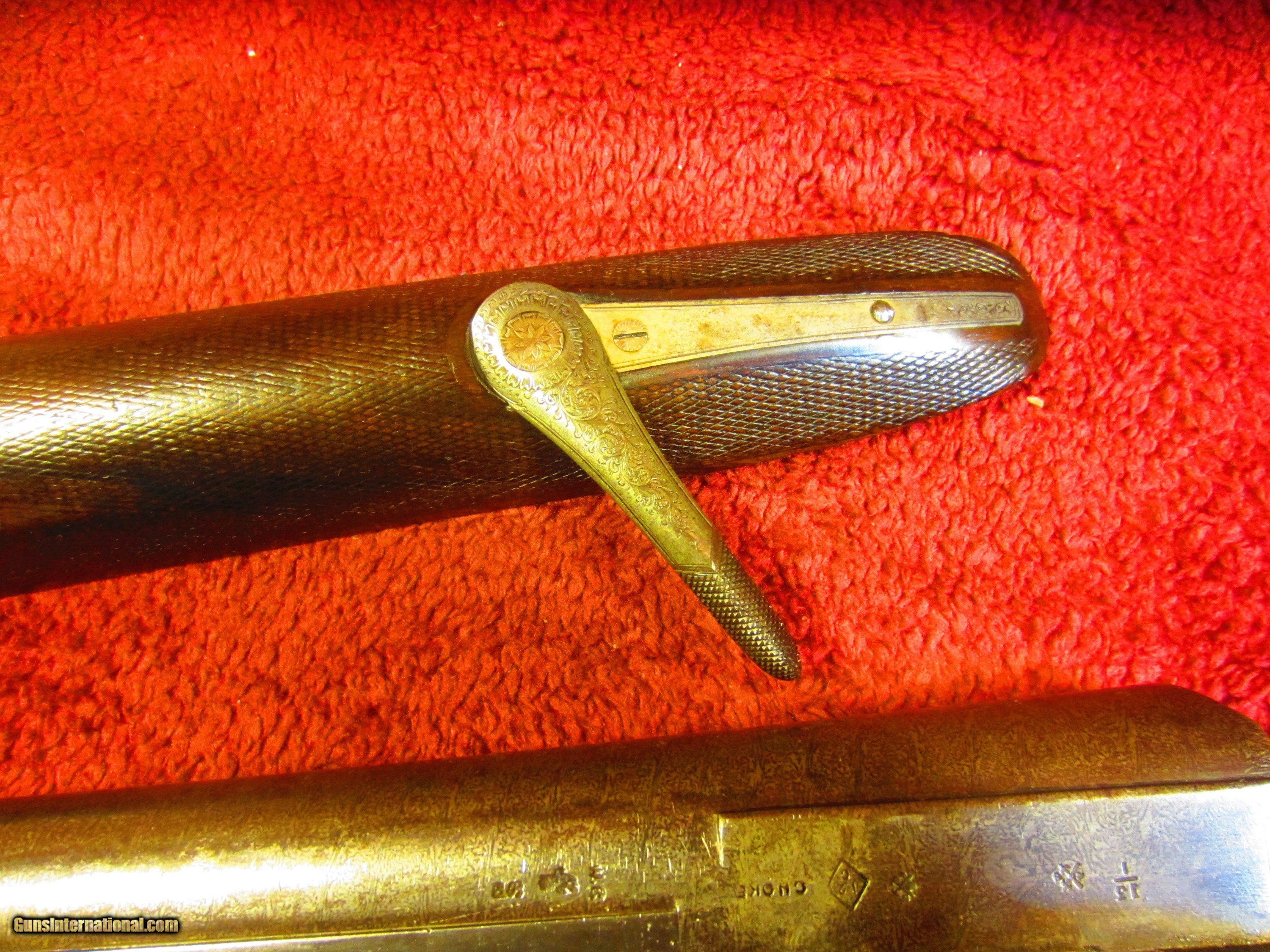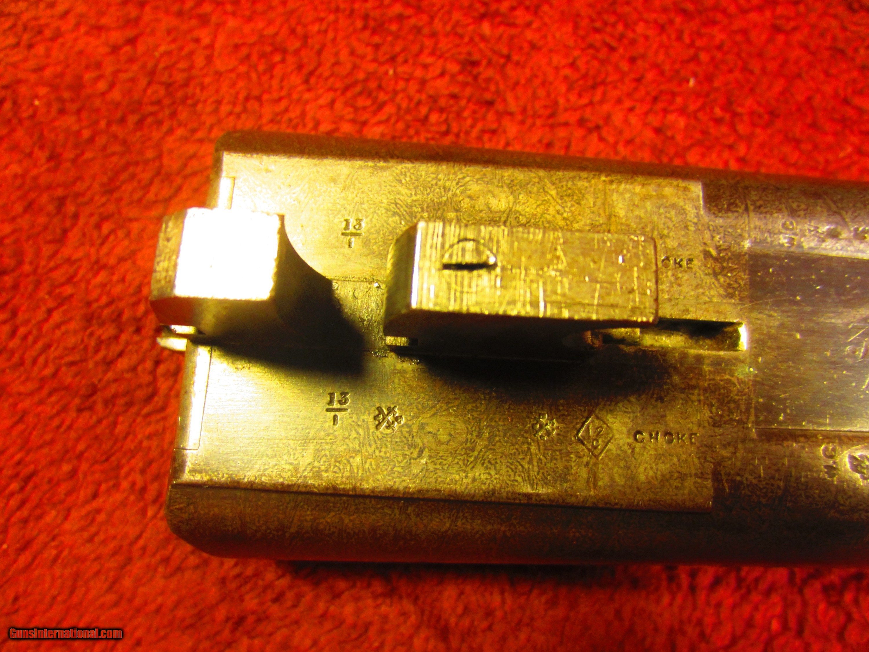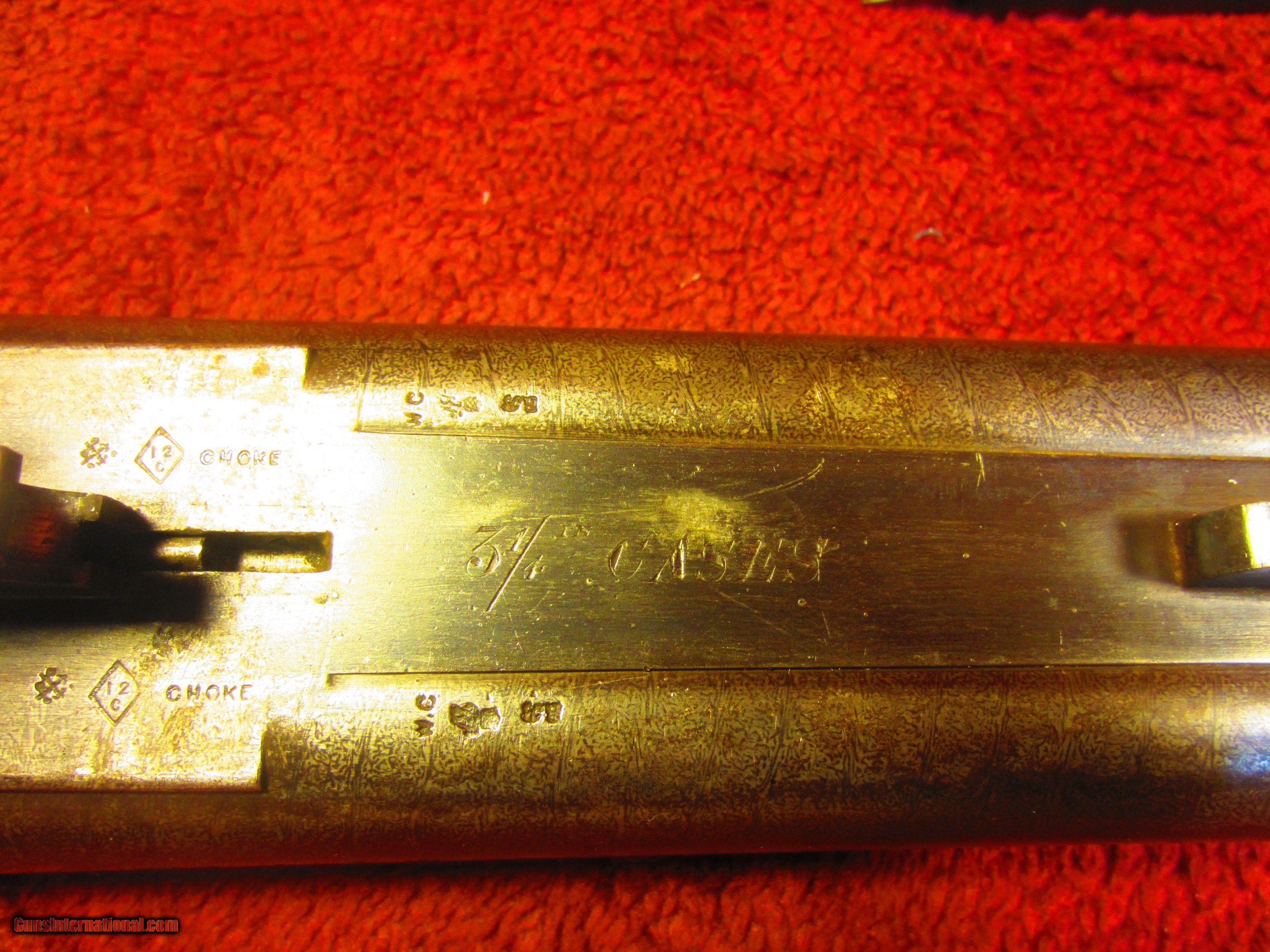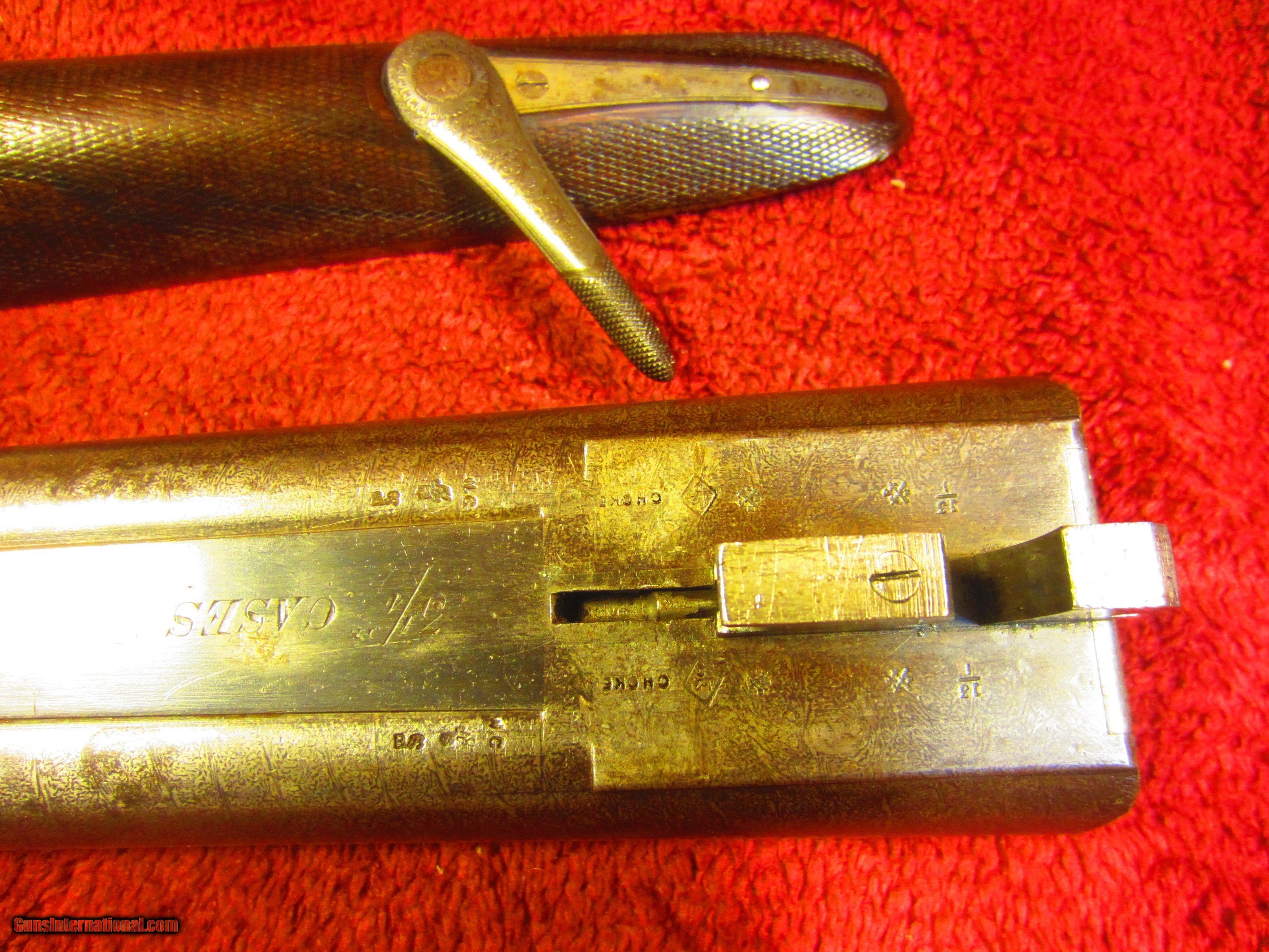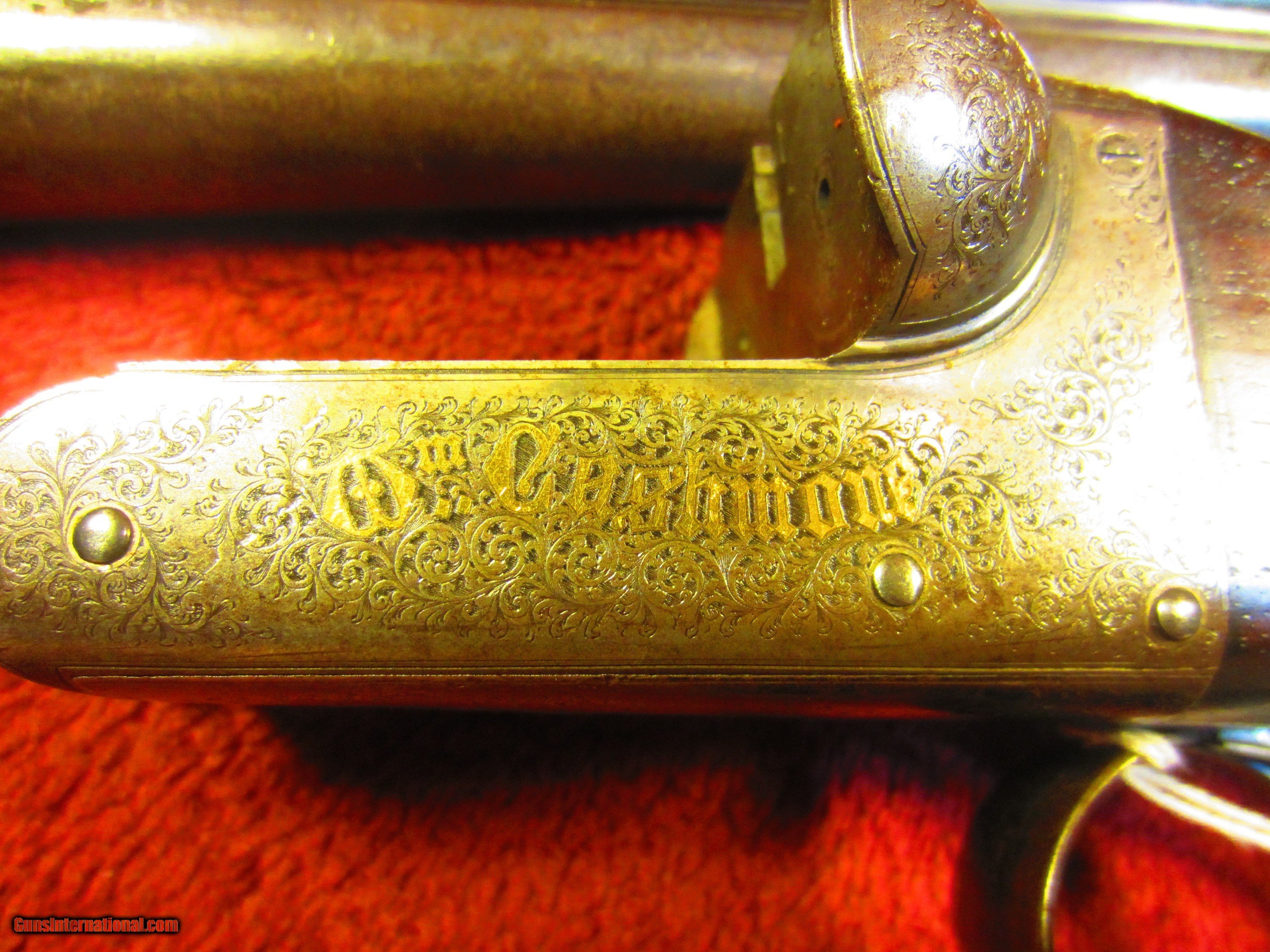 Description: CASHMORE DOUBLE BARREL 12GA SERIAL NUMBER 9018 PRE 1898 MADE IN ENGLAND BARREL LENGTH 30 1/2" BARRELS DAMASUS RIGHT BARREL OPEN BORE LEFT BARREL IMPROVED CYLINDER. MAKERS NAME GOLD FILLED NO RUST EXCELLENT BORES. RECOIL PAD POOR CONDITION WOOD VERY GOOD FOREARM HAS CASE COLOR. ENGRAVING EXCELLLENT SHOWS NO RUST. MAKERS NAME IS GOLD FILLED. NOTE SOME OF THESE WERE MADE FOR ANTIE OAKLEY HOWEVER NOT THIS ONE. ANY INTEREST CALL SHOP 716-941-3946 SOLD Antique: Yes |