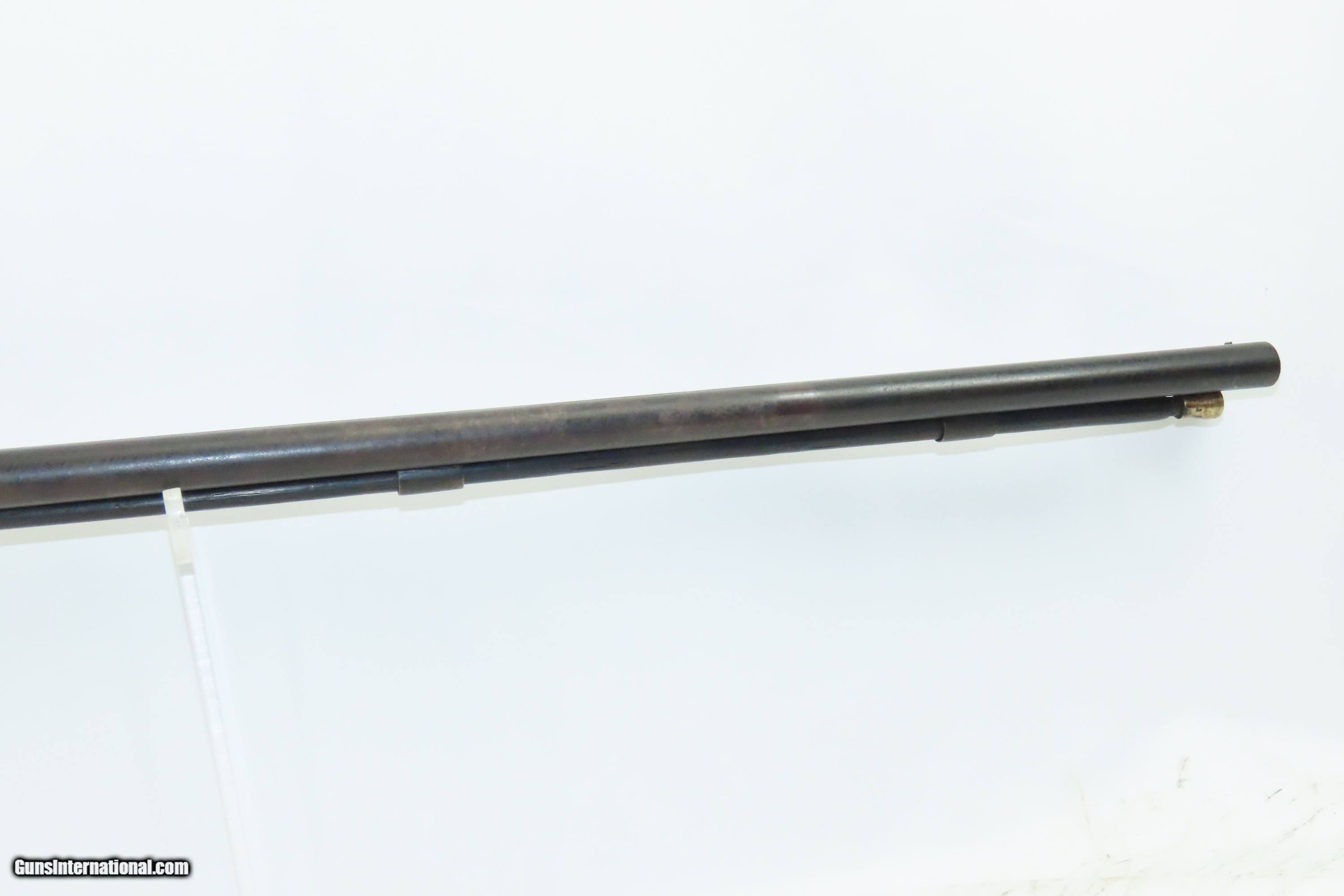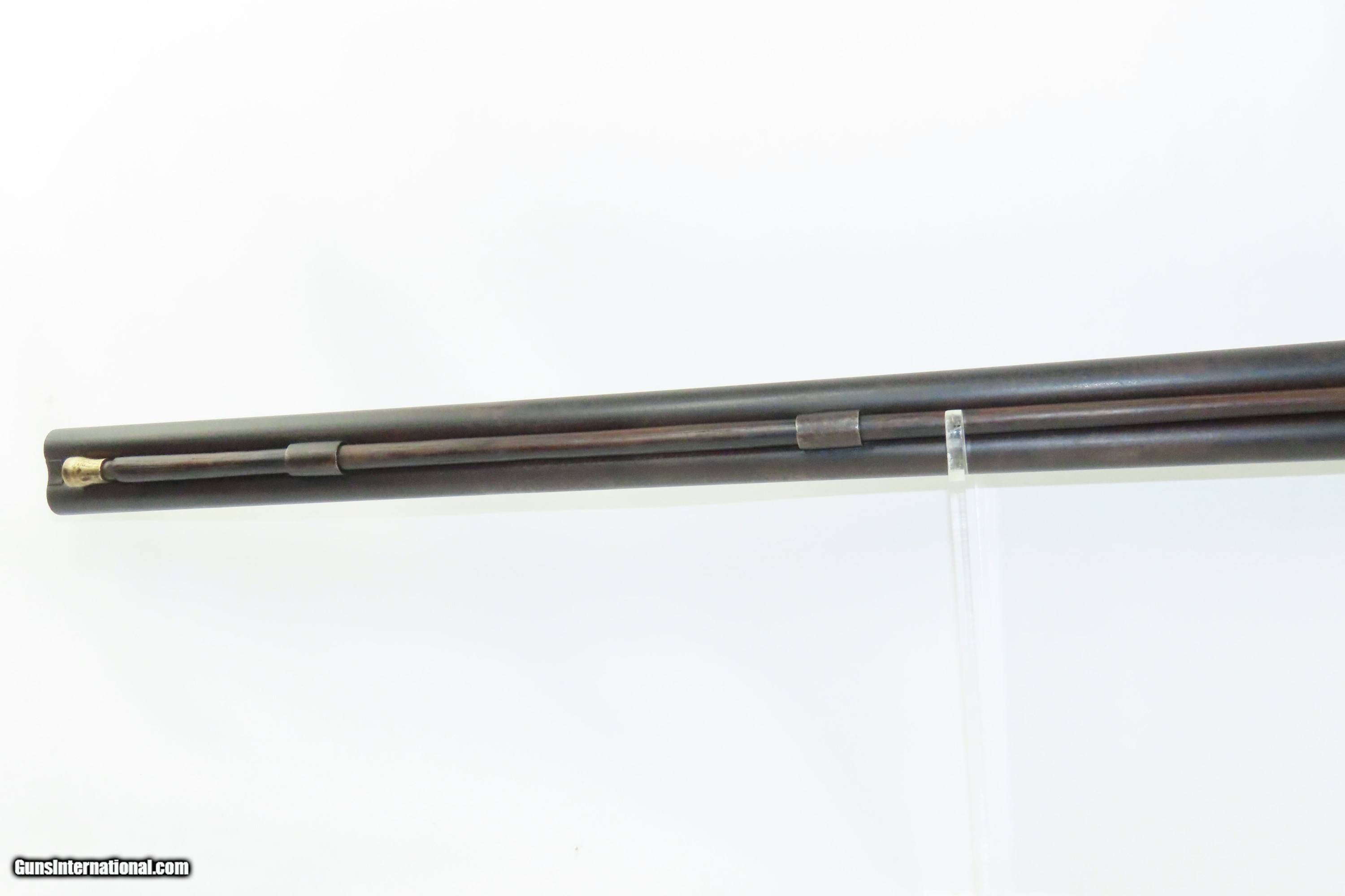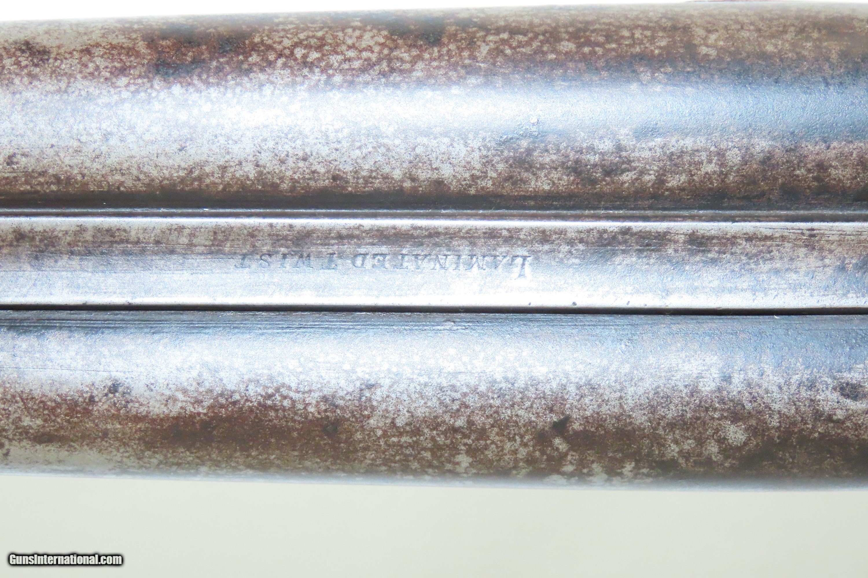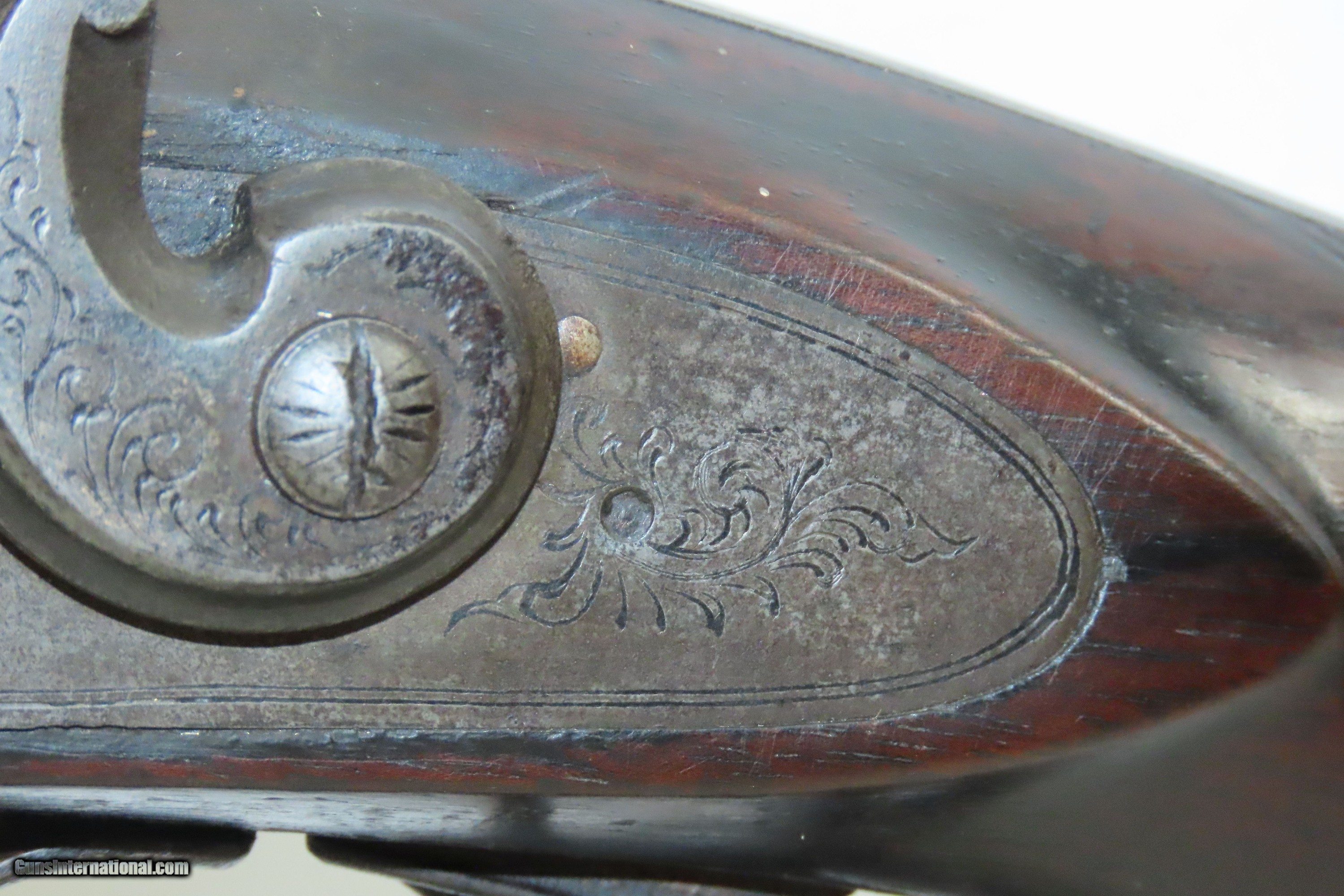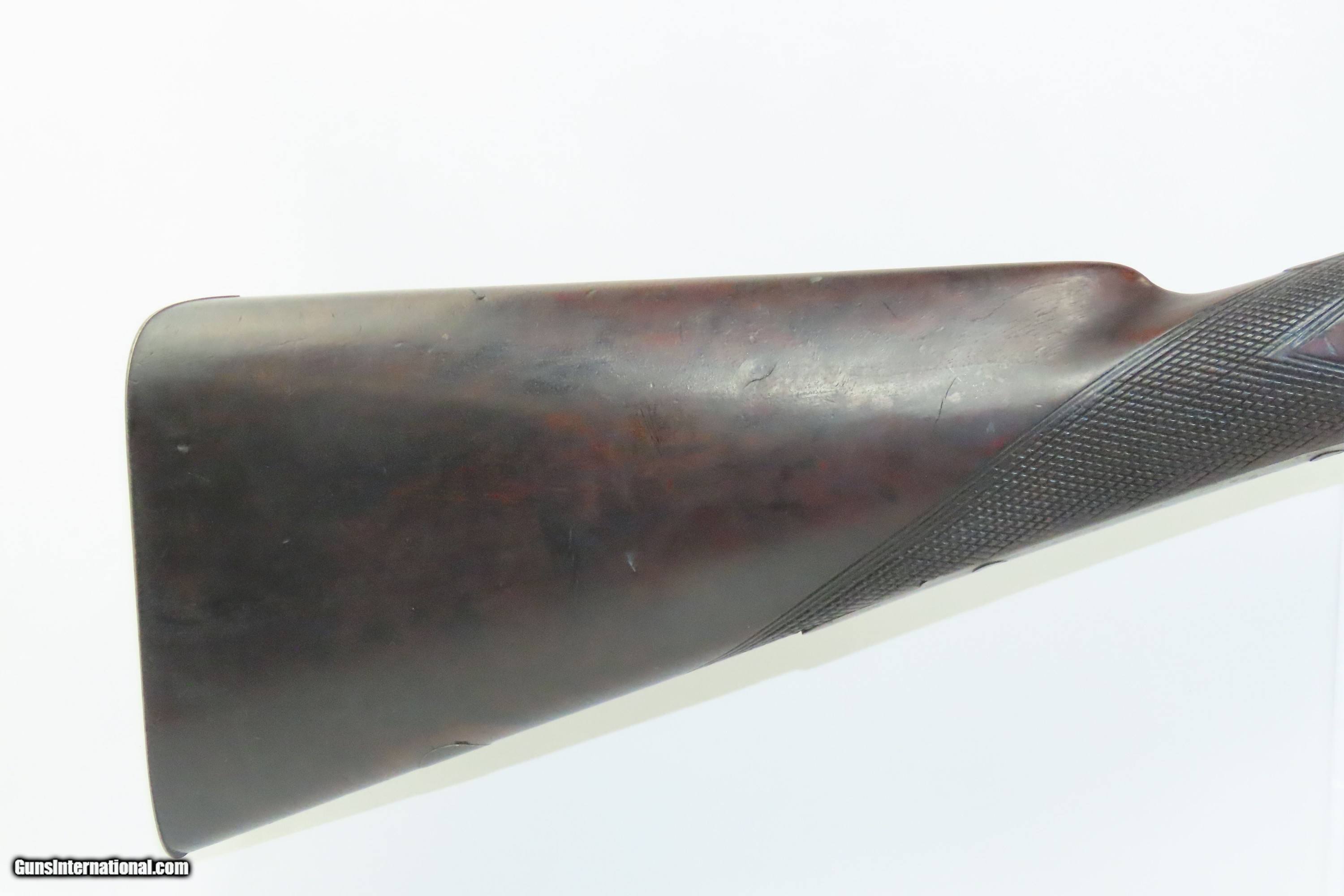 Description: Dog Head Hammers British PERIN GAFF c1860s Antique Double Barrel SHOTGUN British SxS Shotgun Imported to the United States Here we present an antique British Perin Gaff & Co. Marked Double Barrel Side by Side Percussion Shotgun, manufactured circa the early to mid-1860s in Birmingham, England. Perin and Gaff Manufacturing Company operated in Cincinnati, Ohio from 1861-1884. They were importers and dealers, so there was a wide variety of wares that show up with their markings. This shotgun could likely have been imported to the U.S. just prior to the American Civil War. During this era, there were many English and Belgian gunmakers who were capitalizing on the eager markets in the United States. This 14 gauge shotgun was made in a great gauge to go after high flying geese and ducks. Its mid-length 33-7/8 inch barrel made for easy hunting in the dense woods or traipsing through the marsh looking for ducks and geese. This would have been a staple of most homesteads hanging over the mantle during the tumultuous times of the mid-1800s. Its primary purpose would have been for putting food on the table or preventing unwanted aggression against the homestead. The overall condition is good. Some original twist pattern remains on the barrels with a dark gray patina throughout. The hammers are uniquely cast with dog heads. The actions are strong. The bores are smooth and patinated. The stock shows use and remains solid throughout. Own the original! This is a legitimate antique and not a reproduction. Barrel: 33-7/8 inches. Caliber: 14 gauge Overall condition as seen in photos. Very Fast. Very Safe. FREE SHIPPING WORLDWIDE. Delivered directly to your door by express mail! Guaranteed AUTHENTIC & Includes CERTIFICATE OF AUTHENTICITY. ancestryguns $1200 #240161 SOLD Antique: Yes |