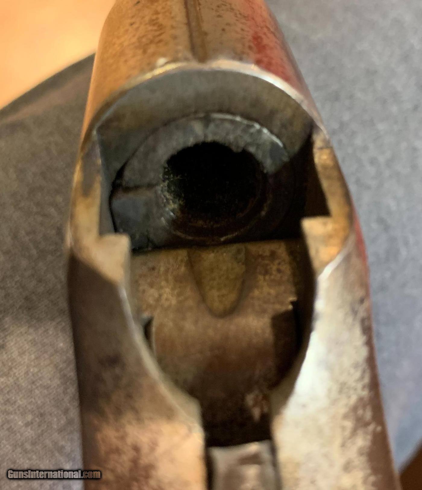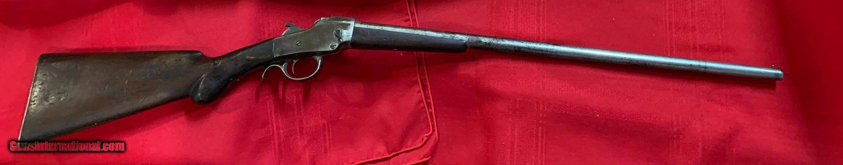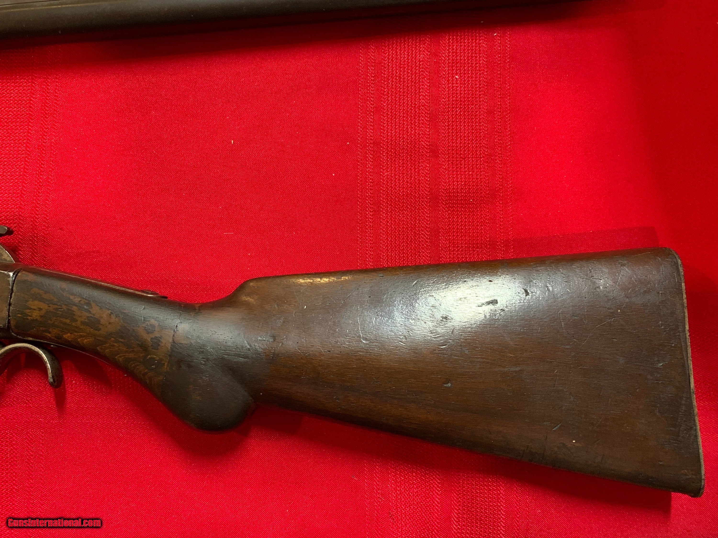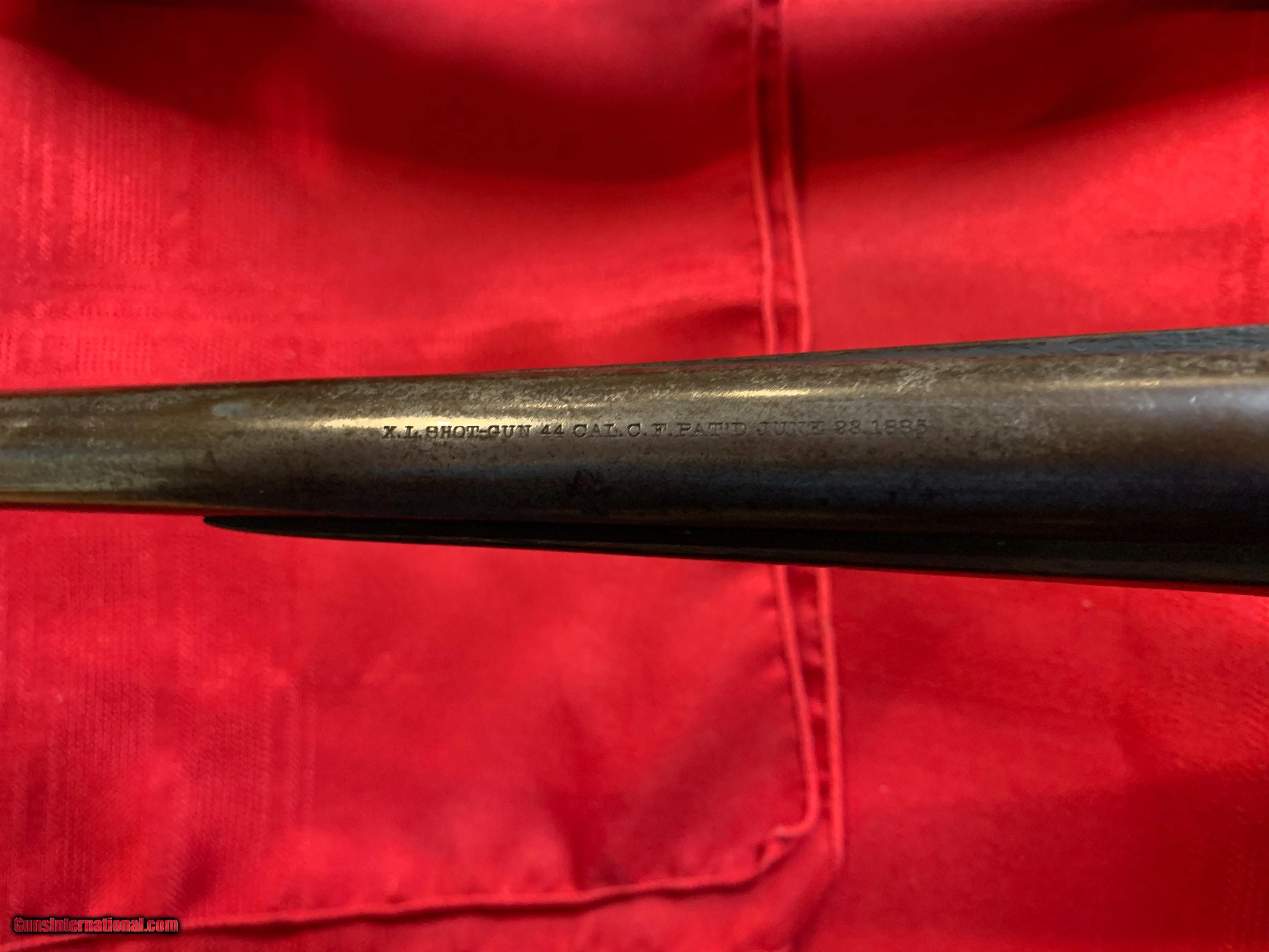 Description: Unmarked 44 XL shotgun. Take down. Looks like an F&W switch barrel type gun. Barrel marked "X.L. SHOT-GUN 44 CAL.C.F. PAT'D JUNE 23, 1885". Stock repaired at wrist. Appears to have been 100% nickeled. Good bore and mechanics. SOLD Antique: Yes Shotgun Gauge: .410 Gauge |