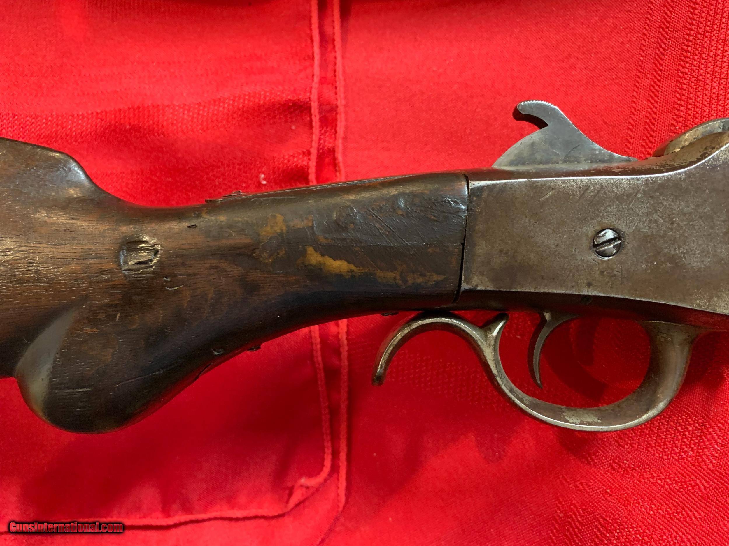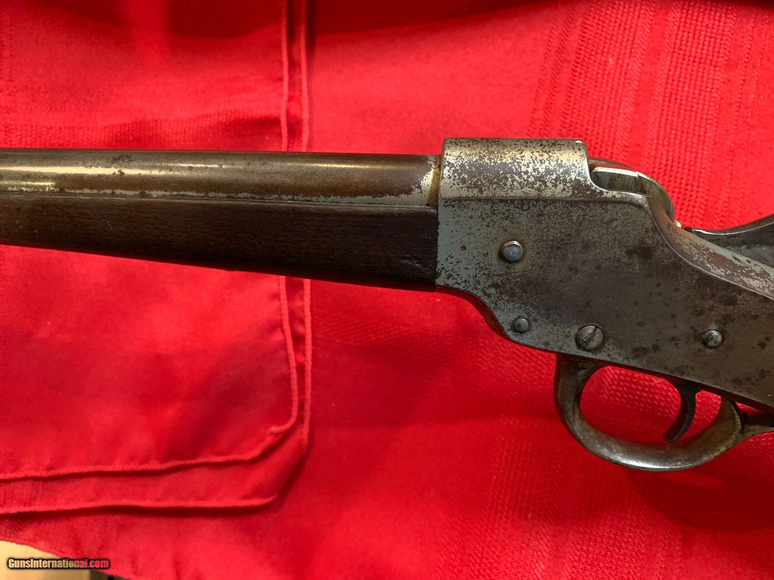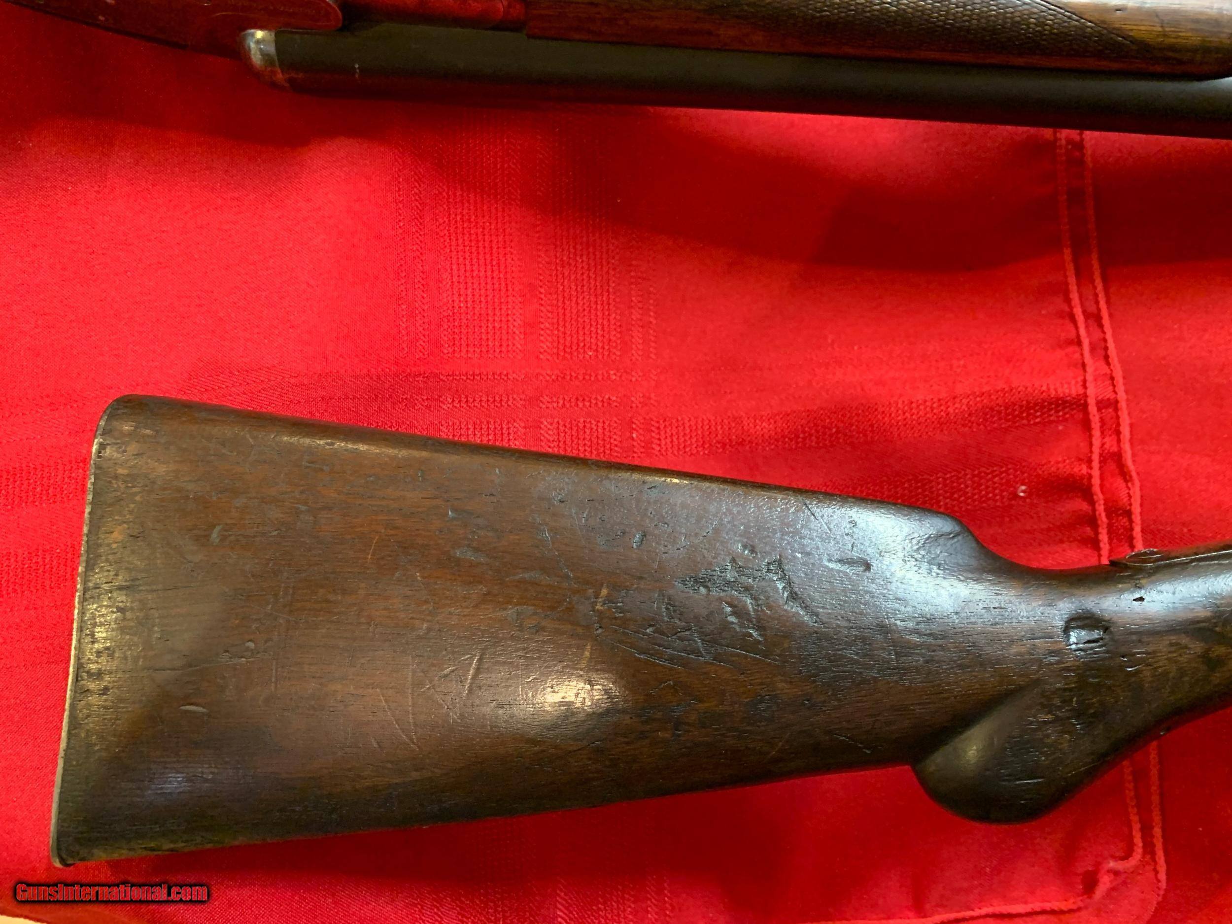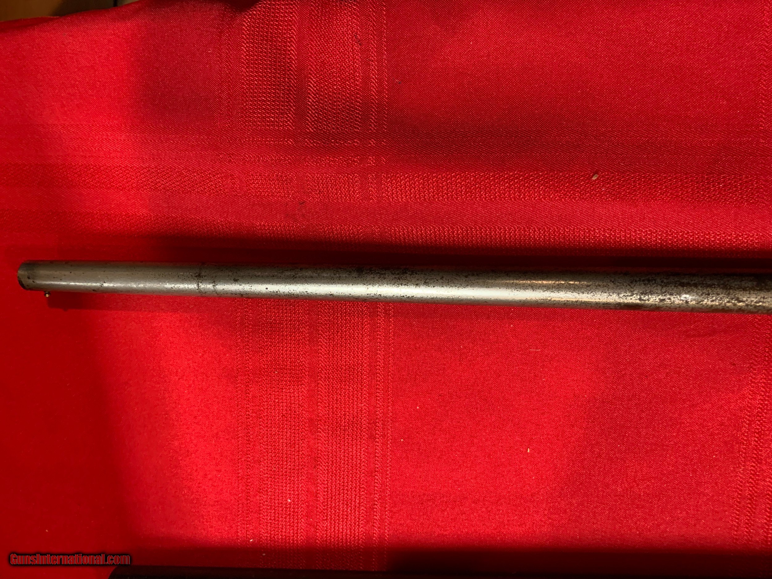 Description: Unmarked 44 XL shotgun. Take down. Looks like an F&W switch barrel type gun. Barrel marked "X.L. SHOT-GUN 44 CAL.C.F. PAT'D JUNE 23, 1885". Stock repaired at wrist. Appears to have been 100% nickeled. Good bore and mechanics. SOLD Antique: Yes Shotgun Gauge: .410 Gauge |