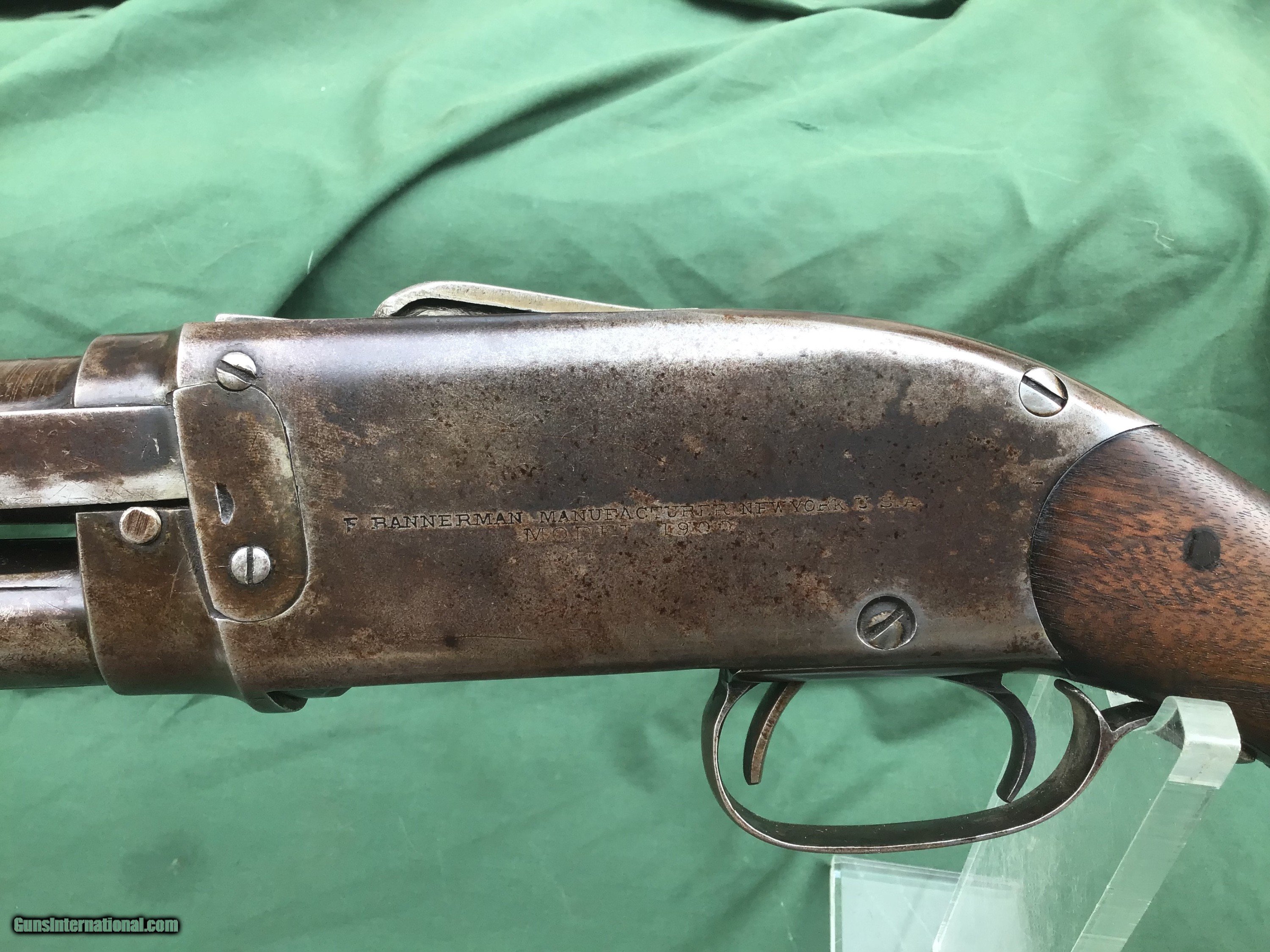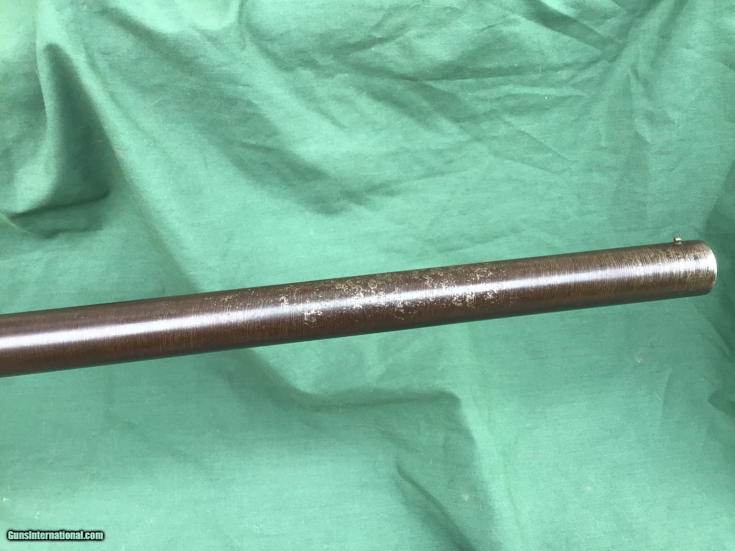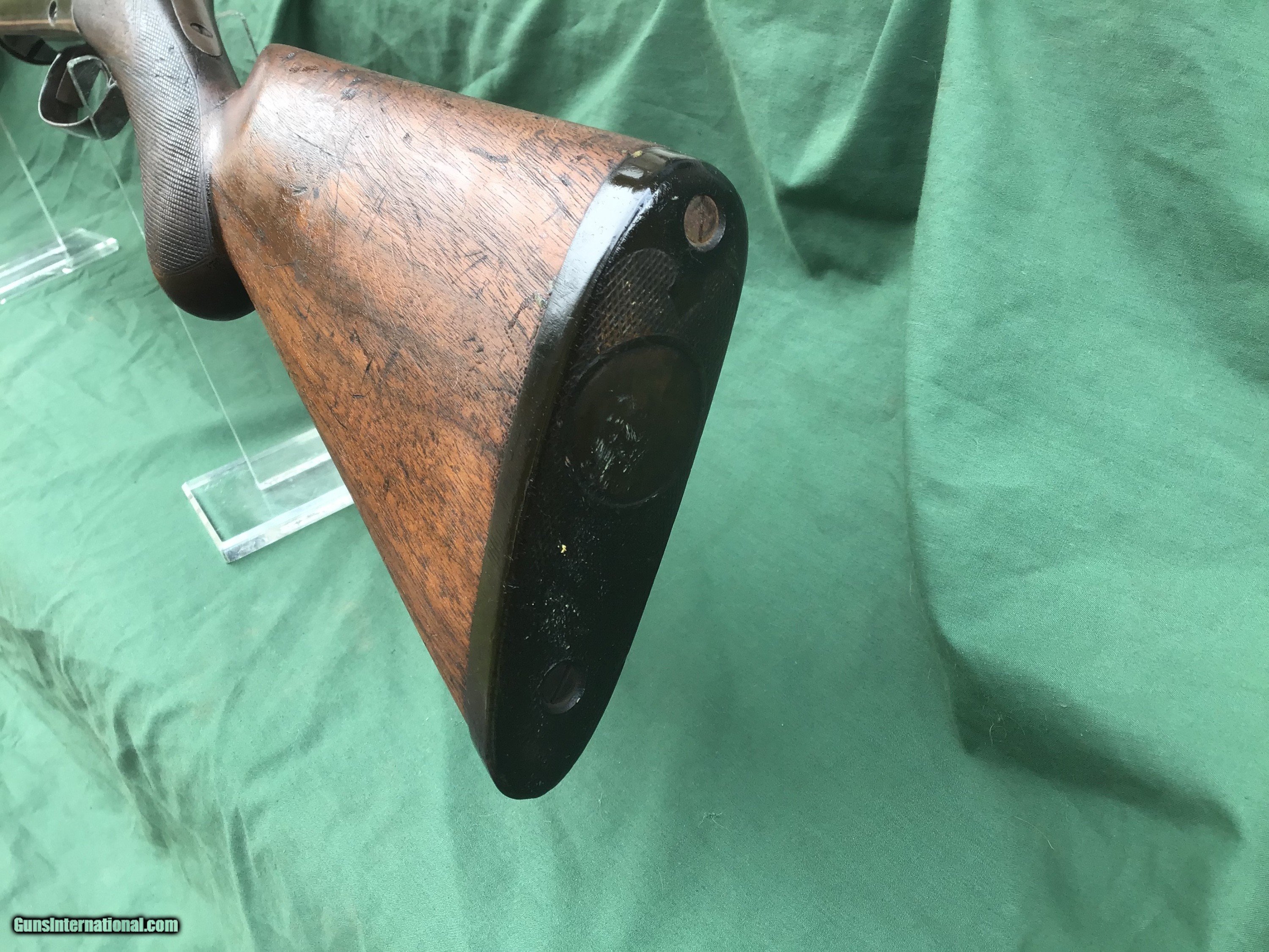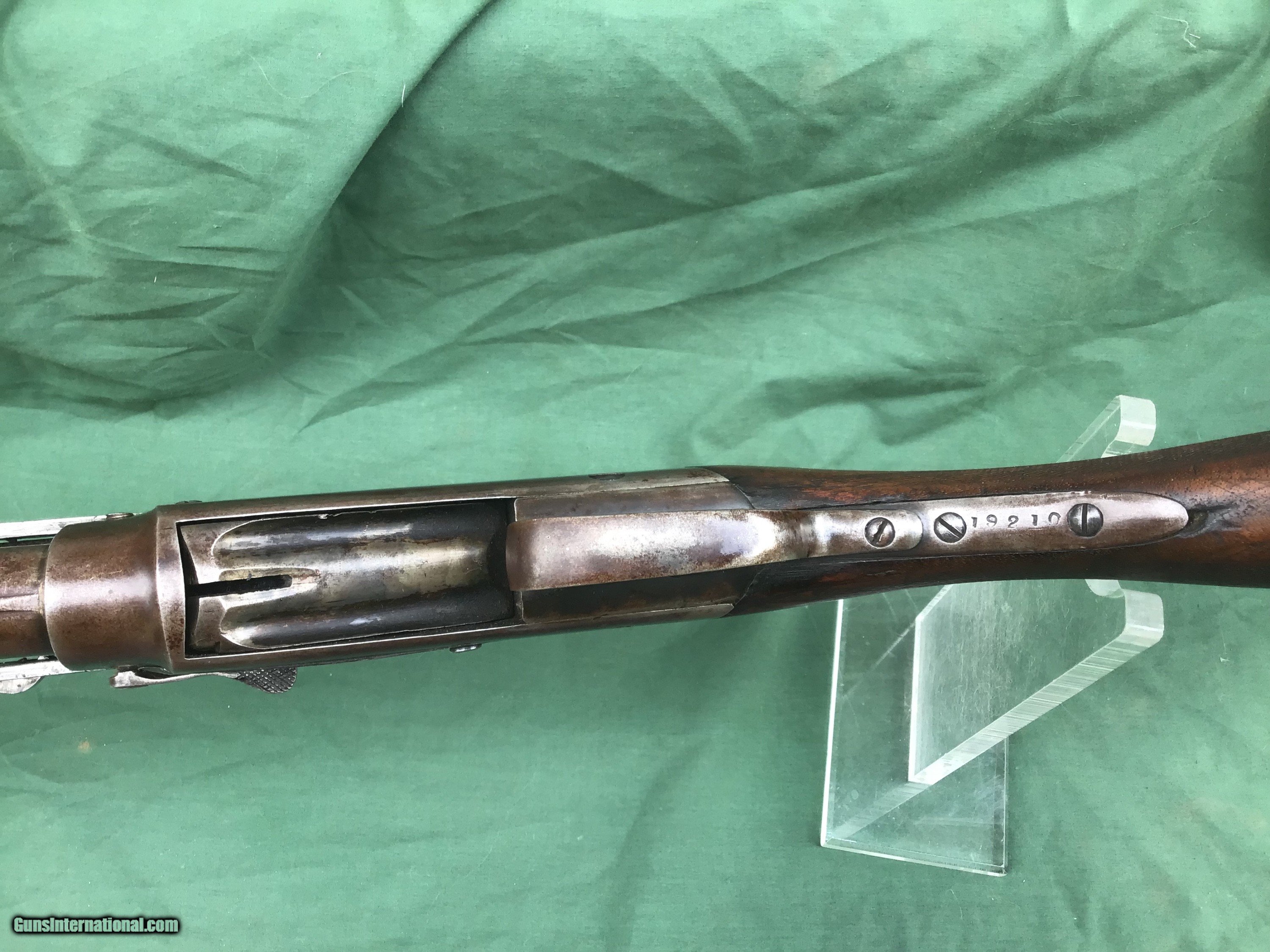 Description: Francis Bannerman Shotgun. 12 gauge with 30" Damascus Barrel. Takedown version. Serial number 19210. Very nice bore. Action functions nicely. I have not tried to take apart. Both forend and buttstock are in good condition, checkered buttstock has a nicely down repair visible on left hand side of wrist (see pictures). Magazine plug is made of brass and has the initials CW inscribed in it (see pic). Barrel retains 80% of it's brown finish on the Damascus pattern. Receiver retains 55-60% of it's original blue. Barrel near muzzle end is showing an area of light pitting (see pic). There is some very interesting articles on how Bannerman acquired the rights from Spencer on this shotgun. Also some good reading on the battle between Winchester and Bannerman. Very rare model shotgun and worthy to be part of any shotgun collectors collection. Must ship to a FFL or Curio and Relics license holder. This shotgun is not warranted safe to shoot because of it's Damascus twist barrel. Sold as a Collectors Item only. Please feel free to contact me with any questions. SOLD Curio/Relic: Yes |