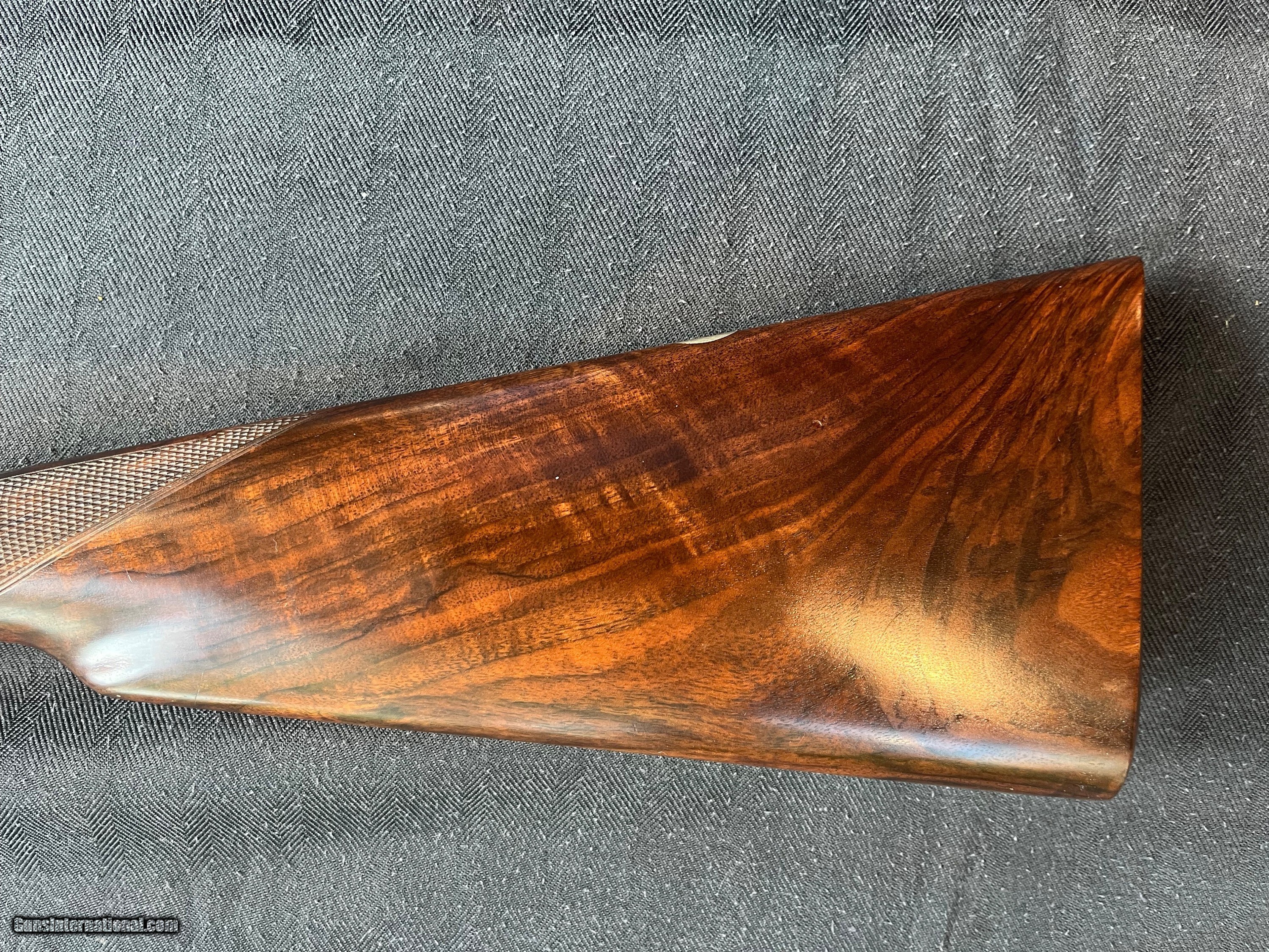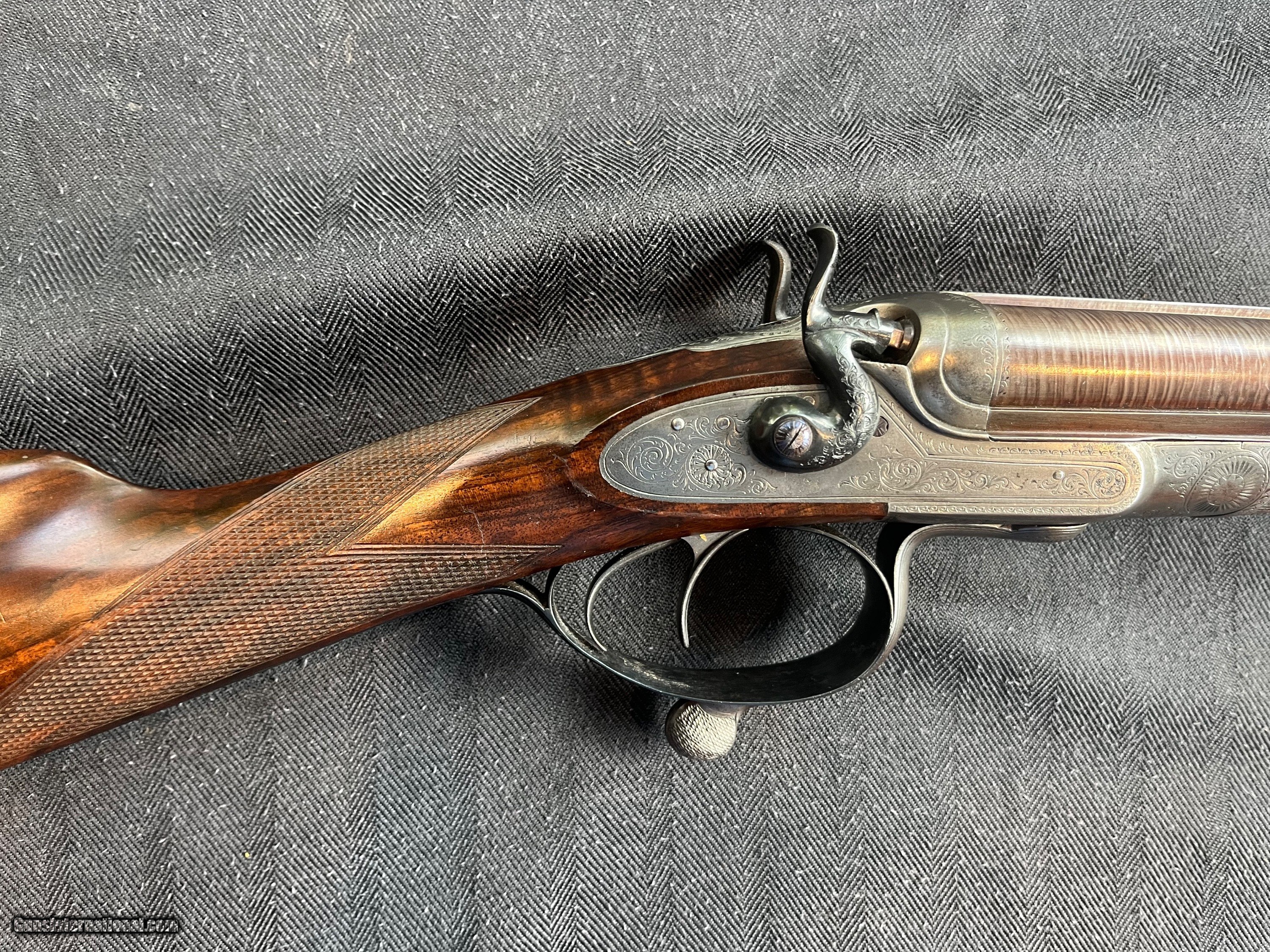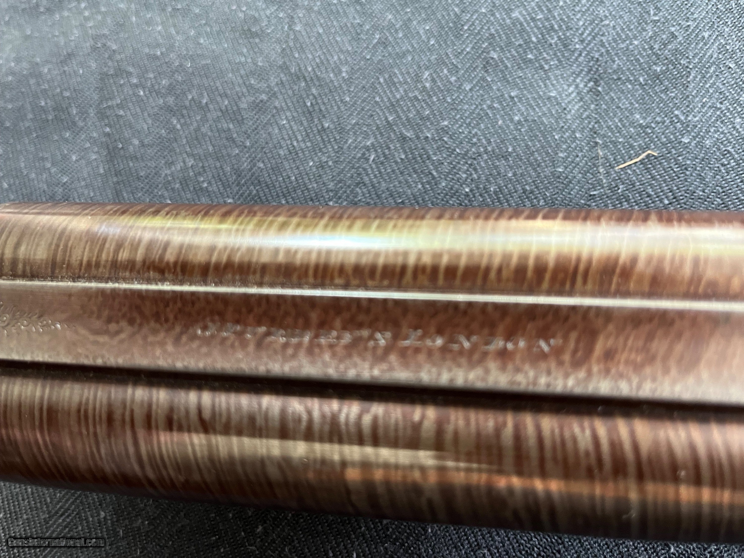 Description: James Purdue under lever hammer shotgun Circa 1870. Gun was restored and reproofed post 2005. Highly figured English walnut stock with very fine checkering to included the butt. reproofing indicates date and designates barrels as lined which I can not substantiate. Barrel length is 29". Proofed for 2 1/2" 16 Ga. Shells barrels have beautiful Damascus pattern with se slight bore etching . includes fitted case with Purdey tools and 3 box's of custom low velocity shells to be shipped separately. $4595 SOLD Antique: Yes Shotgun Gauge: 16 Gauge Manufacturer: James Purdey Barrel Length: 29” Condition: Excellent Metal Condition: Excellent Wood Condition: Excellent Bore Condition: Some slight etching Barrel Type: Damascus Action: Underlever Triggers: Dual Fore End: Fine checkering/ engraved Butt Pad: Finely checkered Finish: French polished Manufacture Date: Circa 1870 Choke Left: Improved Choke Right: Improved Engraving: Fine scroll Case: Fitted Proof:Nitro: Yes 2005 reproofed Minimum Wall Thickness Left: .055 Minimum Wall Thickness Right: .056 |