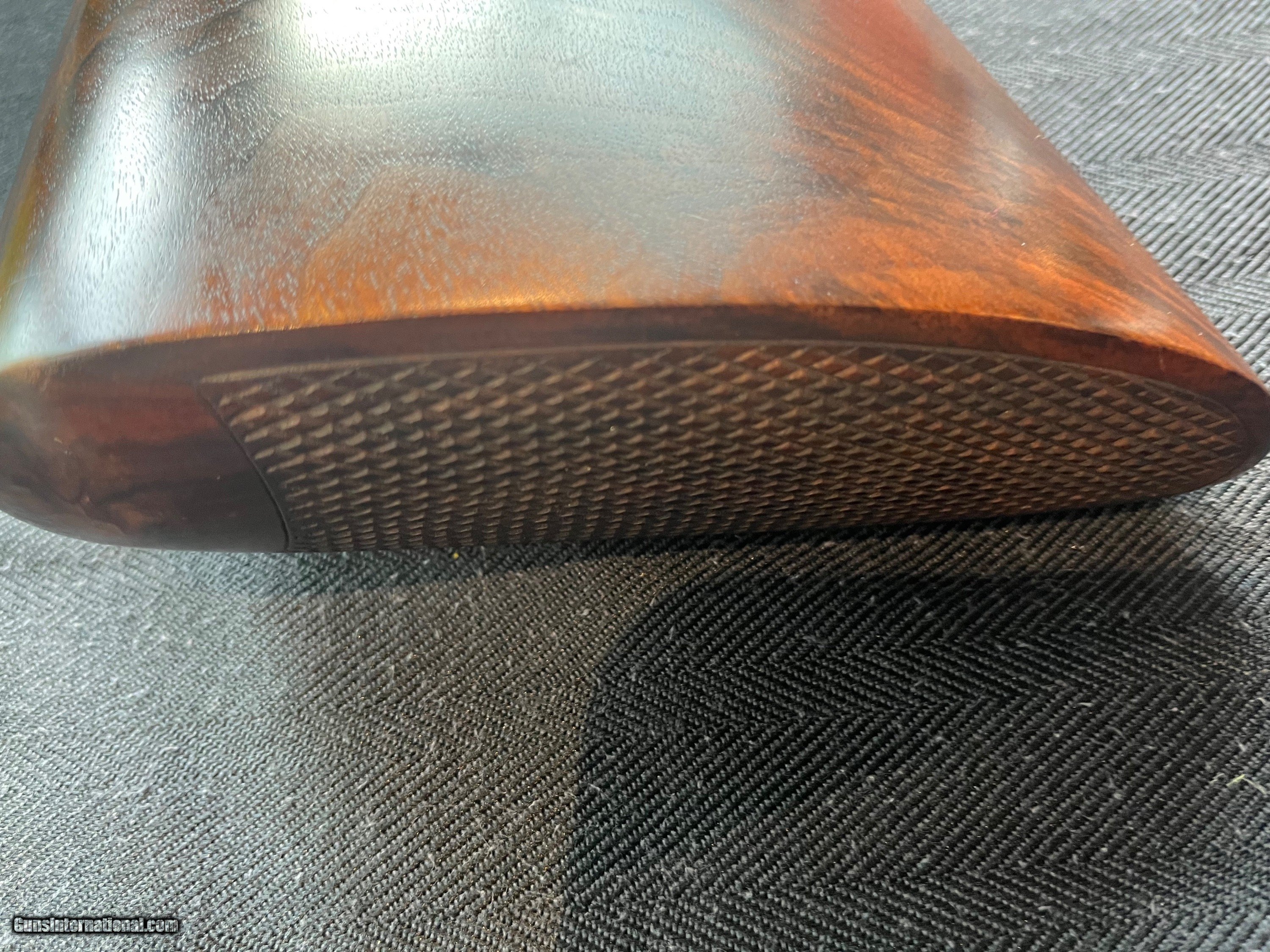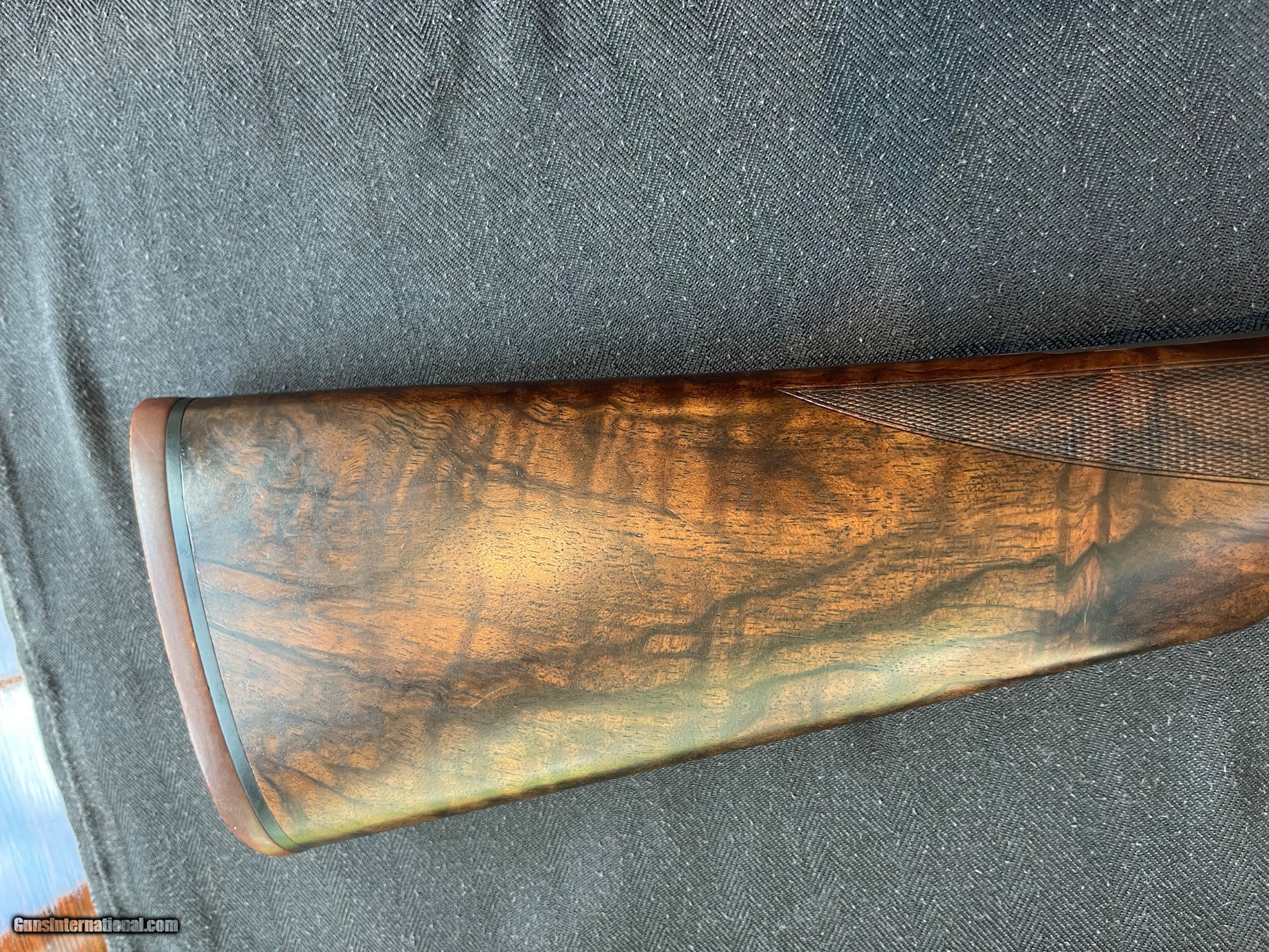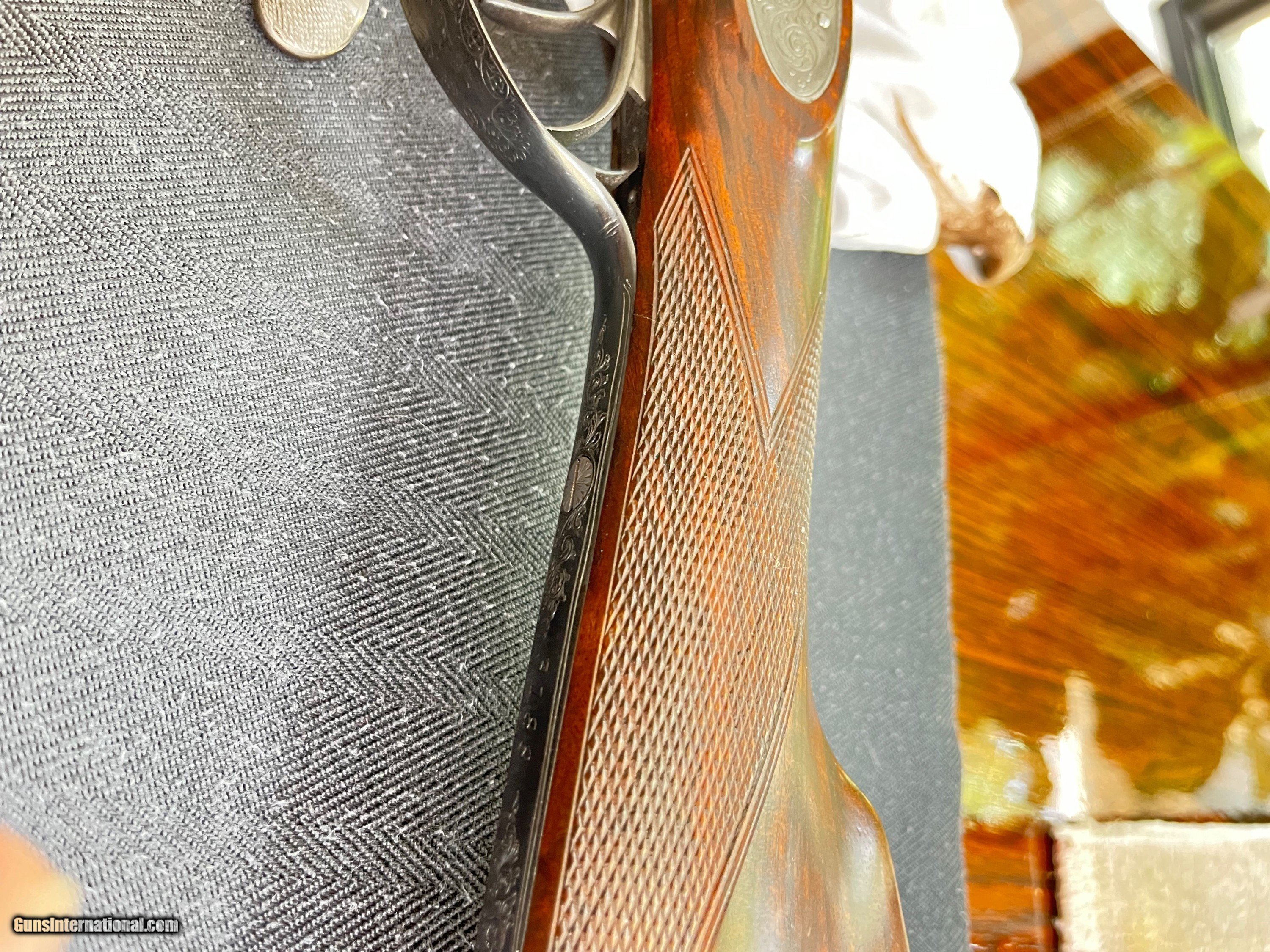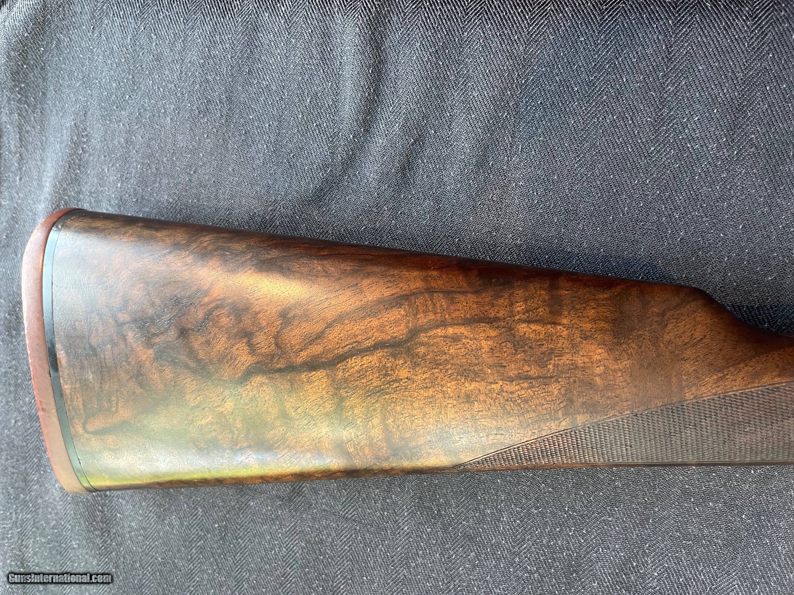Description: James Purdue under lever hammer shotgun Circa 1870. Gun was restored and reproofed post 2005. Highly figured English walnut stock with very fine checkering to included the butt. reproofing indicates date and designates barrels as lined which I can not substantiate. Barrel length is 29". Proofed for 2 1/2" 16 Ga. Shells barrels have beautiful Damascus pattern with se slight bore etching . includes fitted case with Purdey tools and 3 box's of custom low velocity shells to be shipped separately. $4595 SOLD Antique: Yes Shotgun Gauge: 16 Gauge Manufacturer: James Purdey Barrel Length: 29” Condition: Excellent Metal Condition: Excellent Wood Condition: Excellent Bore Condition: Some slight etching Barrel Type: Damascus Action: Underlever Triggers: Dual Fore End: Fine checkering/ engraved Butt Pad: Finely checkered Finish: French polished Manufacture Date: Circa 1870 Choke Left: Improved Choke Right: Improved Engraving: Fine scroll Case: Fitted Proof:Nitro: Yes 2005 reproofed Minimum Wall Thickness Left: .055 Minimum Wall Thickness Right: .056 |