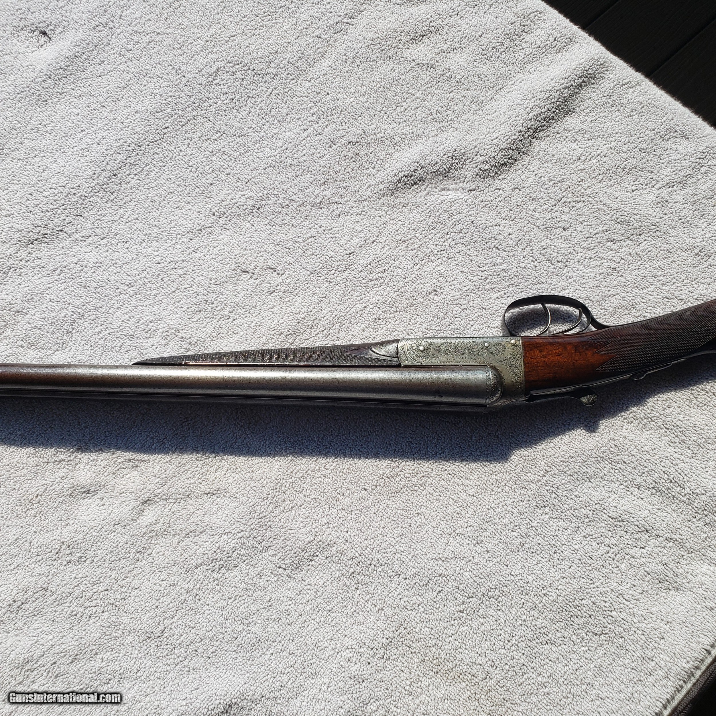 Description: British Gunmaker J.W. Tolley 16ga sxs 65mm (2 1/2") with case. JW Tolley began in 1832 and continued to at least 1916. They were gun & rifle makers and began in Birmingham, UK, but there is also record they were in London from 1883 to 1903. This is a very fine example of a Birmingham Box Lock with ejectors, and a well contrasted and figured stock. Ser #9017 registers to 1895 - 1901 mfr. at 59 New Bond Street, London. Barrels NP - nitro proofed to 3 tons - Proof: LP/83 indicates 1983; 30" Damascus w/ 3rd fastener; swamped rib, ejectors, Anson & Deeley BLE. Rt barrel .663 bore, choke .645 (.018 - IM) Wall thickness varies .025-.030 ; Left barrel .673 bore, choke .643 (.030 - Full) Wall thickness varies .023-.025 ; 15-1/4 LOP; 1 1/2" DAC; 2" DAH, Leather butt pad. Must ship to FFL or C&R holder. Shipping and full insurance appx $75 from my FFL. SOLD Curio/Relic: Yes Antique: Yes Shotgun Gauge: 16 Gauge |
