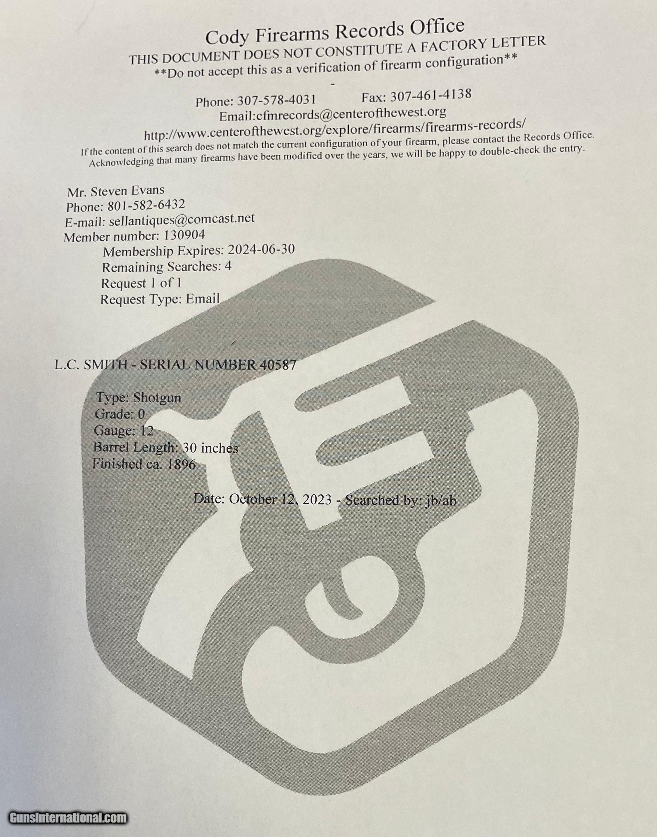 Description: This gun was built in 1896 so it was meant to use black powder. As with all antique guns it should be checked by a competent gunsmith before firing. The wood appears to have had a coat of varnish added. The action works as it should and the bores are good. See photos for condition. SOLD Antique: Yes Manufacturer: L.C. Smith Model: Double Barrel Shotgun Serial Number: 40587 Barrel Length: 30 |